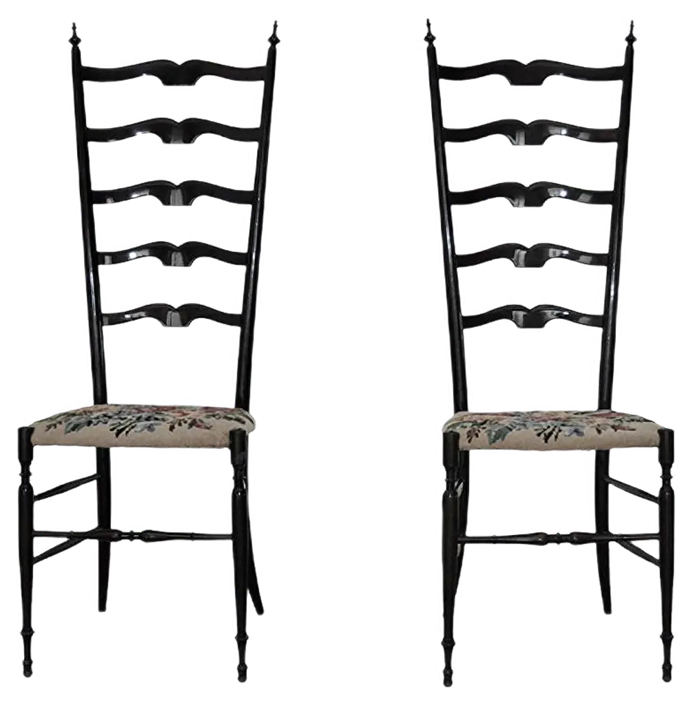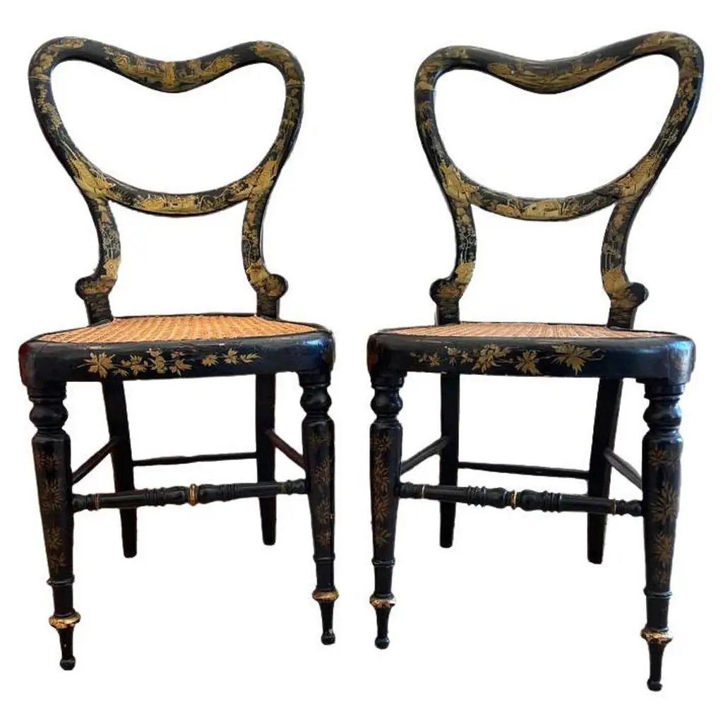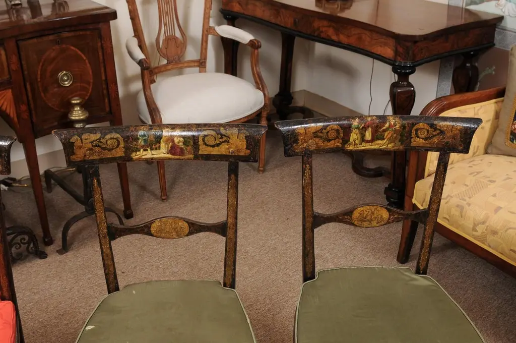 A pair of early 19th century black painted Italian side chairs with finely painted, beautiful scenes on top back rails, turned Legs, and rush seats. Each chair with a different courtyard scene, each one uniquely exquisite. Optional loose cushions in red and green upholstery available. Price is per pair.