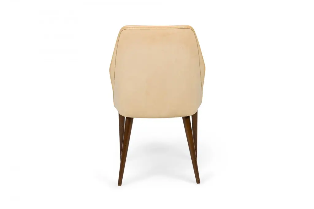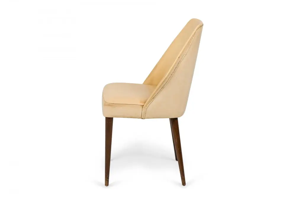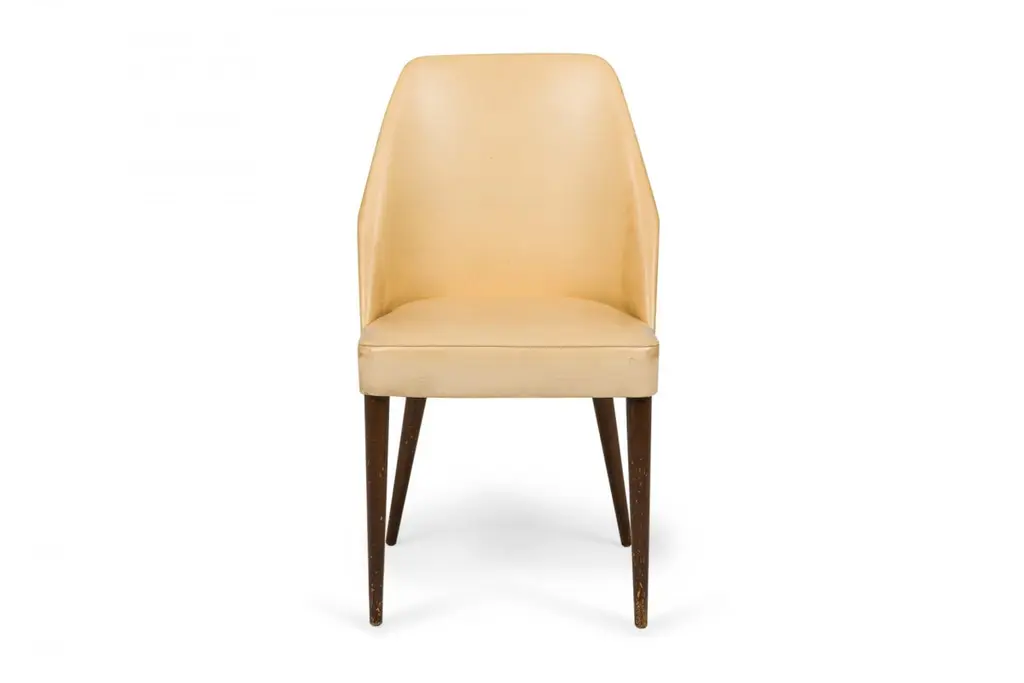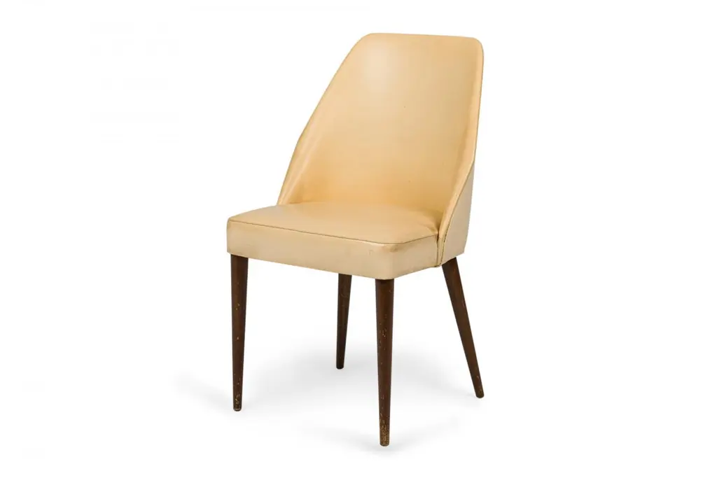 Pair of Mid-Century side / game chairs with beige leather upholstery and solid slightly tapered backs, resting on four tapered square walnut legs. (ICO PARISI FOR SINGER & SONS)(PRICED AS Pair)(Similar pieces: DUF0505B)Chips and scuffs to finish on chair legs, discoloration to leather.