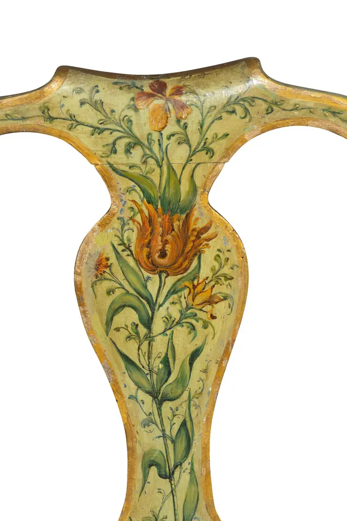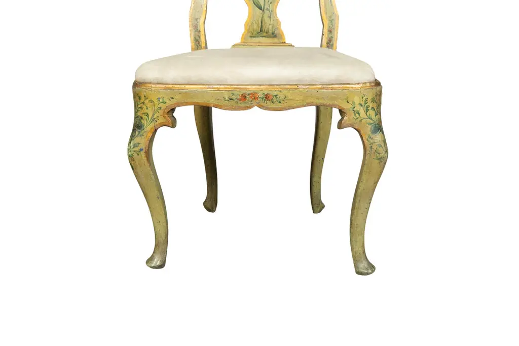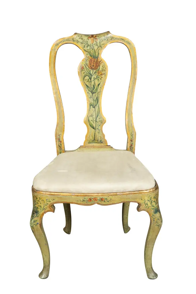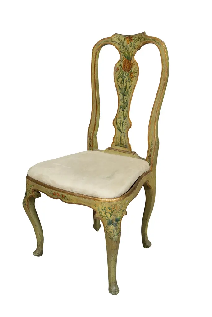 Nicely painted with shaped crest rail and vasiform splat ,drop in bowed seat and cabriole legs.