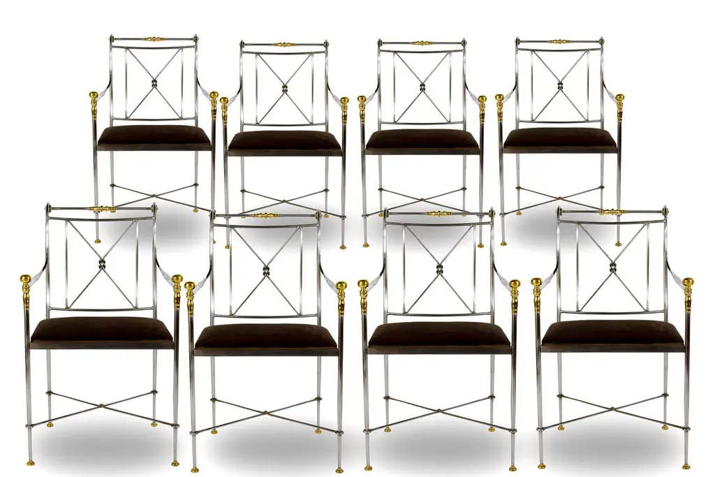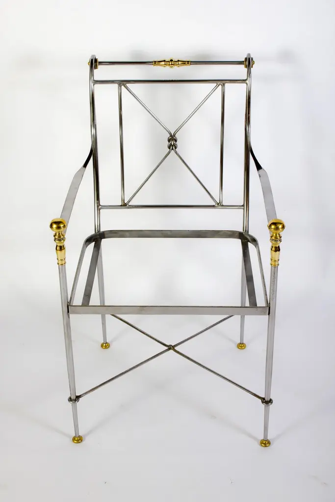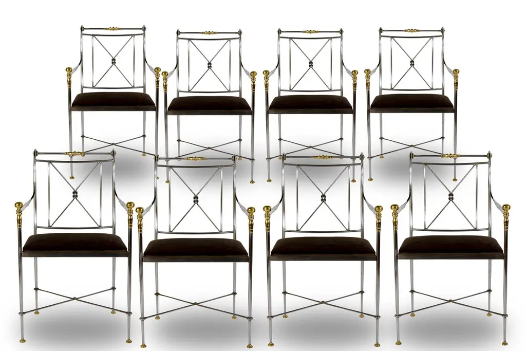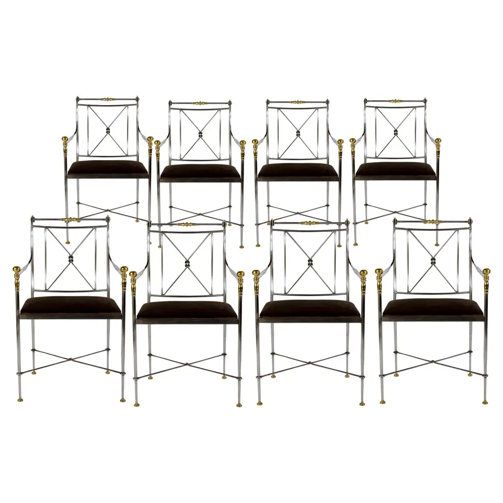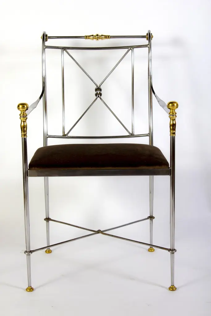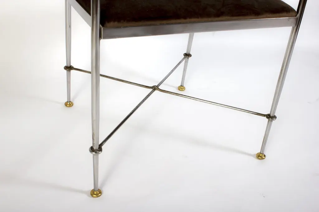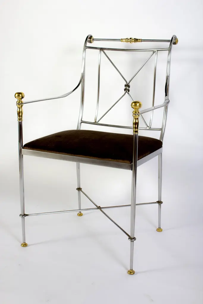 A pair of Italian steel and brass armchairs with dark velvet seats.Made in Italy and featuring polished steel, solid cast brass made by Orlandi . Each chair has been masterfully welded, crafted, absolutely wonderful proportions and is comfortable.Perfect in a dining room, terrace, living room or as occasional chairs.Eight items available.