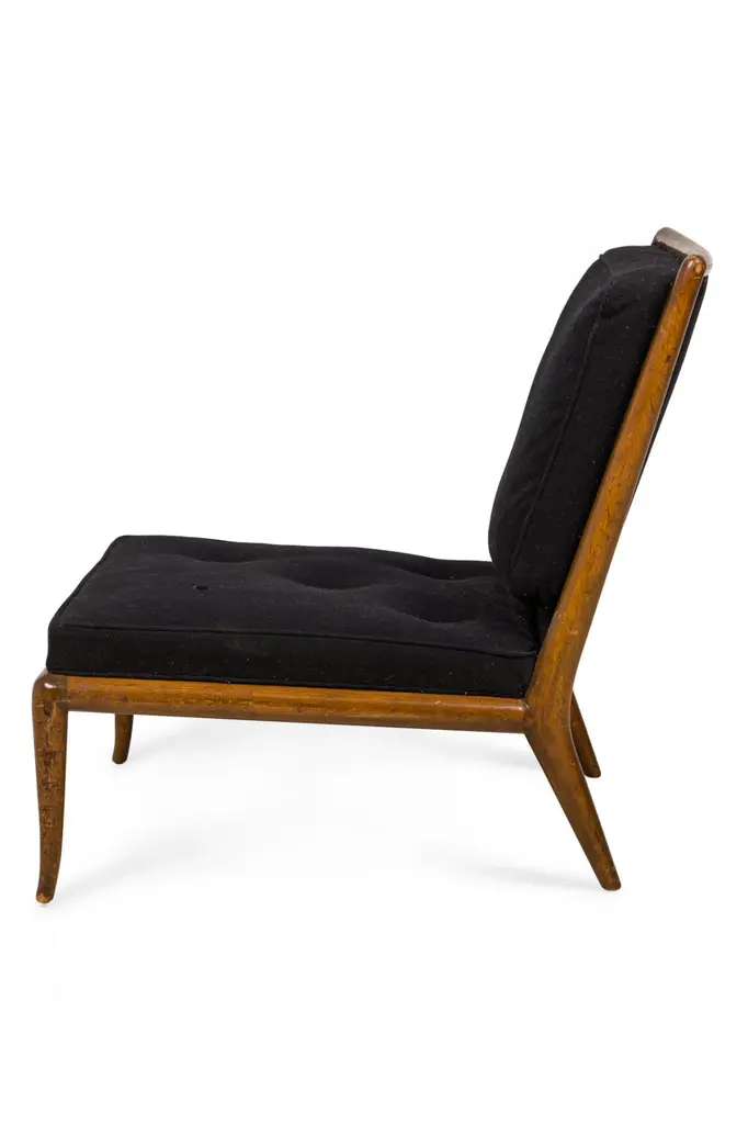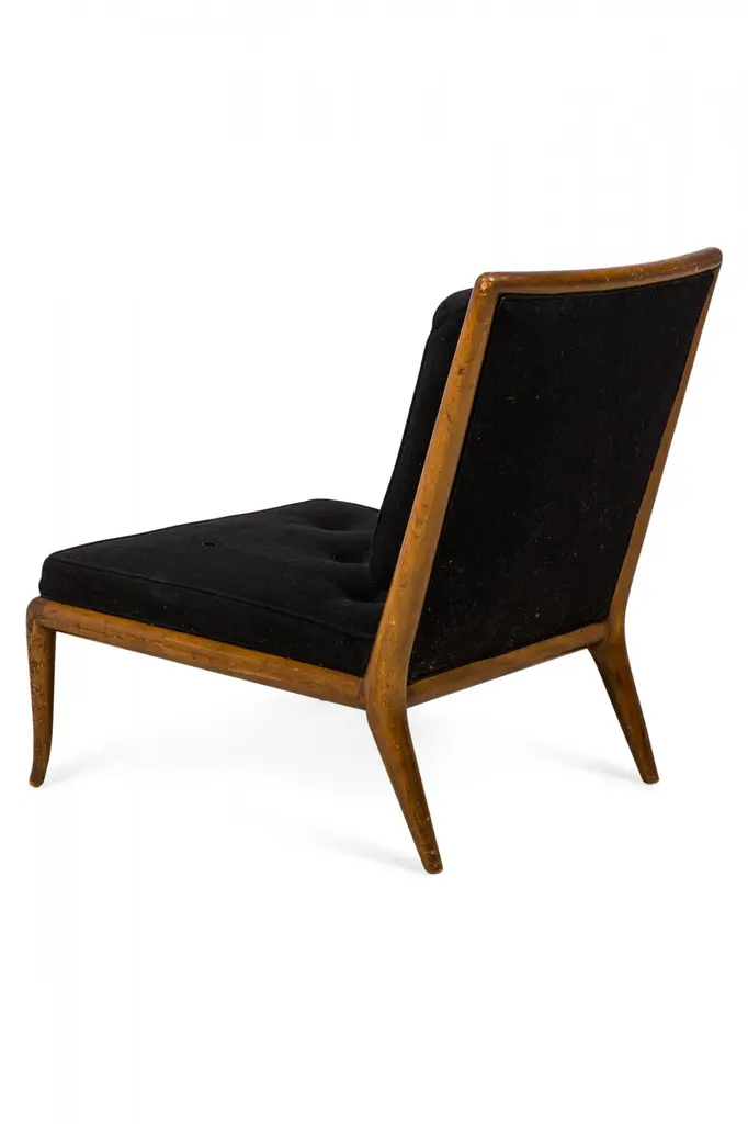 PAIR of Mid-Century slipper / side chairs with black fabric upholstery with button tufted detail, and a walnut frame, resting on four gently curved and tapered legs. (T.H. ROBSJOHN-GIBBINGS FOR WIDDICOMB)(Similar pieces: DUF0544, DUF0545)