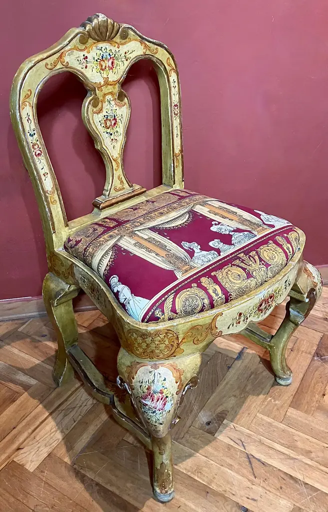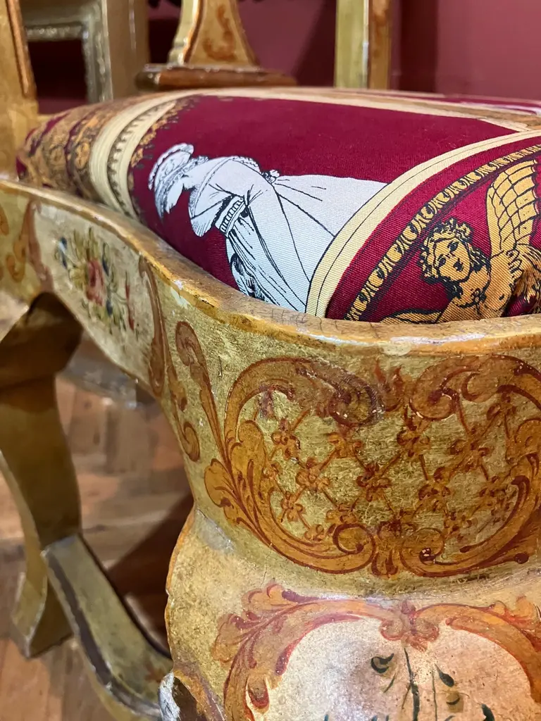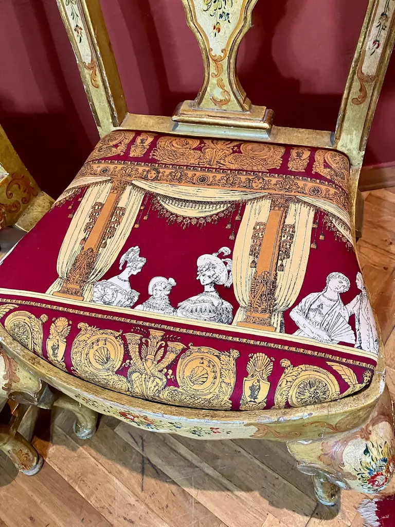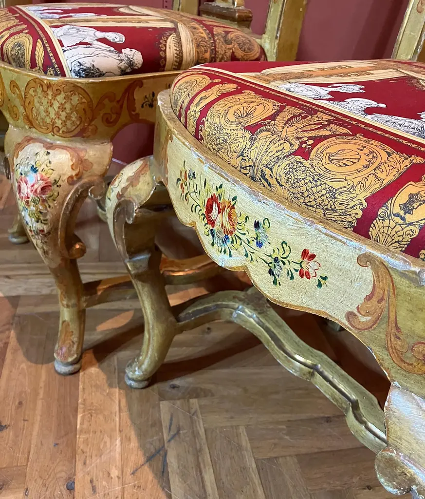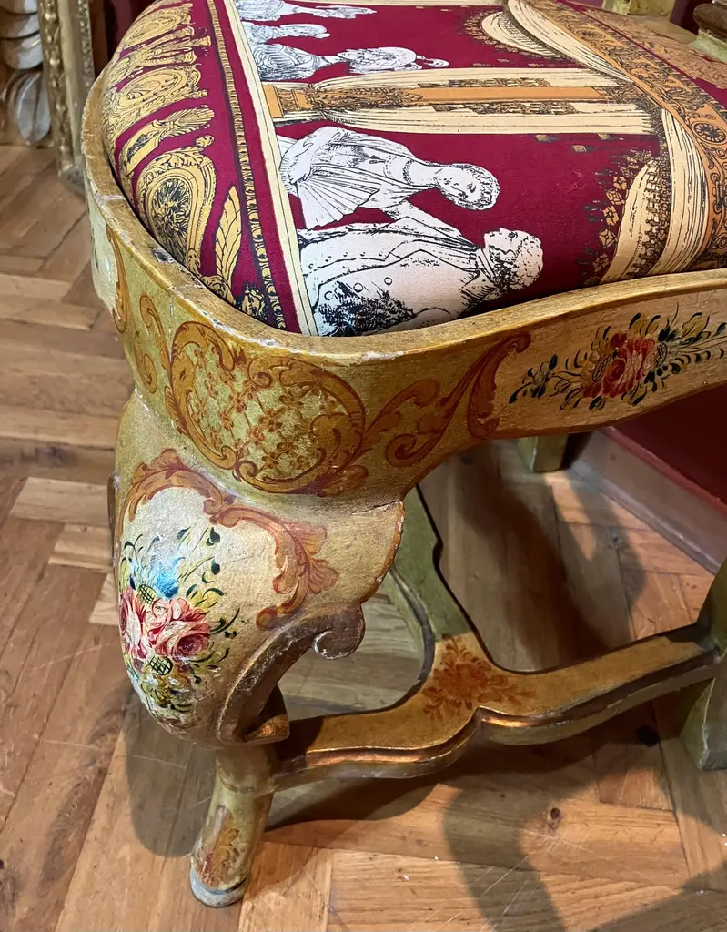 Indulge in the lavish charm Venetian craftsmanship with this exquisite pair of lacquered Rococo-style armchairs.Likely used as fireside seats, this charming seating set showcases the distinctive characteristics of Venetian lacquer work: comfortable, rounded seats; pierced backs; and cabriole legs. The rich lacquer finish, in tones of ochre, mustard yellow, and gold. This rich backdrop serves as a canvas for delightful hand-painted floral decorations throughout, bringing a touch of nature's beauty indoors. The gilded accents catch the light, adding a subtle sparkle that enhances the chairs' luxurious appeal.They are exquisitely upholstered in a vibrant Fornasetti fabric, displaying a striking mix of red, gold, black, and white, featuring neoclassical motifs and theatrical scenes that add a unique touch of contemporary flair to their antique charm.These exceptional pieces embody the pinnacle of Venetian craftsmanship and artistry.These versatile chairs would make a striking addition to any refined home. Consider placing them in a formal drawing room, where they can serve as elegant conversation pieces. Alternatively, they could bring a touch of grandeur to a master bedroom, creating a cozy reading nook by a window. For a truly unique display, position them in a grand entryway, where their intricate designs and rich colors can immediately captivate guests. They not only provide comfortable seating but also serve as a testament to your discerning taste and appreciation for historical artistry. Bring a touch of Venetian splendor into your home with these remarkable Rococo-style armchairs, and elevate your living space to new heights of elegance and sophistication.Dimensions: H. 80cm, W. 50cm, D. 39cm, Seat Height 43cm. In good condition with original patina and minor wear consistent with age and use.Note: List price includes professional and customized wooden crate cost