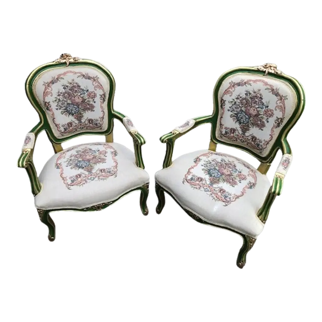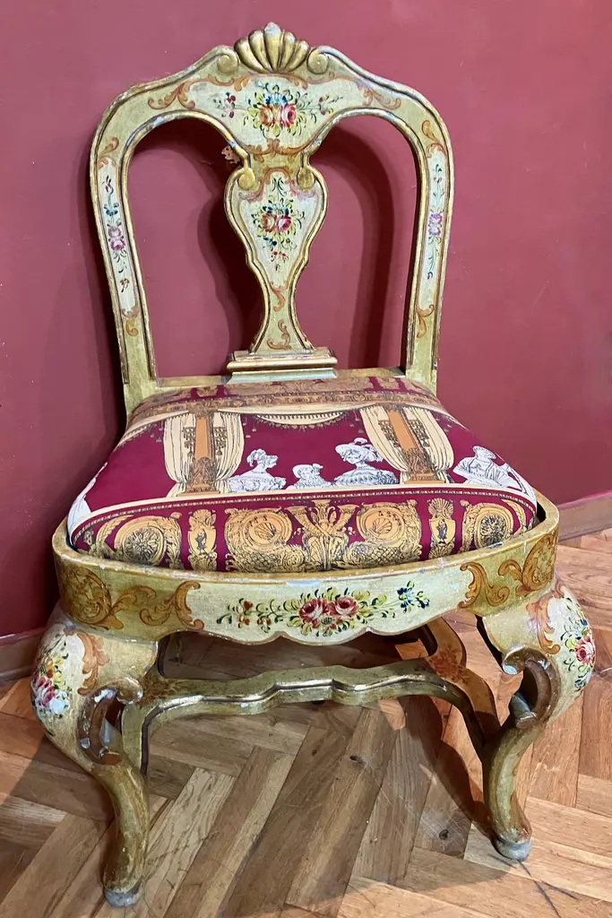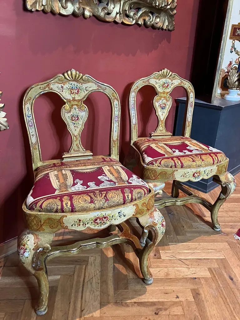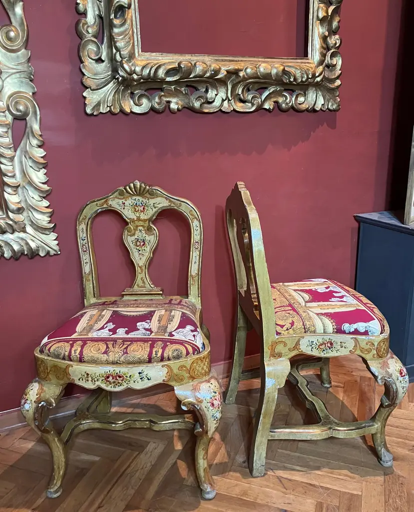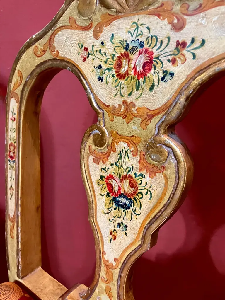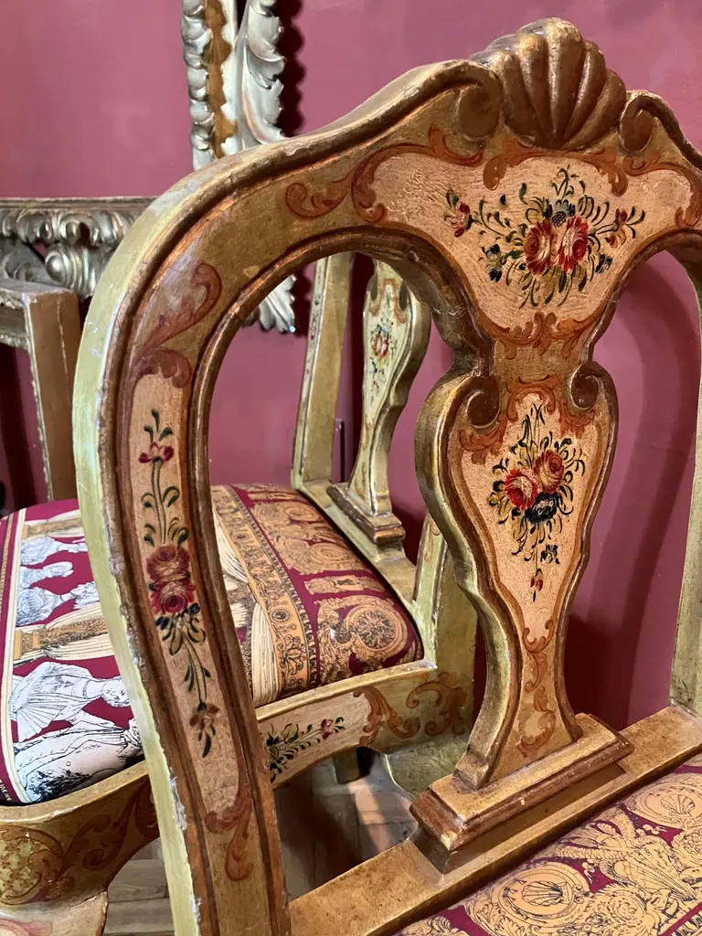 Indulge in the lavish charm Venetian craftsmanship with this exquisite pair of lacquered Rococo-style armchairs.Likely used as fireside seats, this charming seating set showcases the distinctive characteristics of Venetian lacquer work: comfortable, rounded seats; pierced backs; and cabriole legs. The rich lacquer finish, in tones of ochre, mustard yellow, and gold. This rich backdrop serves as a canvas for delightful hand-painted floral decorations throughout, bringing a touch of nature's beauty indoors. The gilded accents catch the light, adding a subtle sparkle that enhances the chairs' luxurious appeal.They are exquisitely upholstered in a vibrant Fornasetti fabric, displaying a striking mix of red, gold, black, and white, featuring neoclassical motifs and theatrical scenes that add a unique touch of contemporary flair to their antique charm.These exceptional pieces embody the pinnacle of Venetian craftsmanship and artistry.These versatile chairs would make a striking addition to any refined home. Consider placing them in a formal drawing room, where they can serve as elegant conversation pieces. Alternatively, they could bring a touch of grandeur to a master bedroom, creating a cozy reading nook by a window. For a truly unique display, position them in a grand entryway, where their intricate designs and rich colors can immediately captivate guests. They not only provide comfortable seating but also serve as a testament to your discerning taste and appreciation for historical artistry. Bring a touch of Venetian splendor into your home with these remarkable Rococo-style armchairs, and elevate your living space to new heights of elegance and sophistication.Dimensions: H. 80cm, W. 50cm, D. 39cm, Seat Height 43cm. In good condition with original patina and minor wear consistent with age and use.Note: List price includes professional and customized wooden crate cost