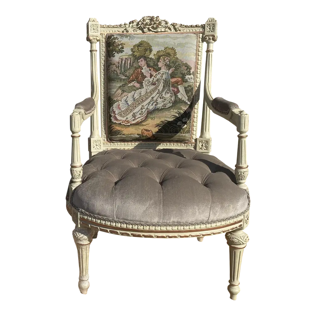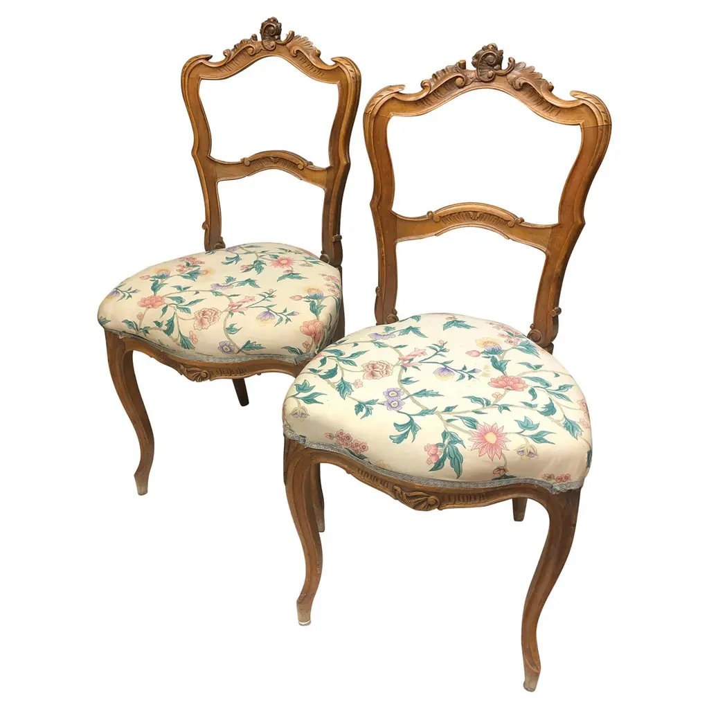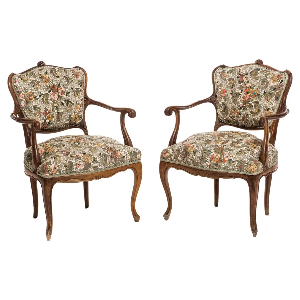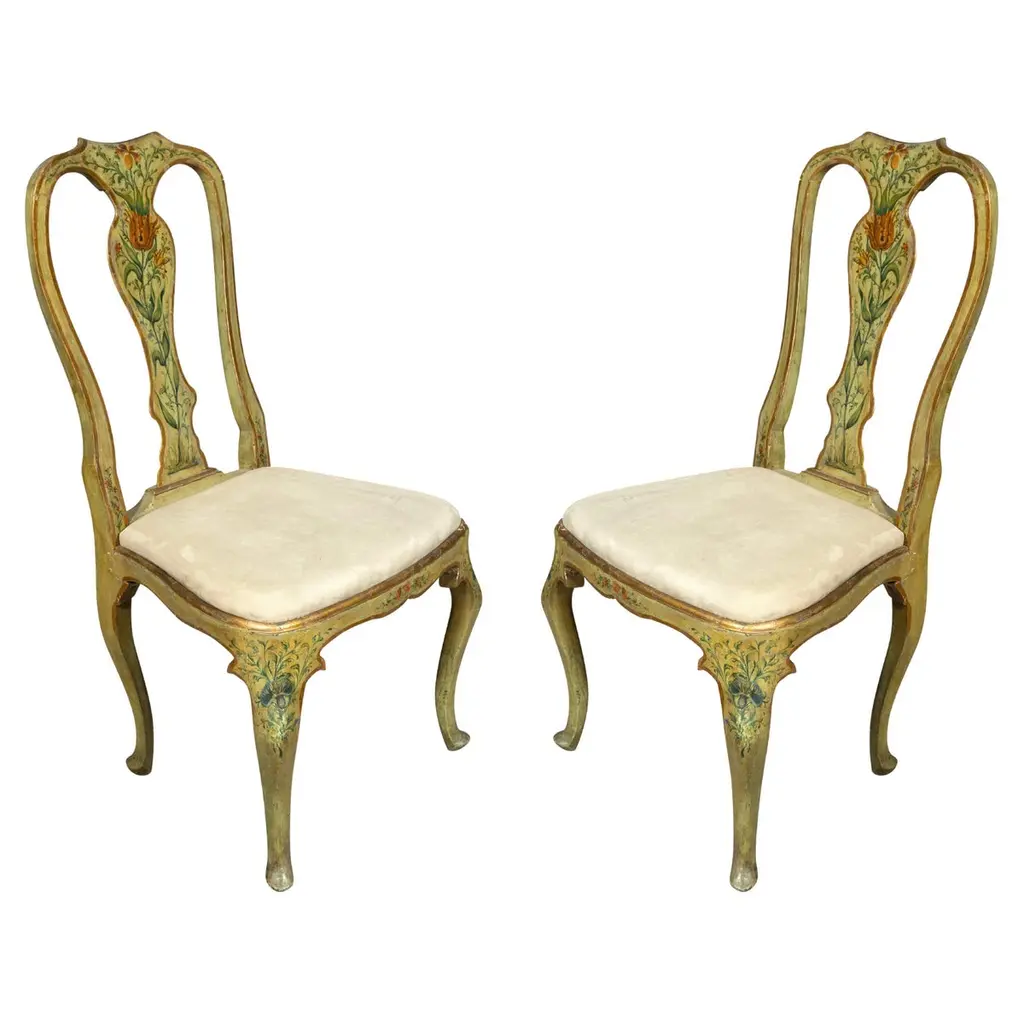 Indulge in the lavish charm Venetian craftsmanship with this exquisite pair of lacquered Rococo-style armchairs.Likely used as fireside seats, this charming seating set showcases the distinctive characteristics of Venetian lacquer work: comfortable, rounded seats; pierced backs; and cabriole legs. The rich lacquer finish, in tones of ochre, mustard yellow, and gold. This rich backdrop serves as a canvas for delightful hand-painted floral decorations throughout, bringing a touch of nature's beauty indoors. The gilded accents catch the light, adding a subtle sparkle that enhances the chairs' luxurious appeal.They are exquisitely upholstered in a vibrant Fornasetti fabric, displaying a striking mix of red, gold, black, and white, featuring neoclassical motifs and theatrical scenes that add a unique touch of contemporary flair to their antique charm.These exceptional pieces embody the pinnacle of Venetian craftsmanship and artistry.These versatile chairs would make a striking addition to any refined home. Consider placing them in a formal drawing room, where they can serve as elegant conversation pieces. Alternatively, they could bring a touch of grandeur to a master bedroom, creating a cozy reading nook by a window. For a truly unique display, position them in a grand entryway, where their intricate designs and rich colors can immediately captivate guests. They not only provide comfortable seating but also serve as a testament to your discerning taste and appreciation for historical artistry. Bring a touch of Venetian splendor into your home with these remarkable Rococo-style armchairs, and elevate your living space to new heights of elegance and sophistication.Dimensions: H. 80cm, W. 50cm, D. 39cm, Seat Height 43cm. In good condition with original patina and minor wear consistent with age and use.Note: List price includes professional and customized wooden crate cost