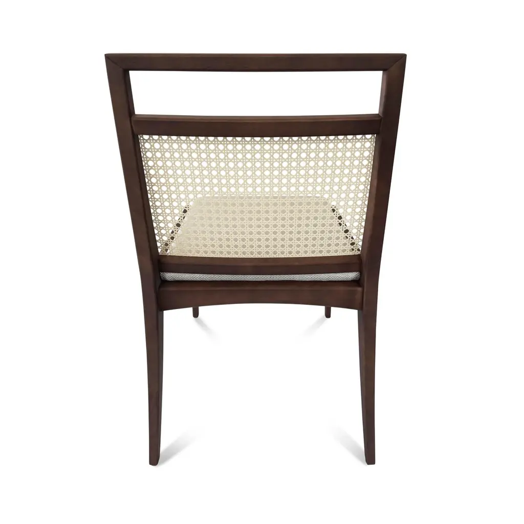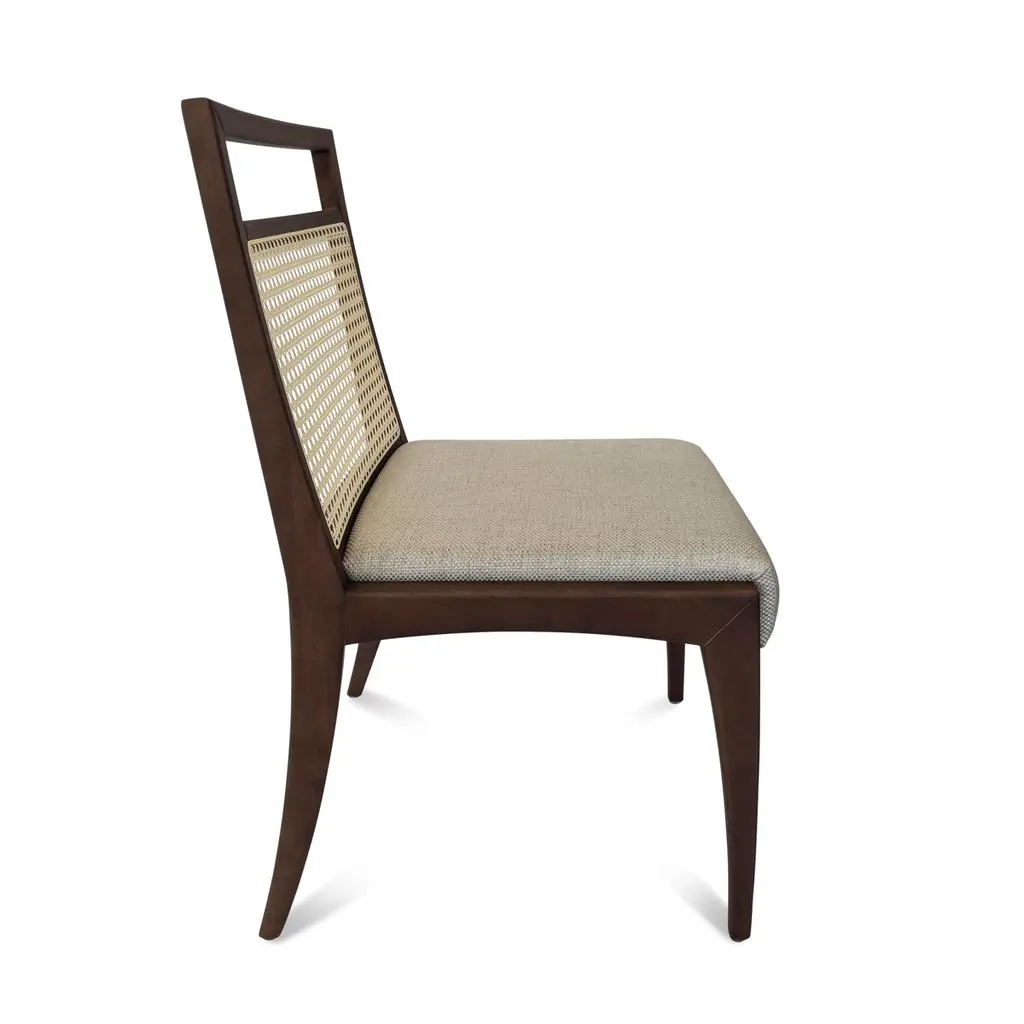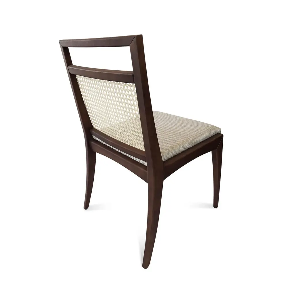 A pair of walnut-finished dining chairs with cane backs and Cloud Grey Basket Weave upholstery, the Sotto chairs offer a refined balance of elegance, comfort, and craftsmanship. Please check availability prior to purchase.Designed with a sculptural silhouette and lightweight appearance, these chairs combine traditional materials with modern sensibility—making them a standout in both formal and relaxed dining settings.The hand-woven natural cane inset contrasts beautifully with the solid walnut-finished frame, adding texture and visual depth. The anatomically curved backrest provides ergonomic support, while the medium-density foam seat, upholstered in a soft oatmeal-toned fabric, ensures comfort throughout extended meals or gatherings. Smooth edges, tapered legs, and a generous seat make the Sotto equally stylish and inviting.Perfect around a rectangular or round table, these signed chairs work well in open-plan dining areas, formal dining rooms, or even as accent seating in a living space or bedroom. In a commercial context, their understated elegance and sturdy construction make them ideal for upscale hospitality environments—boutiques, hotel lounges, or private dining rooms.Fully assembled and crafted using sustainable materials, the Sotto chairs reflect a commitment to both environmental responsibility and long-lasting quality. Their timeless profile, warm walnut tones, and woven cane detail allow them to blend with modern, transitional, or mid-century-inspired interiors with ease.Whether you're designing a welcoming home dining area or curating a polished commercial space, these customizable chairs add warmth, texture, and a sense of ease—delivering both visual charm and day-to-day usability.