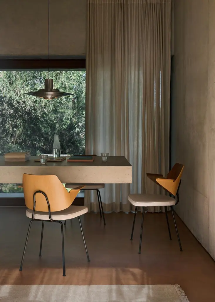 Originally created to seat visitors in the dining rooms of the Royal Festival Hall, the RFH Armchair by Robin Day is characterized by the softly curved backrest and outwardly reaching arms. Rich in materiality, the chair’s striking form is achieved through a process of form-press molding layers of beech and walnut veneer.Product MaterialWalnut and beech veneer, powder-coated steel tubing and steel rod, HR foam.Production ProcessThe frame is CNC bent, welded together and powder-coated black. The back is made from layers of walnut and beech veneer which are form-pressed and cut to shape using a CNC machine. The seat is made from layers of beech veneer glued together and upholstered foam.DimensionsH: 78 cm / 31 inchW: 58 cm / 23 inchD: 51.5 cm / 20 inchSeat H: 46 cm / 18 inchArmrest H: 66 cm / 26 inchSeat D: 41.5 cm / 16 inchWeight7.5 kgDESIGNERRobin DayBorn and raised in the furniture making town of High Wycombe, Robin Day (1915-2010) grew up surrounded by timber yards and cabinetmaking workshops. After graduating from Royal College of London, his dream of becoming a furniture designer was put on hold due to the outbreak of World War II. He instead developed his skills making drawings and models for architects, signwriting, producing showcards for fashion boutiques and teaching technical drawing and lettering part-time. He later went on to become an established exhibition designer.
