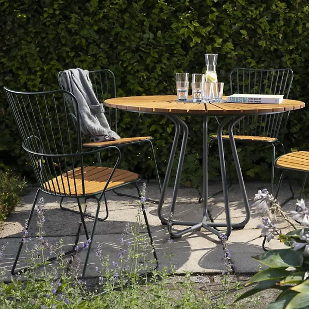 Enjoy your mealtimes with the Paon Outdoor Dining Chair Set of 2 by Houe. Steel has been elegantly crafted into a slender frame with a ribbed seatback. The chair’s strong legs form pyramid-like silhouettes while providing you with postural support. The arms of this chair contour gracefully, giving this furnishment a streamlined appearance. Place this chair in your contemporary kitchen so that you will be elevated to the right height when seated before your dinner table.