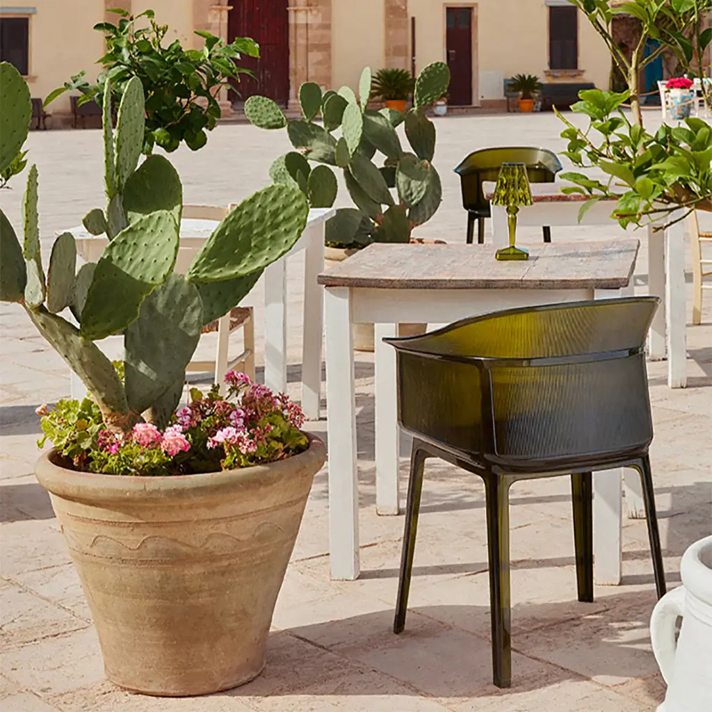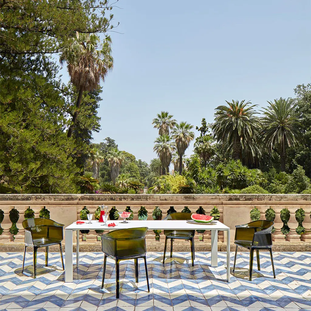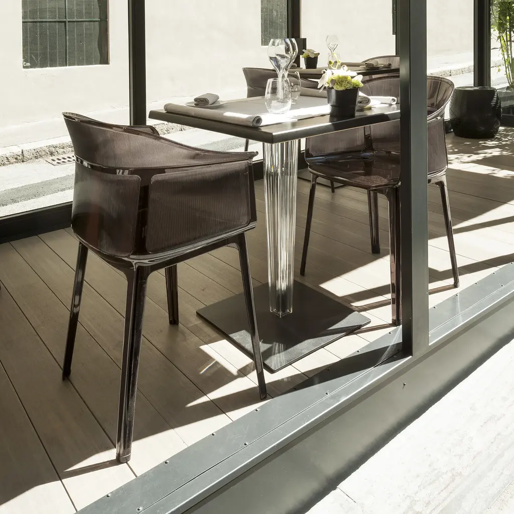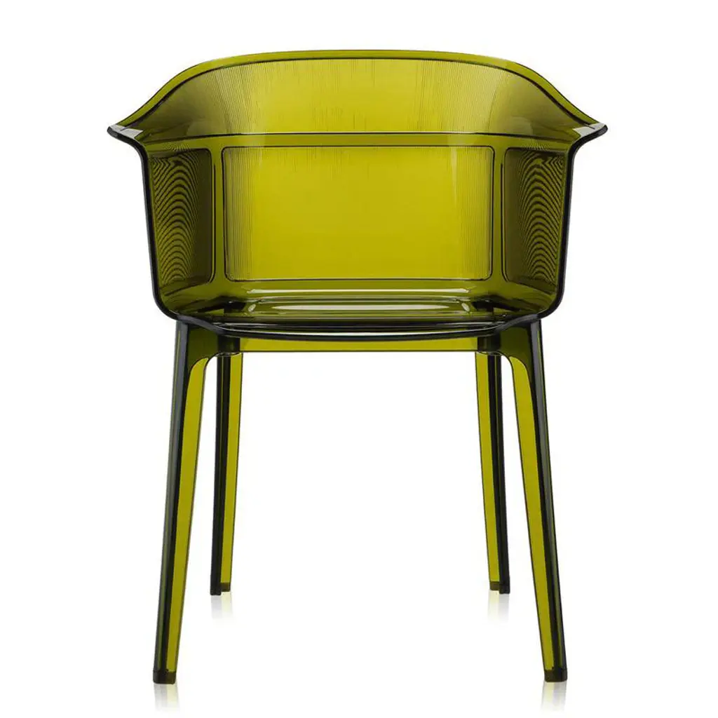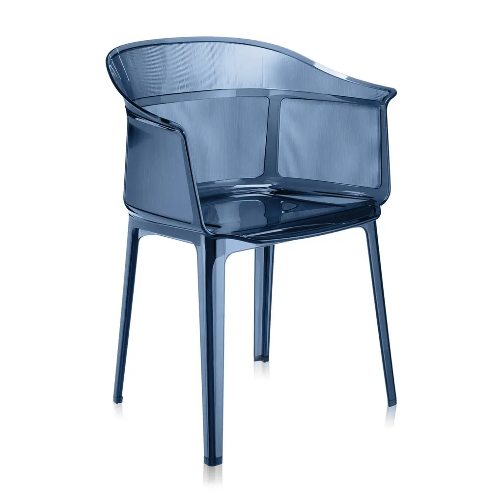 Always sitting pretty Sophisticated and conceptual, the Papyrus chair designed by the Bouroullec brothers for Kartell is a transparent, visual masterpiece perfect for casual and upscale spaces alike. Inspired by the archetypal antique rush chair, the Papyrus is an ideal blend of simplicity and grace. Crafted from Kartell's iconic polycarbonate that is made from a proprietary, eco-friendly blend of ISCC certified cellulose and paper waste, this transparent dining chair is evidence of Kartell's commitment to the environment and producing innovative materials and designs. Visually and physically light, the smoothness of the material is offset by slender vertical pebbling, running along the entire outside of the rounded backrest providing an unexpected touch of texture to this eye-catching design. Features