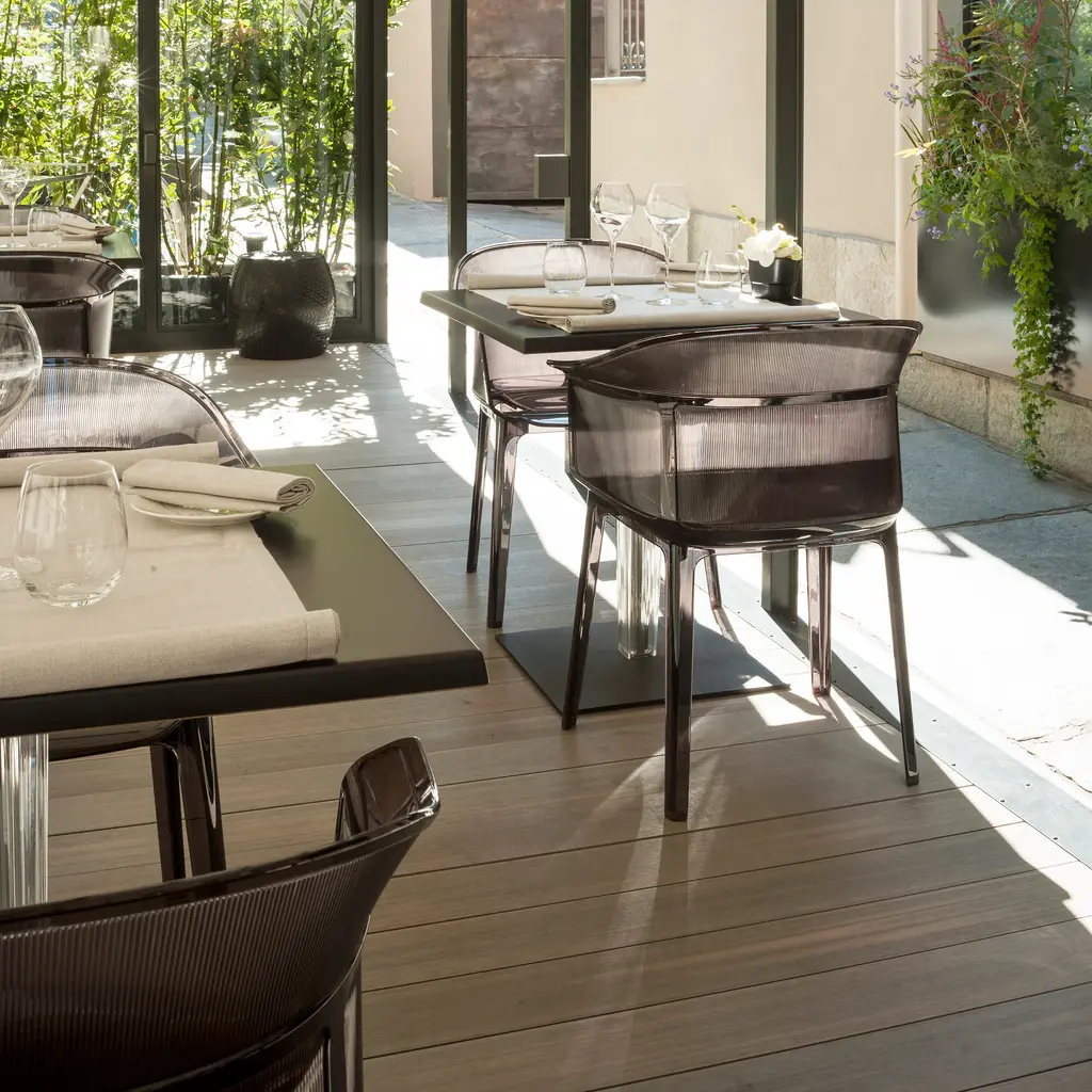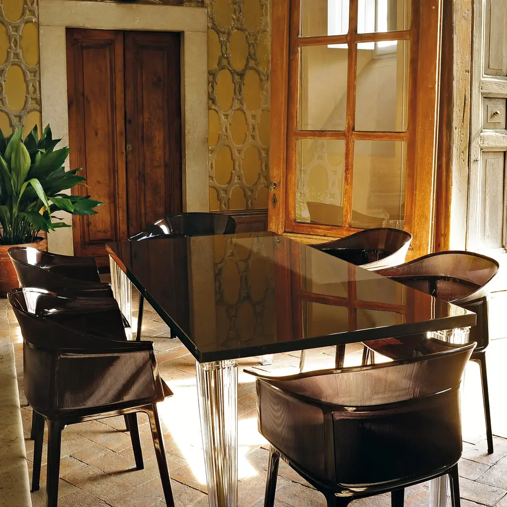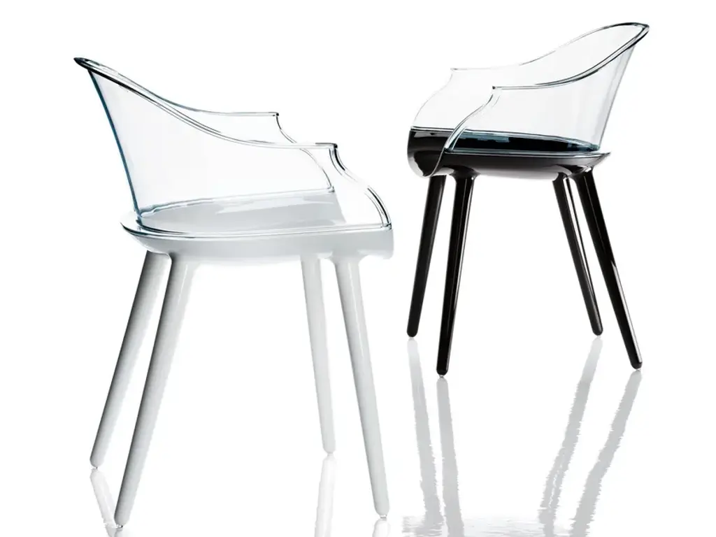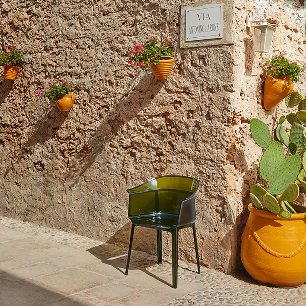 Always sitting pretty Sophisticated and conceptual, the Papyrus chair designed by the Bouroullec brothers for Kartell is a transparent, visual masterpiece perfect for casual and upscale spaces alike. Inspired by the archetypal antique rush chair, the Papyrus is an ideal blend of simplicity and grace. Crafted from Kartell's iconic polycarbonate that is made from a proprietary, eco-friendly blend of ISCC certified cellulose and paper waste, this transparent dining chair is evidence of Kartell's commitment to the environment and producing innovative materials and designs. Visually and physically light, the smoothness of the material is offset by slender vertical pebbling, running along the entire outside of the rounded backrest providing an unexpected touch of texture to this eye-catching design. Features