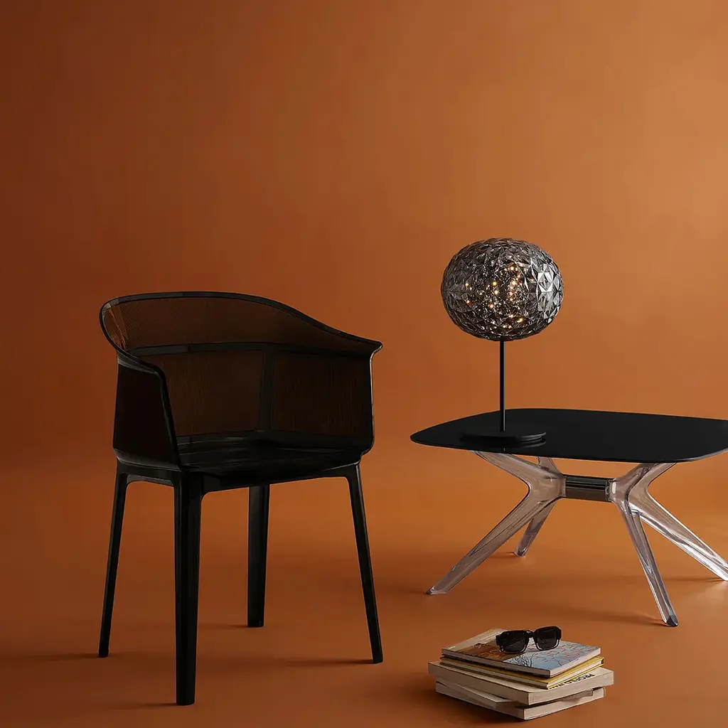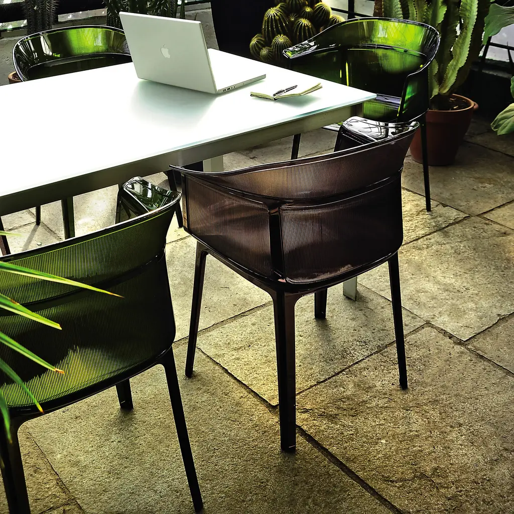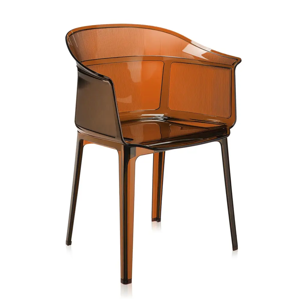 Always sitting pretty Sophisticated and conceptual, the Papyrus chair designed by the Bouroullec brothers for Kartell is a transparent, visual masterpiece perfect for casual and upscale spaces alike. Inspired by the archetypal antique rush chair, the Papyrus is an ideal blend of simplicity and grace. Crafted from Kartell's iconic polycarbonate that is made from a proprietary, eco-friendly blend of ISCC certified cellulose and paper waste, this transparent dining chair is evidence of Kartell's commitment to the environment and producing innovative materials and designs. Visually and physically light, the smoothness of the material is offset by slender vertical pebbling, running along the entire outside of the rounded backrest providing an unexpected touch of texture to this eye-catching design. Features