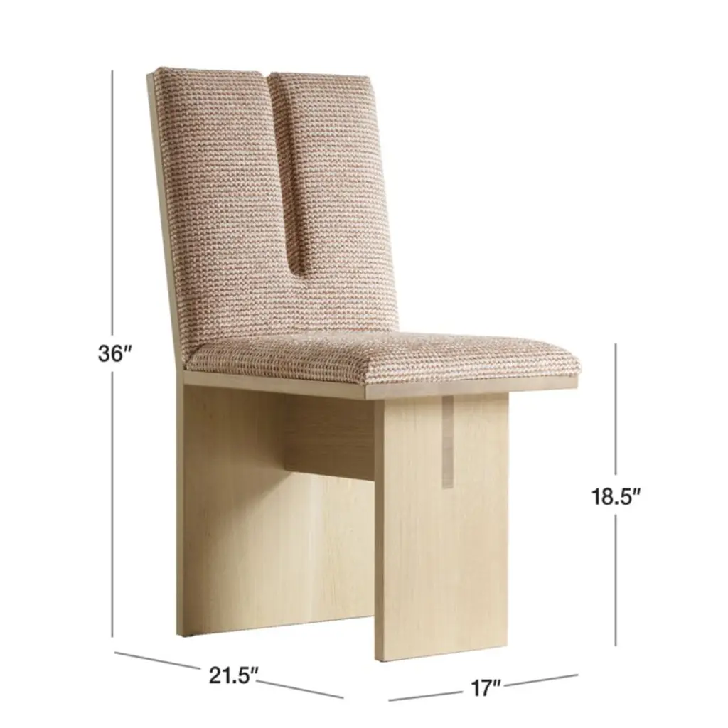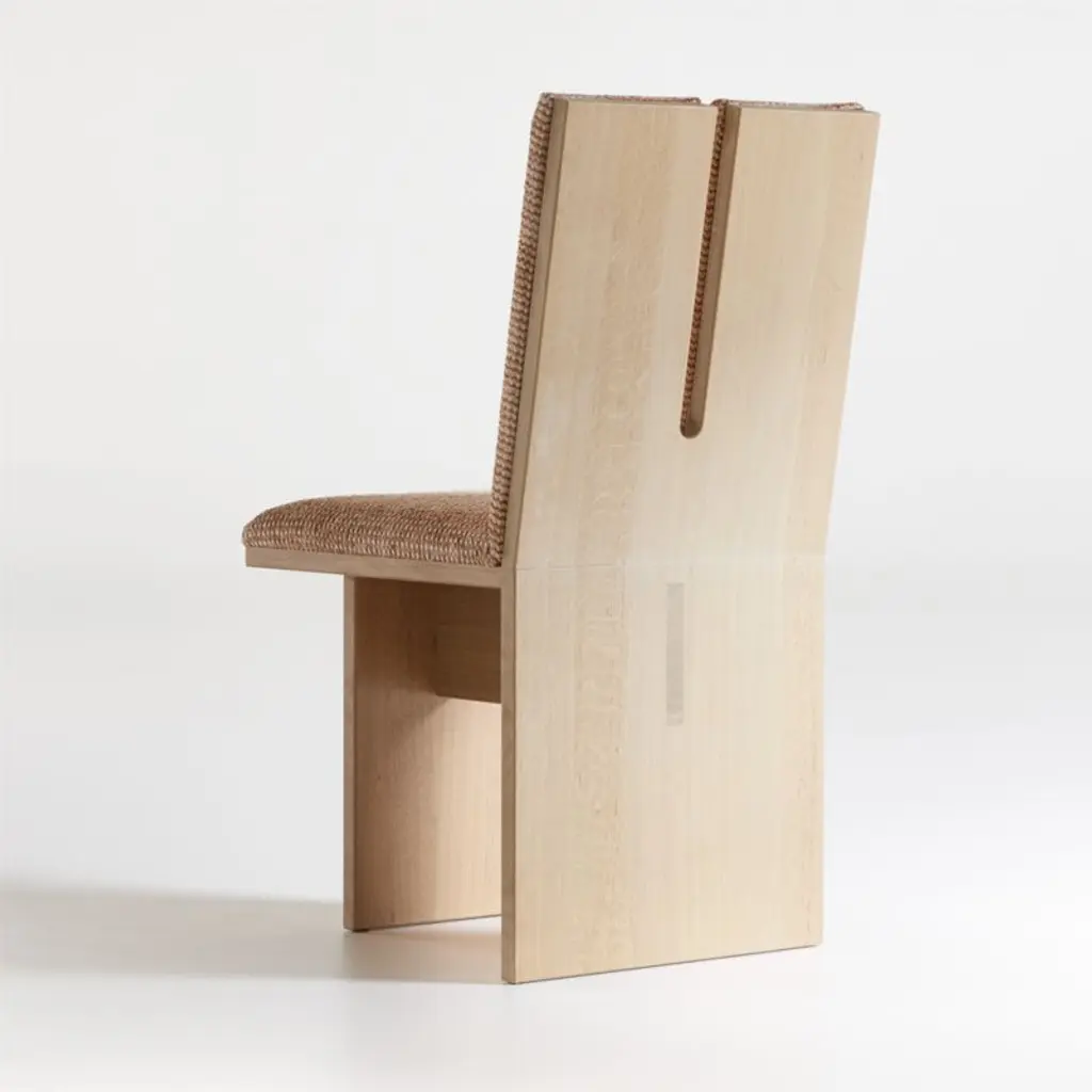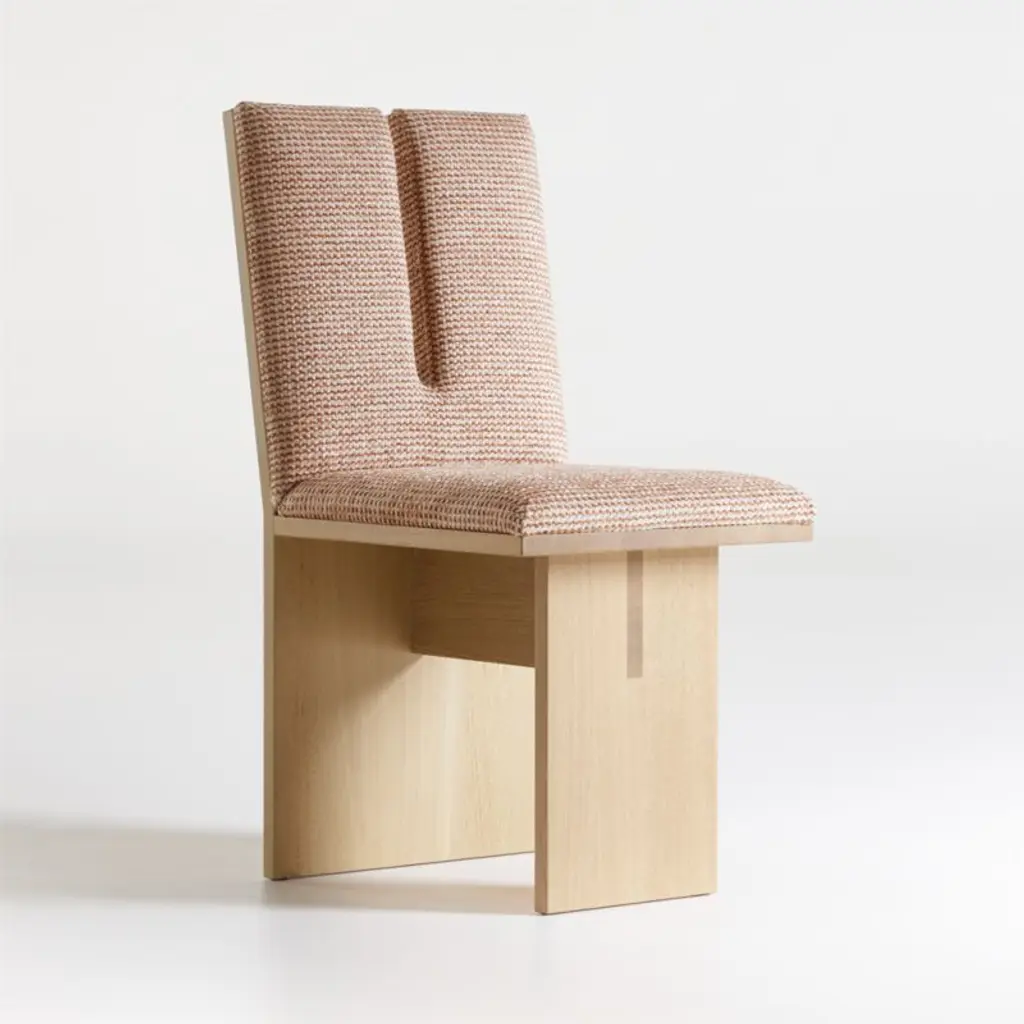 Our Paradox collection resolves form and function with masterful woodworking and clean lines. Made of solid oak, the chair shows off the great oak wood grain in front and back panel legs. A slim cutout down the center of the chair accentuates its linear design, while the textured chenille upholstery adds cushioned softness. The Paradox wood dining chair is a Crate and Barrel exclusive.