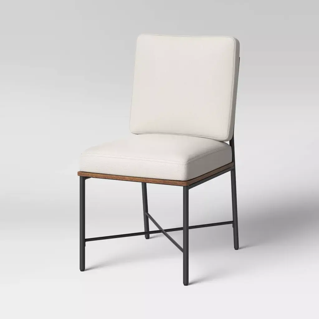 Boost your home's style with the Parkton Mixed Material Dining Chair from Threshold™. This beautiful chair features a mixed material design of a dark wood tone with a black metal frame. The combination is both bold and eye-catching, yet the neutral colored upholstery makes it easy to match this piece of furniture with whatever aesthetic you prefer. Wide square legs with crisscross rods at the bottom provide comfort and an interesting visual detail. This dining chair is perfect for giving your home an upgraded look of elegant luxury and timeless style.
