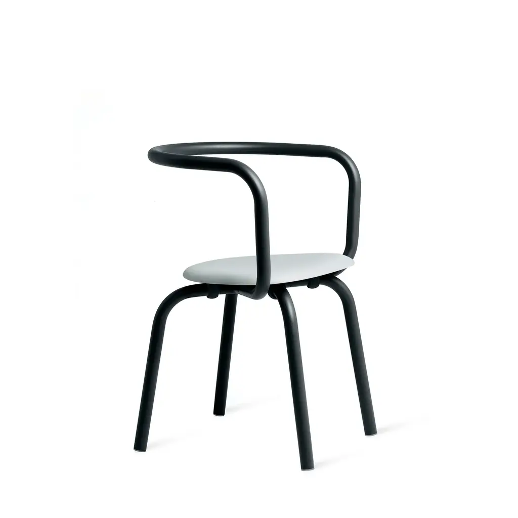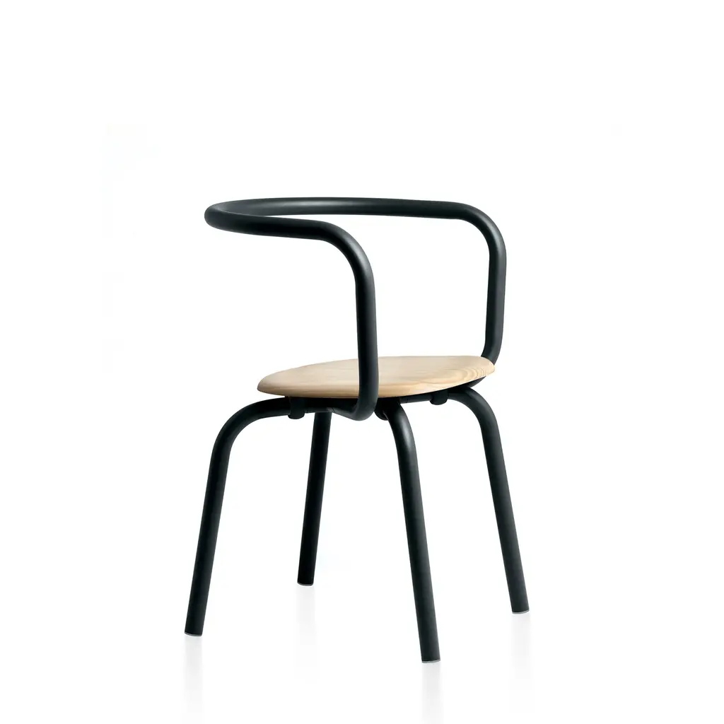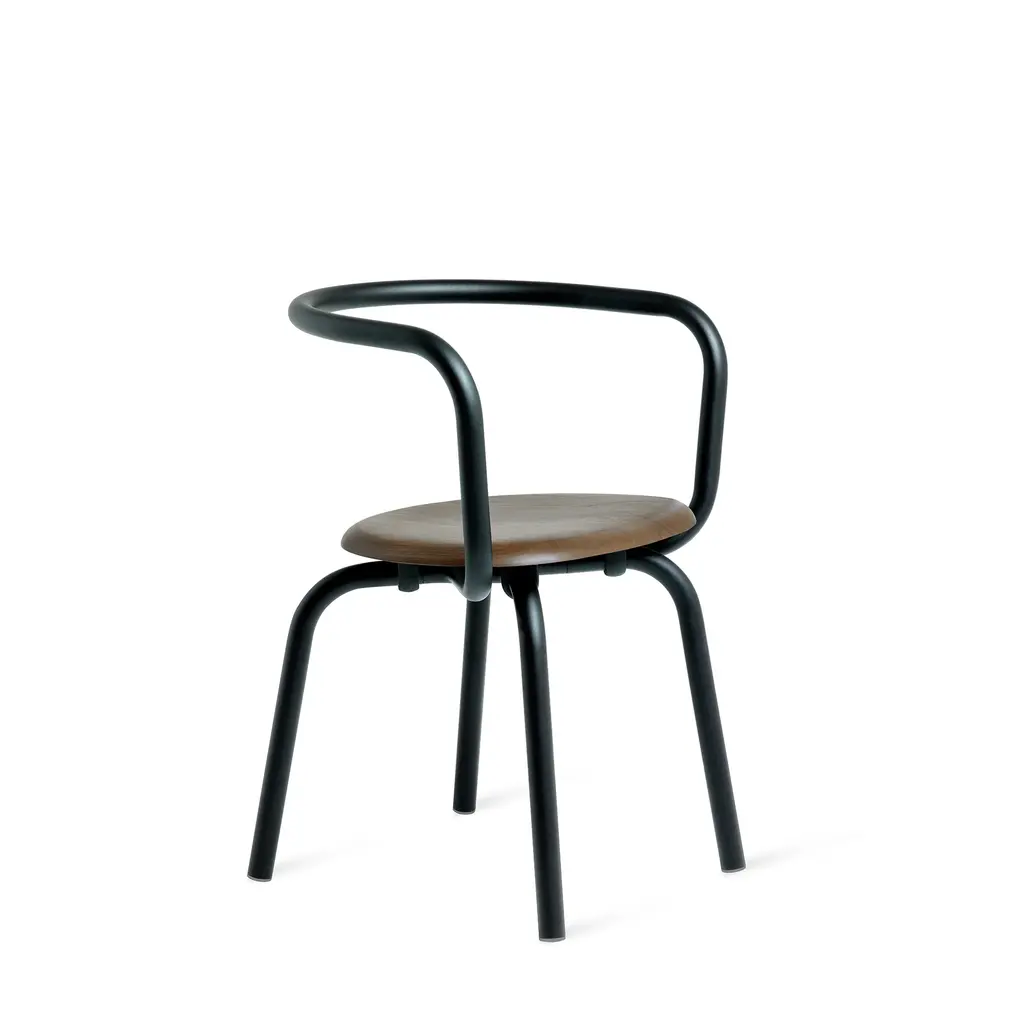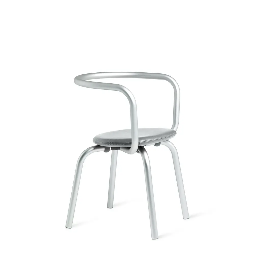 Parrish by Konstantin Grcic, 2013 The Parrish Collection was originally designed for the Parrish Art Museum in New York. Just like the modest museum building holds an internal complexity, Parrish combines a subtle, timeless design with a heartfelt technical core. The slender chair frame is made of 80% recycled aluminum, available in two finishes, with seats in solid wood or 100% recycled plastic. Designed and built to last, the Parrish side chair is right in any residential, commercial and public setting - indoors and out. Made in USA.