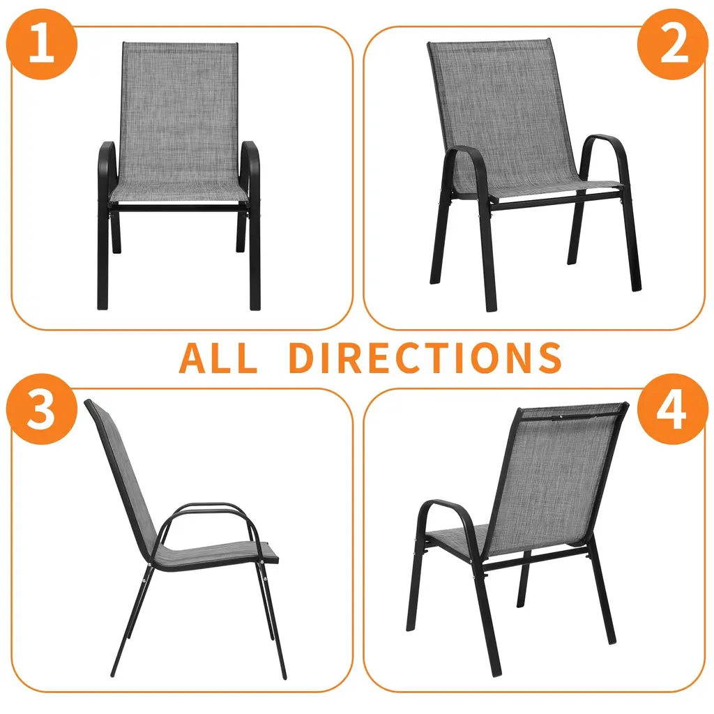 Our versatile all-weather furniture chairs offer easy, compact storage with a stackable design and weighs just 9.2 lbs for effortless mobility. The breathable, waterproof Textilene fabric of the gardem chairs ensure durability and easy maintenance. With a comfortable tilt, high backrest, and curved armrests, it provides excellent support. The 18.1-inch seat height fits most outdoor dining tables, while the 20.7-inch width suits various users. The powder-coated metal frame adds durability, making this patio chairs set perfect for patios, decks, and porches.Features:Metal Frame Furniture Chairs:Product Details: