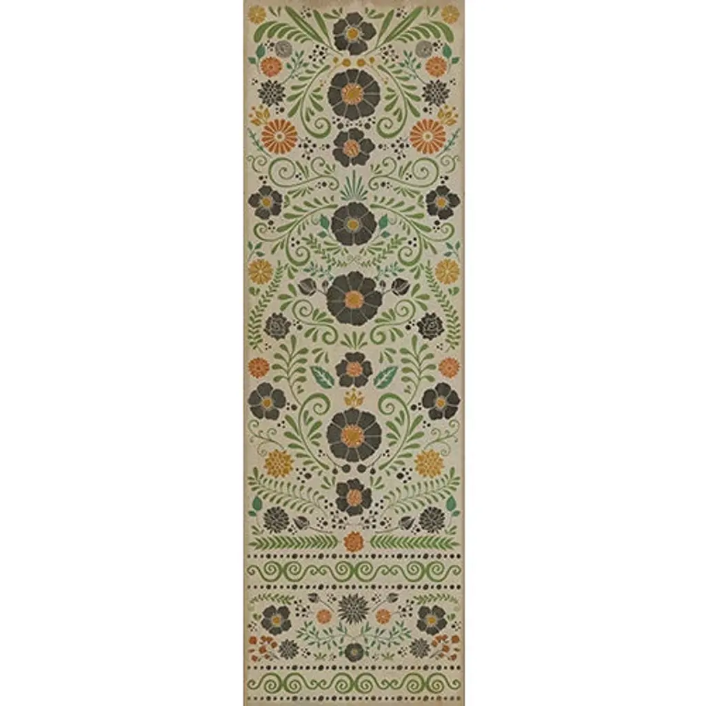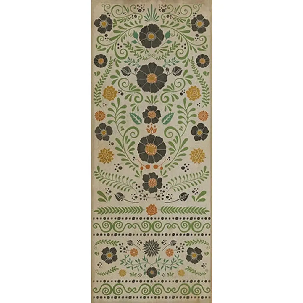 Inspired by old floor mats and vintage linoleum, these vibrant vinyl floor cloths offer warm colors with beautiful aged characteristic. Their worn appeal makes them great in kitchens and baths, while the smooth surface is perfect in an office where rolling chairs can glide. The cloths can be used in controlled outdoor settings such as a screened-in porch or covered lanai. These wonderful designs are printed on durable, certified non-slip, lay-flat vinyl. Due to their mastered printing process please expect some variation in hue and saturation. With a wide range of color combinations and sizes to choose from, enjoy picking your favorites to dress up your floor.