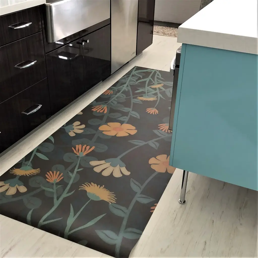 Inspired by old floor mats and vintage linoleum, these vibrant vinyl floor cloths offer warm colors with beautiful aged characteristic. Their worn appeal makes them great in kitchens and baths, while the smooth surface is perfect in an office where rolling chairs can glide. The cloths can be used in controlled outdoor settings such as a screened-in porch or covered lanai. These wonderful designs are printed on durable, certified non-slip, lay-flat vinyl. Due to their mastered printing process please expect some variation in hue and saturation. With a wide range of color combinations and sizes to choose from, enjoy picking your favorites to dress up your floor.
