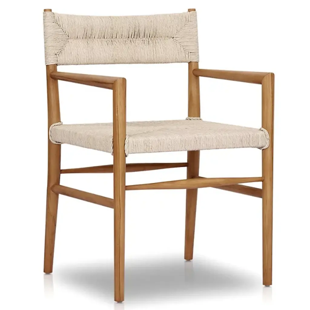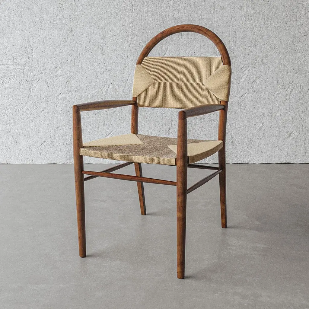 A solid wood arched frame threads through a woven rush seat with arms and backrest to form this well-proportioned, minimalist chair for dining, desk, vanity or an accent in any room. Handmade by artisans in Vietnam, this piece is available in cerused European oak or walnut finishes.