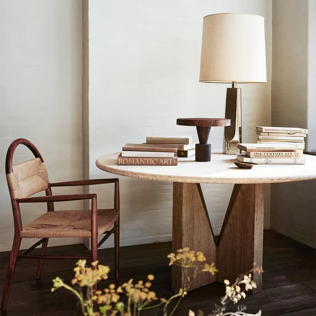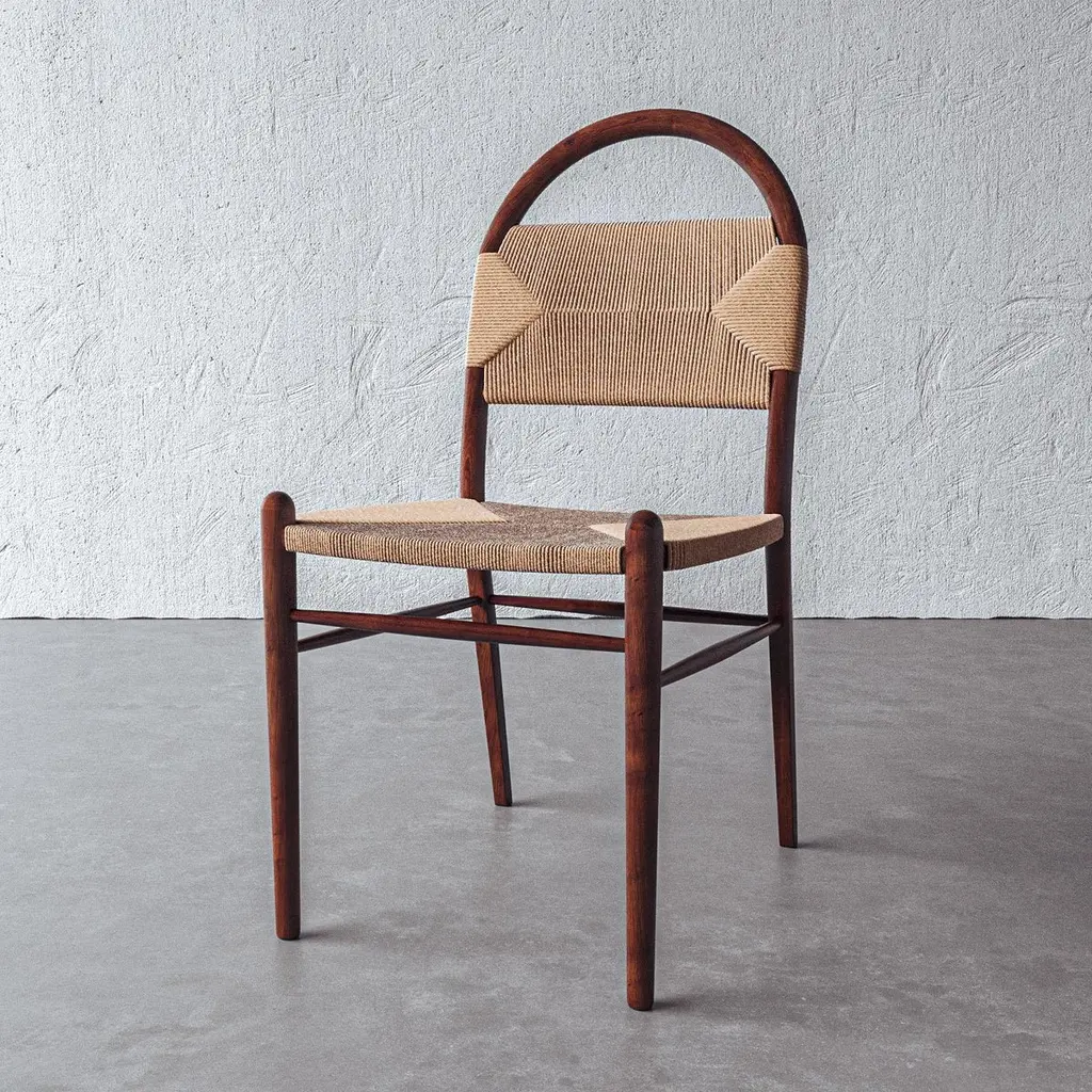 A solid wood arched frame threads through a woven rush seat with arms and backrest to form this well-proportioned, minimalist chair for dining, desk, vanity or an accent in any room. Handmade by artisans in Vietnam, this piece is a casual contrast to a modern interior. Available in cerused European oak or walnut finishes.