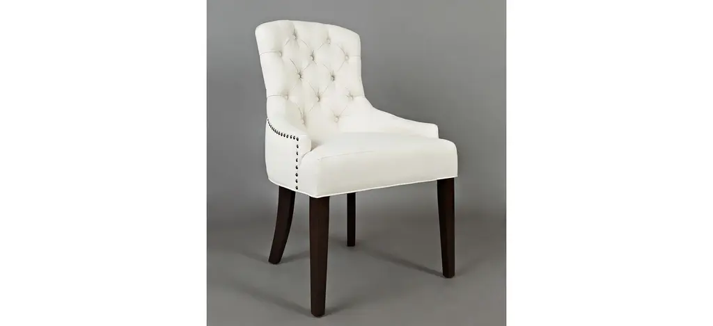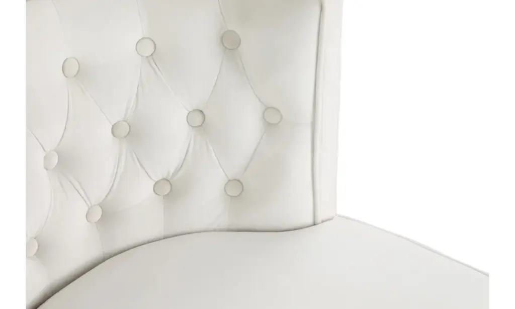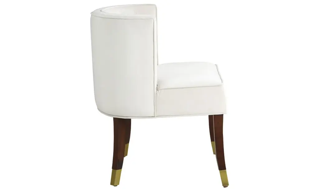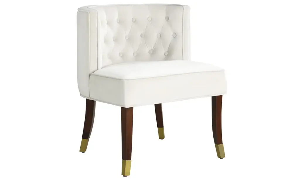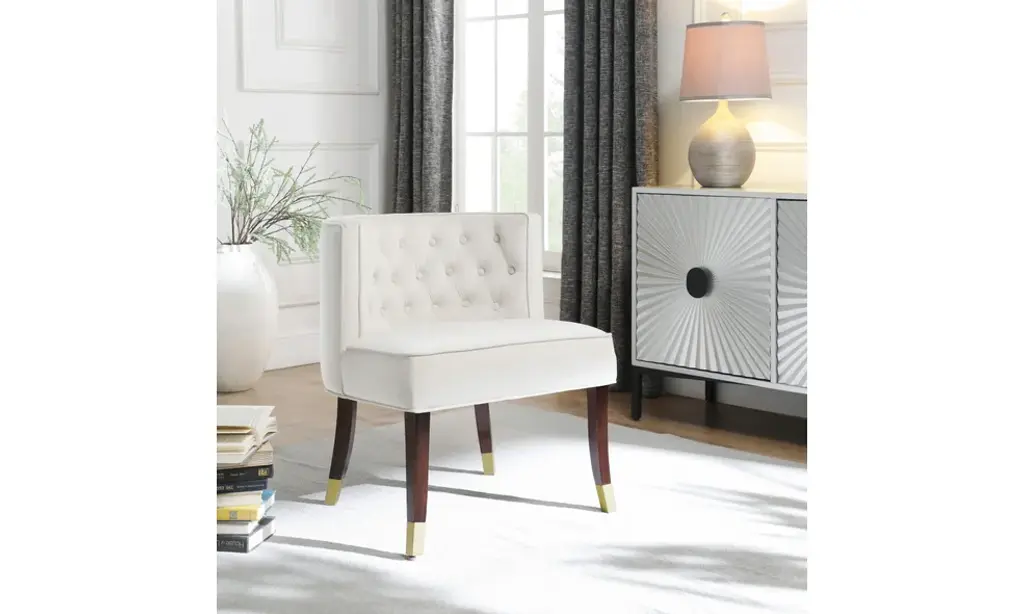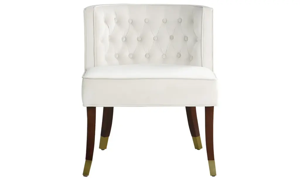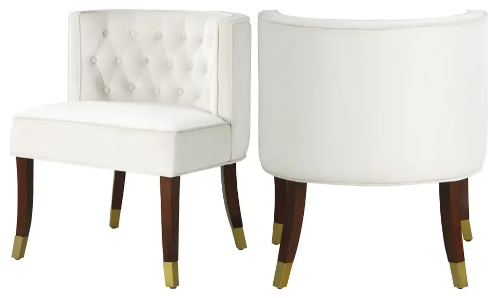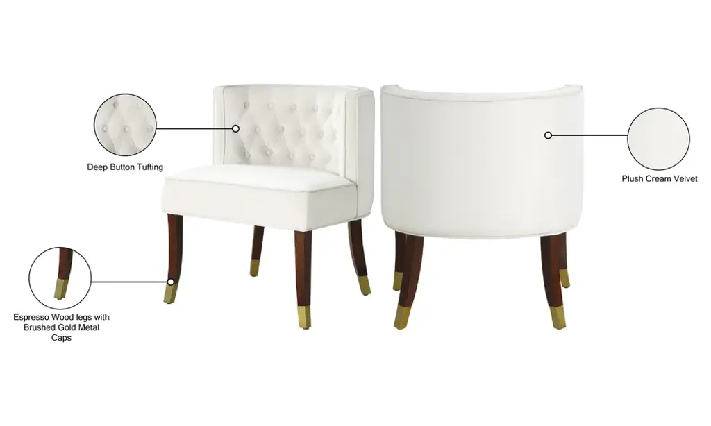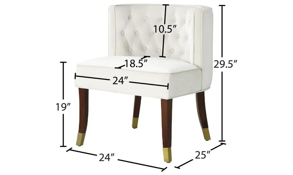 Make diners feel comfortable from the first course through dessert when you seat them in this Perry velvet dining chair. This handsome chair is covered in chic, plush cream velvet and features a button-tufted back for an elegant look that impresses visitors and family alike. The chair sits on espresso wood legs with metal caps in brushed gold for added elegance and refinement.Overall Product Dimensions: 24" W x 25" D x 29.5" HPlush Cream VelvetDeep Button Tufted BackEspresso Wood Legs with Brushed Gold Metal CapsContemporary DesignSeat Dimensions:Seat Width: 24"Seat Height: 19"Seat Depth: 18.5"Back Height: 10.5"