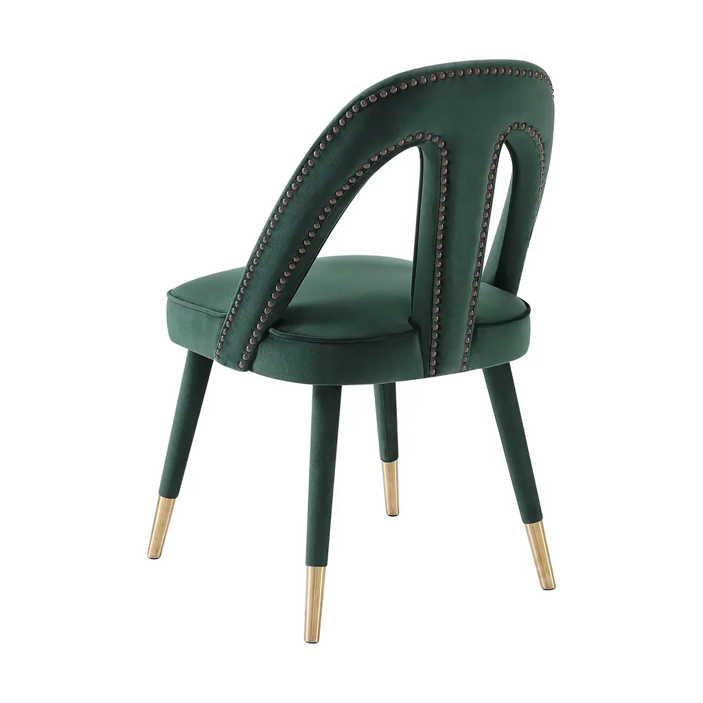 Elevate your dining experience to a brand new level with the stunning Petra chairs. Its fully upholstered frame, nailhead trim and gold-tipped legs complement each other beautifully and its high-density foam padding offers outstanding comfort and support.