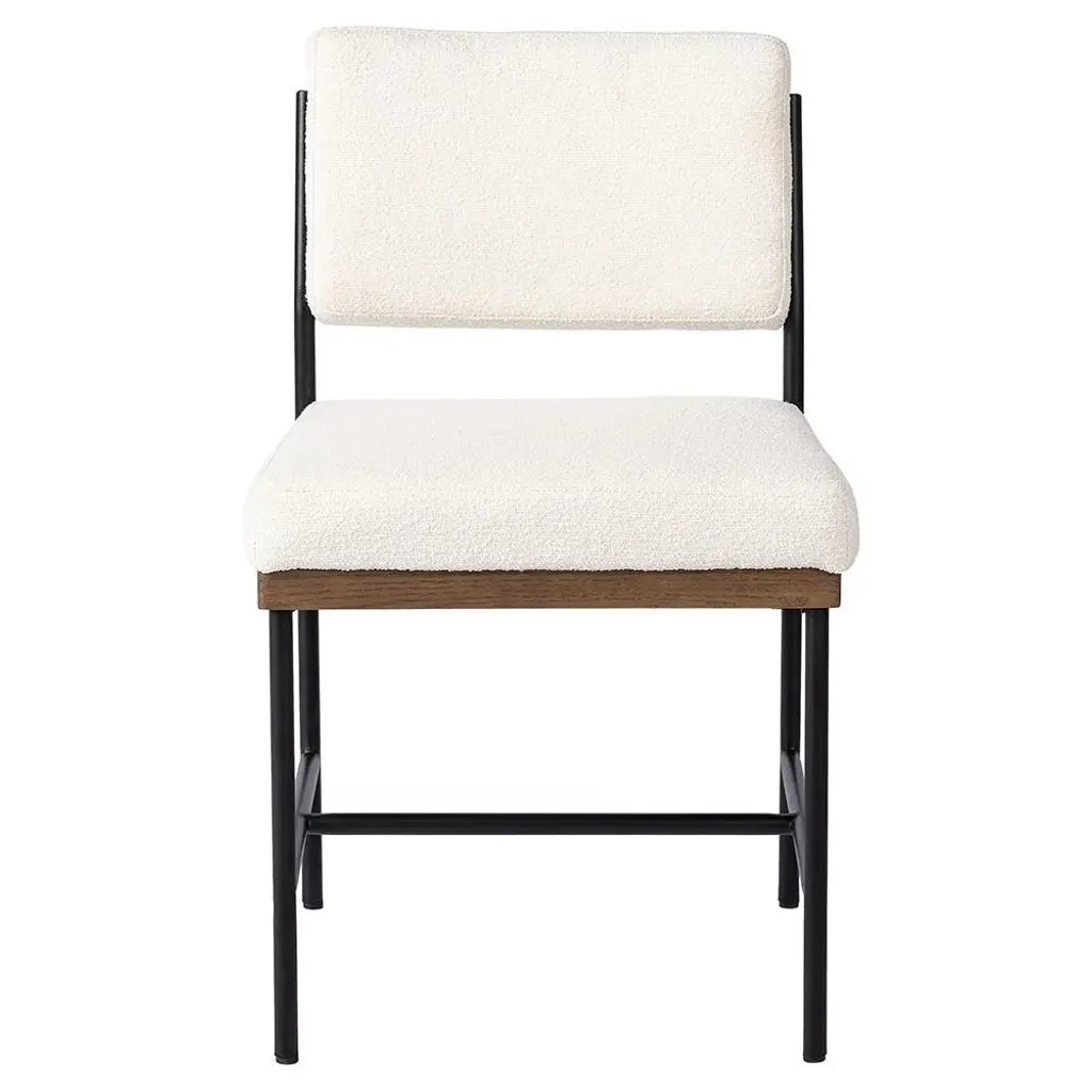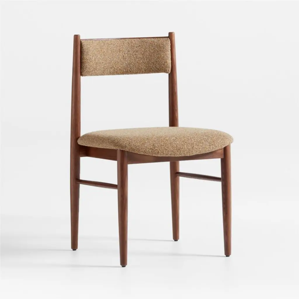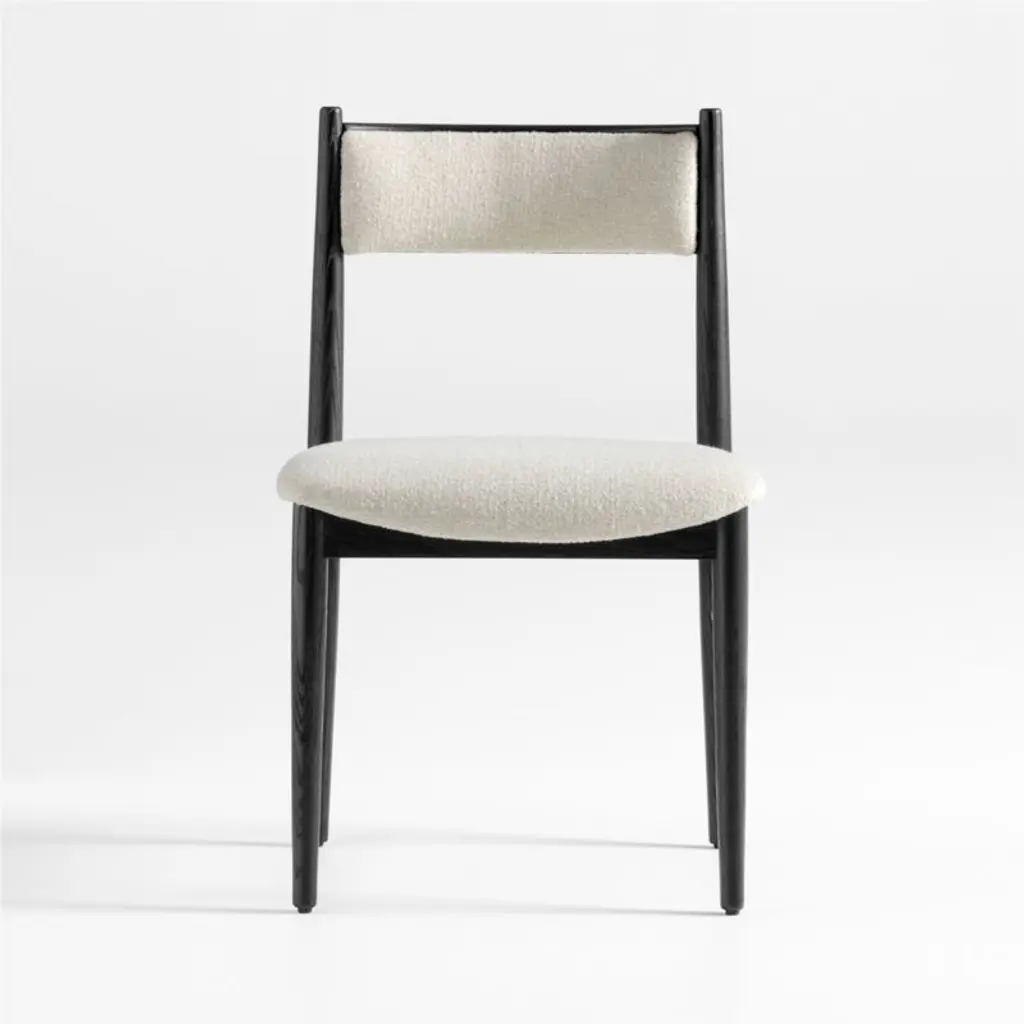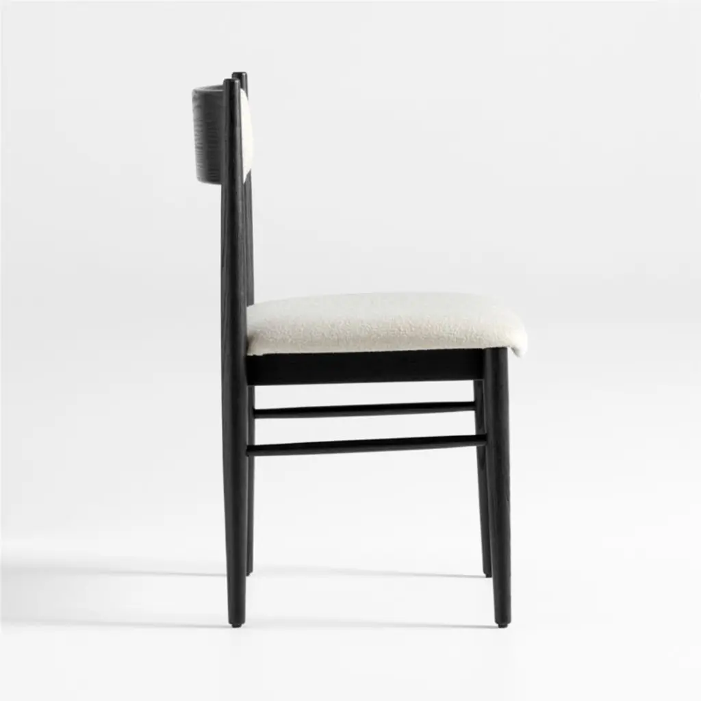 Our Petrie dining chair taps into the same stylish era as our furniture collection of the same name. With its classic mid-century modern silhouette, the black-finished ash chair features subtly tapered turned legs and a barrel-curved backrest. A padded back and cushioned seat that extends slightly beyond the frame soften the look and provide linger-inducing comfort. The ivory performance upholstery textures with a mini boucle-like weave. The Petrie charcoal dining chair is a Crate & Barrel exclusive.By choosing FSC ®-certified furniture, you are supporting responsible management of the world's forests.