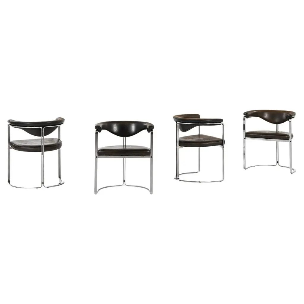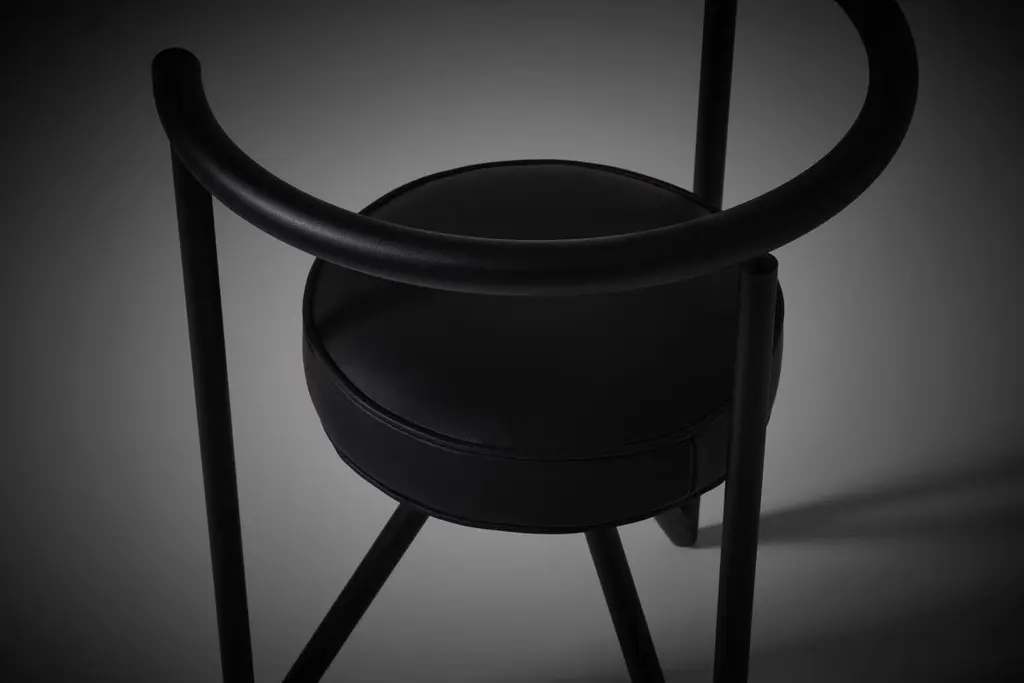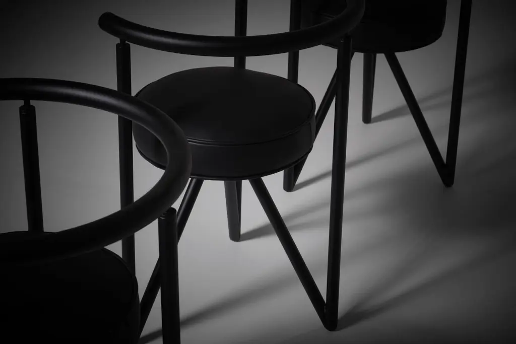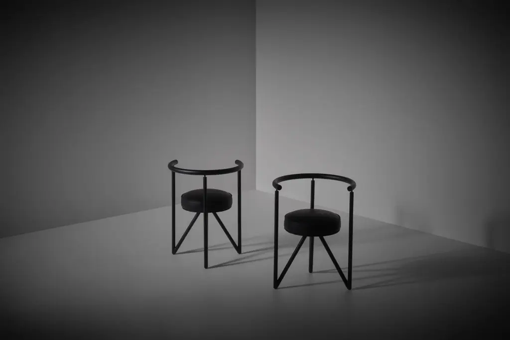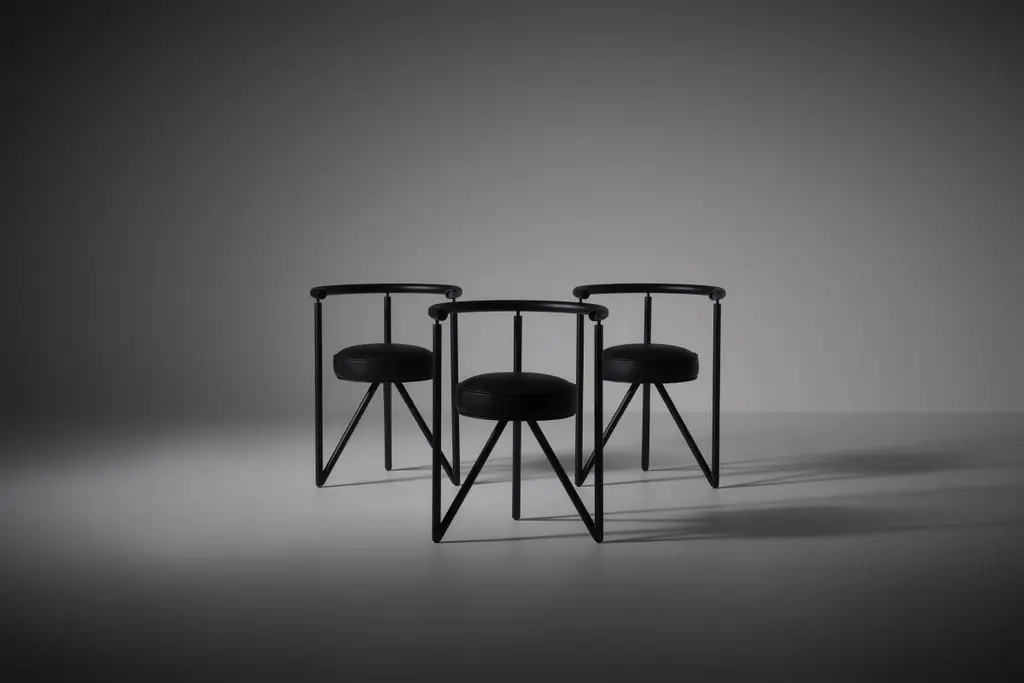 Miss Dorn chairs by Philippe Starck for Disform, 1982. Black coated tubular steel frames and round cylindrical black leather seats. The combination of their primary shapes and hard lines provide a very interesting sculptural silhouette to the chairs. In excellent condition.