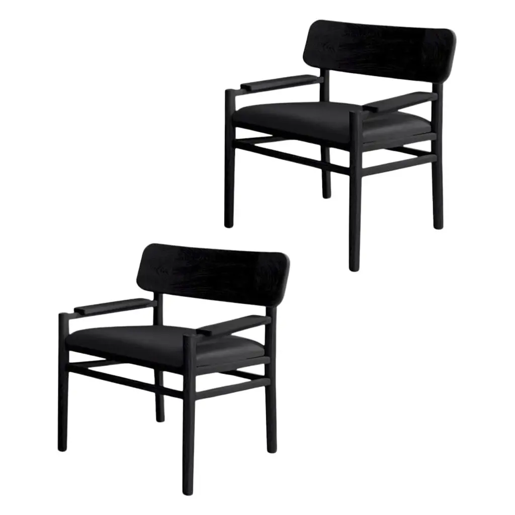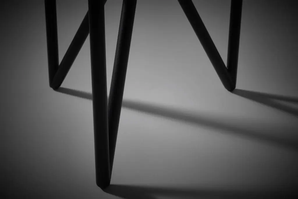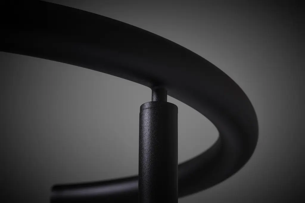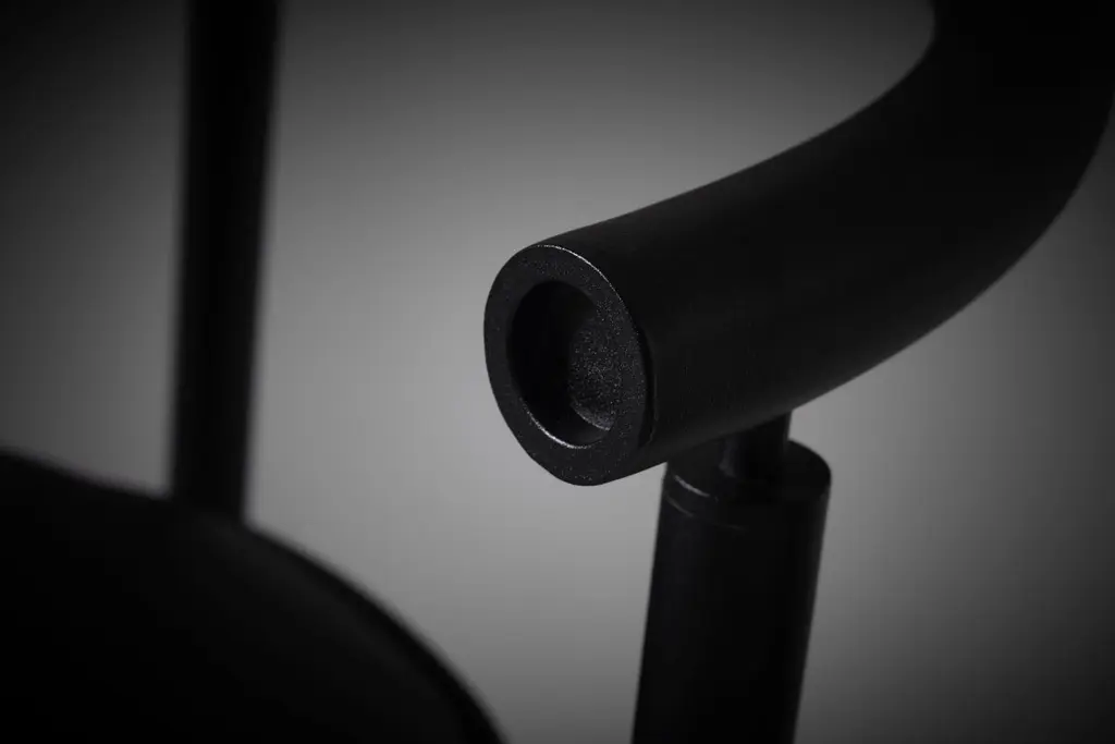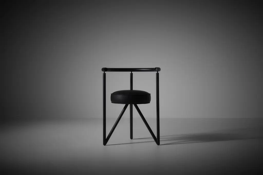 Miss Dorn chairs by Philippe Starck for Disform, 1982. Black coated tubular steel frames and round cylindrical black leather seats. The combination of their primary shapes and hard lines provide a very interesting sculptural silhouette to the chairs. In excellent condition.
