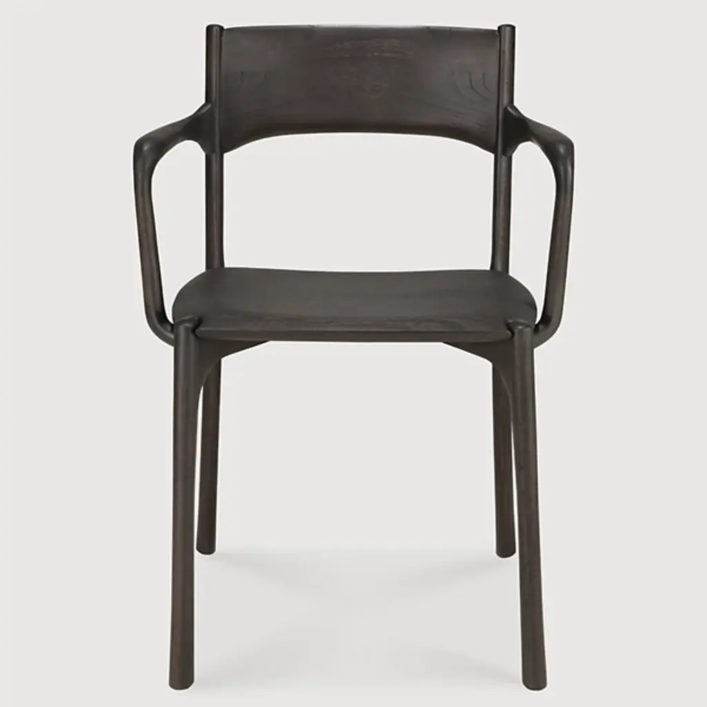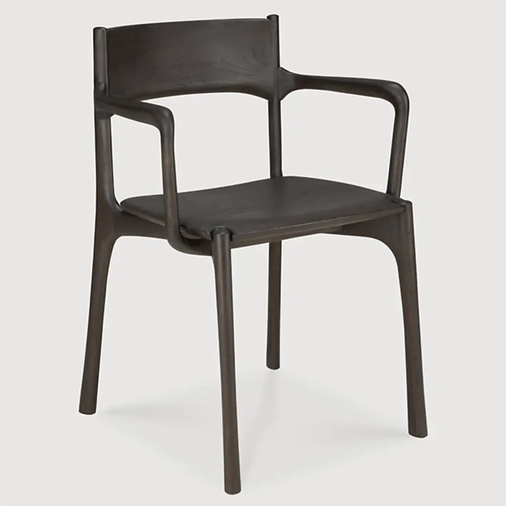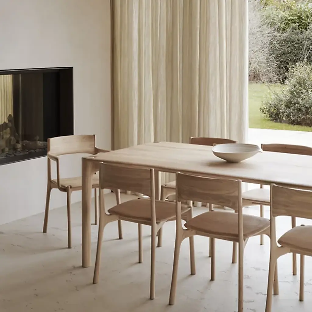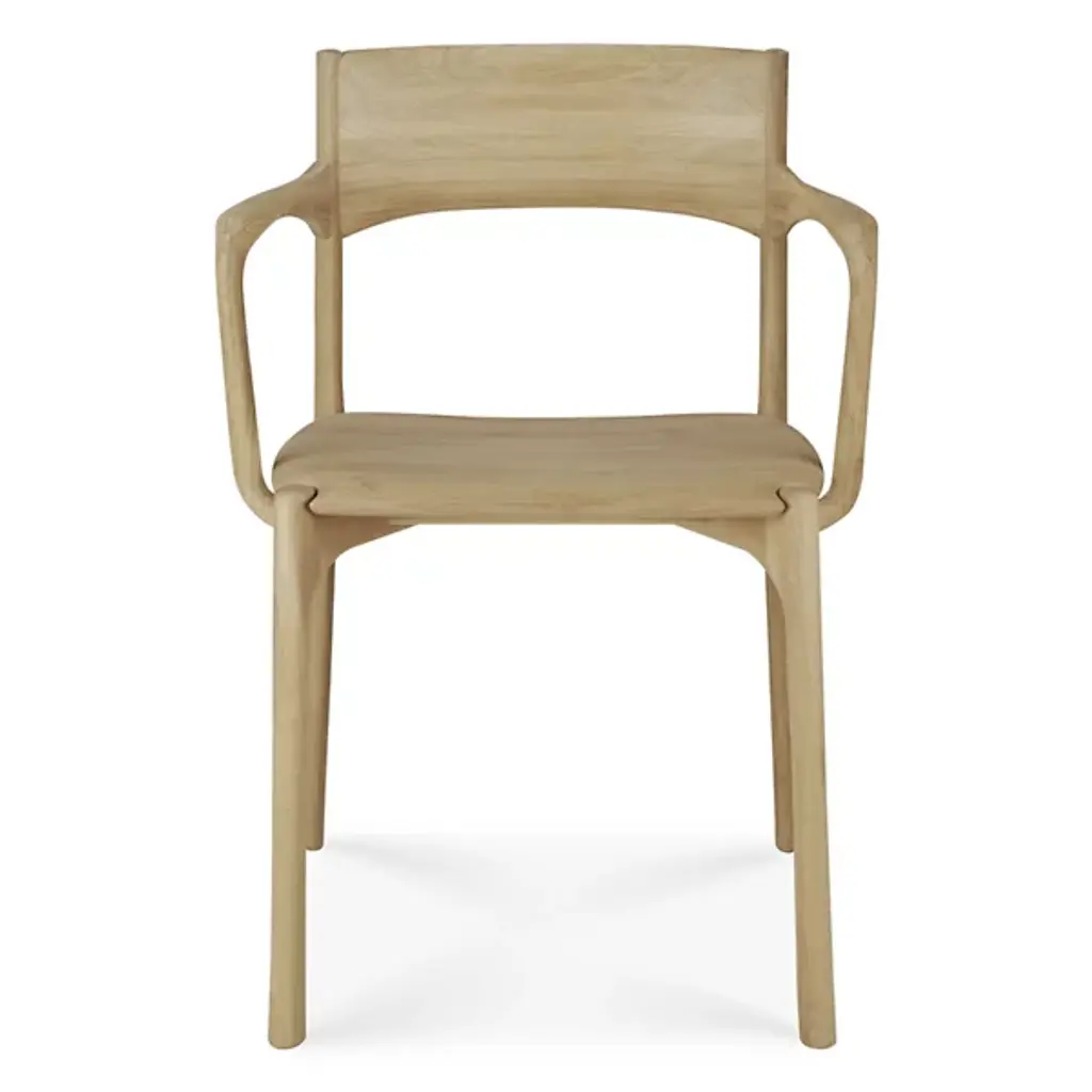 The PI Dining Arm Chair for Ethnicraft, created by Alain Van Havre, exhibits well-thought-out woodworking. Each piece celebrates oak's natural properties through a hard wax oil finish. The curved back transitions smoothly into arms, creating natural support. Tapered legs connect to the seat through precise joinery. The chair balances sturdy construction with nimble proportions. Hand-finishing highlights wood grain patterns unique to each piece. This seating solution proves that utility need not sacrifice grace.
