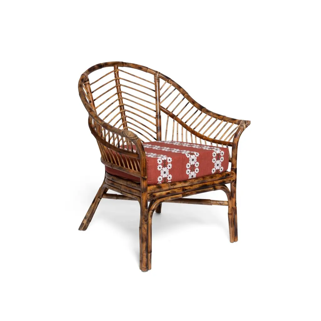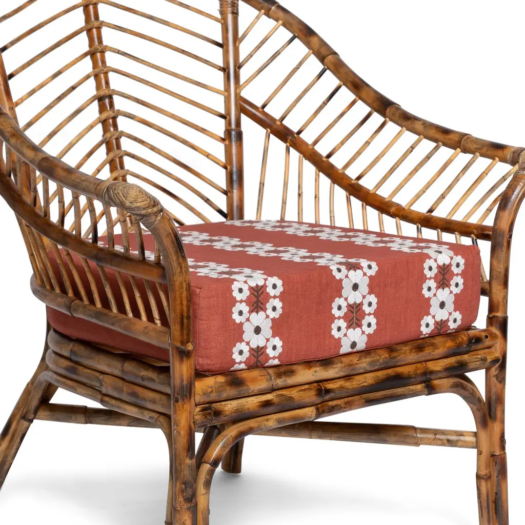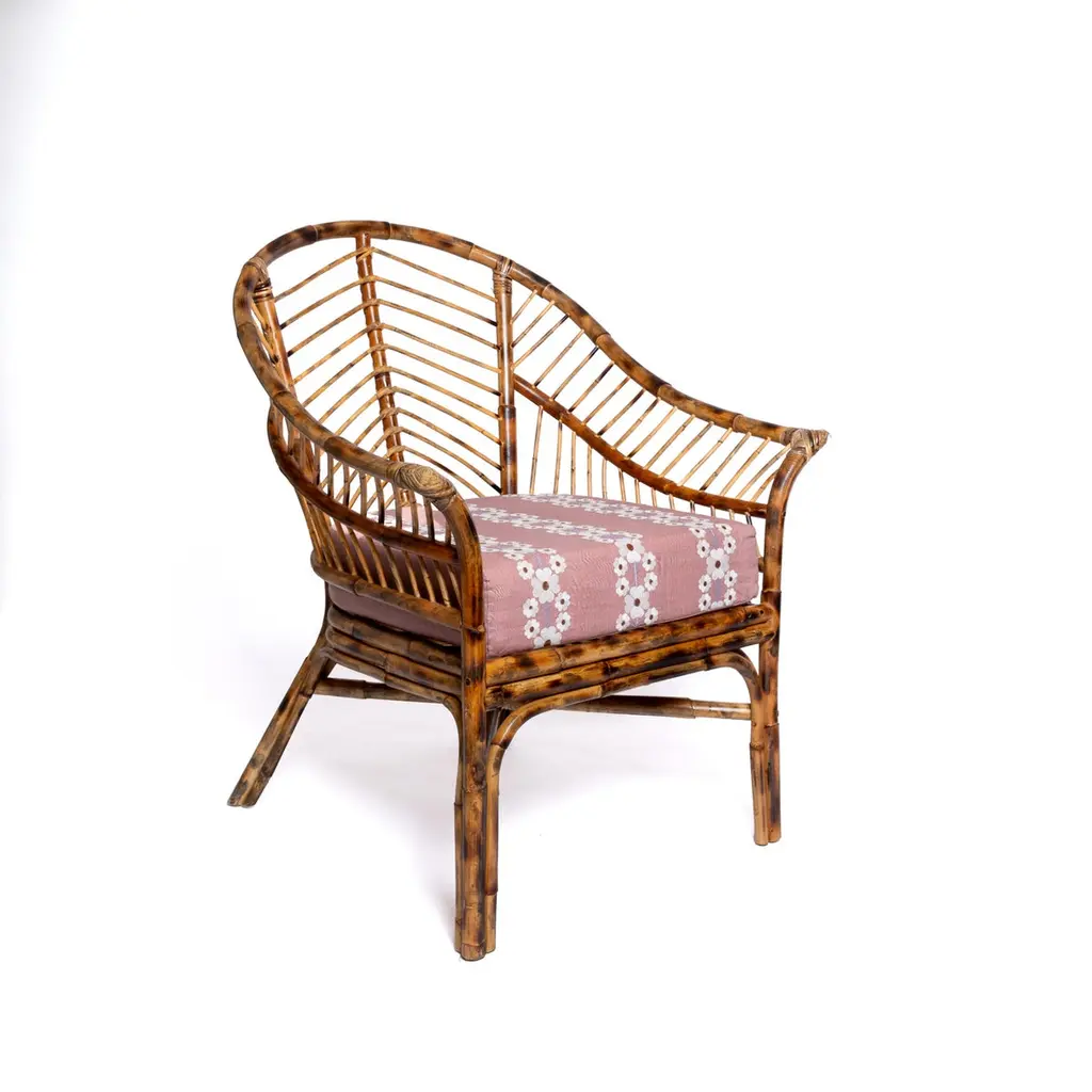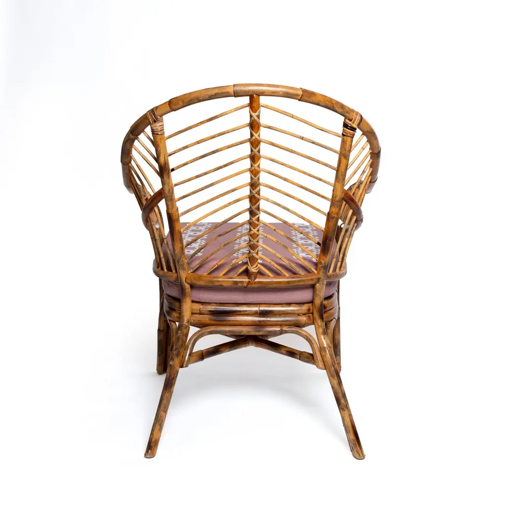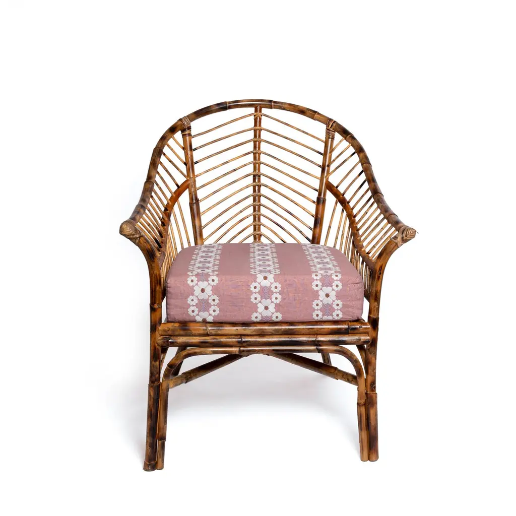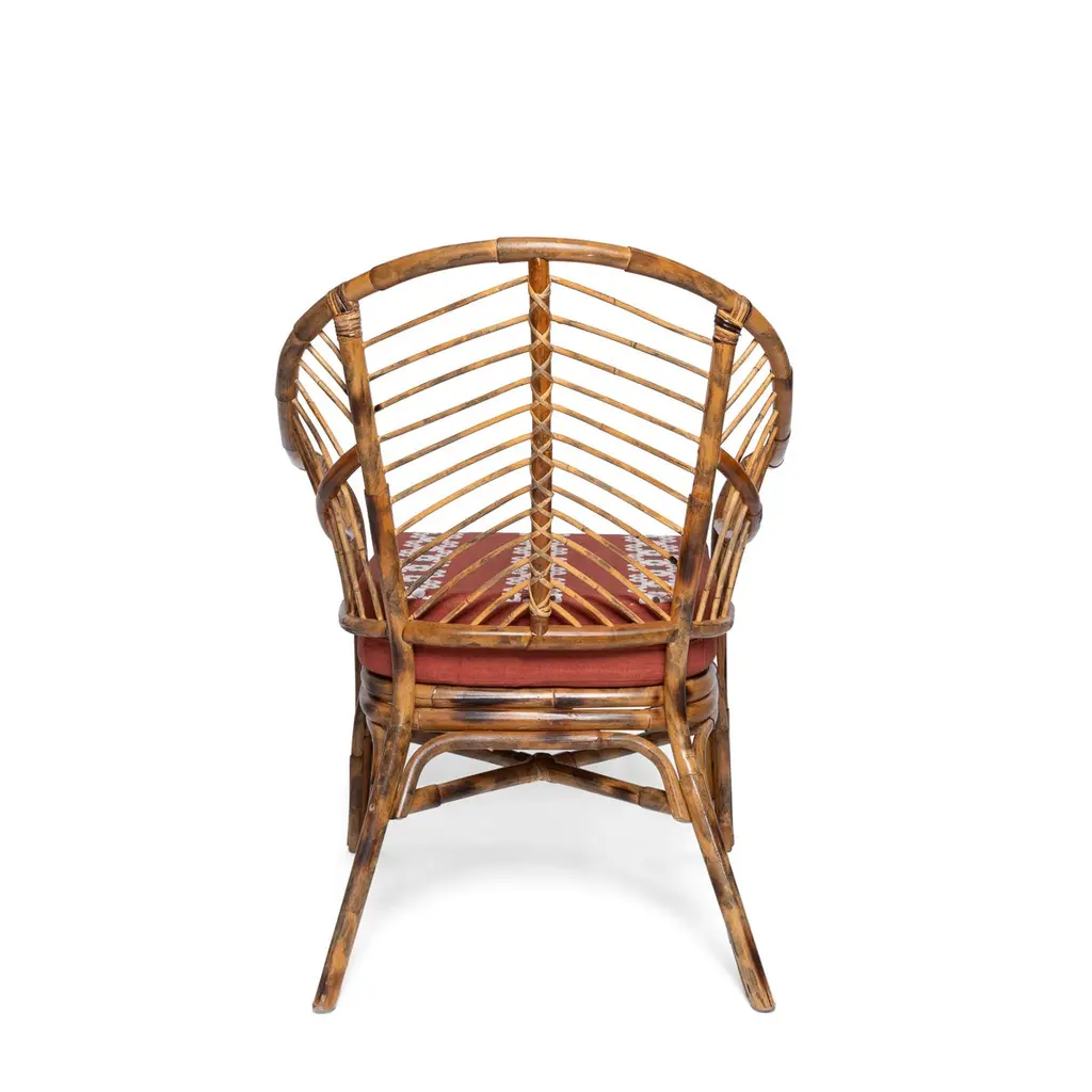 A truly versatile statement chair, designed to draw attention in the office, living room or at the dining table. Our Piolo faux bamboo chair is handcrafted from rattan and then torched, to look like antique bamboo. Choose from three cushion colourways: dusky pink, brick red or cornflower blue.52cm L x 74cm W x 94cm H20.5' L x 29' W x 37' HCare:Natural rattan is not suitable for outdoor use. Rain and direct sunlight affect the finish over time. If you need to clean your furniture, remove dust with a vacuum cleaner or dry brush. For a deeper clean, wipe down with a damp cloth, ensuring the product is completely dried afterwards.Gently scrube the furniture with a soft-bristled scrub brush and warm soapy water, then rinse with a damp sponge. You don't want to oversaturate the piece, as this can cause the bamboo to swell.