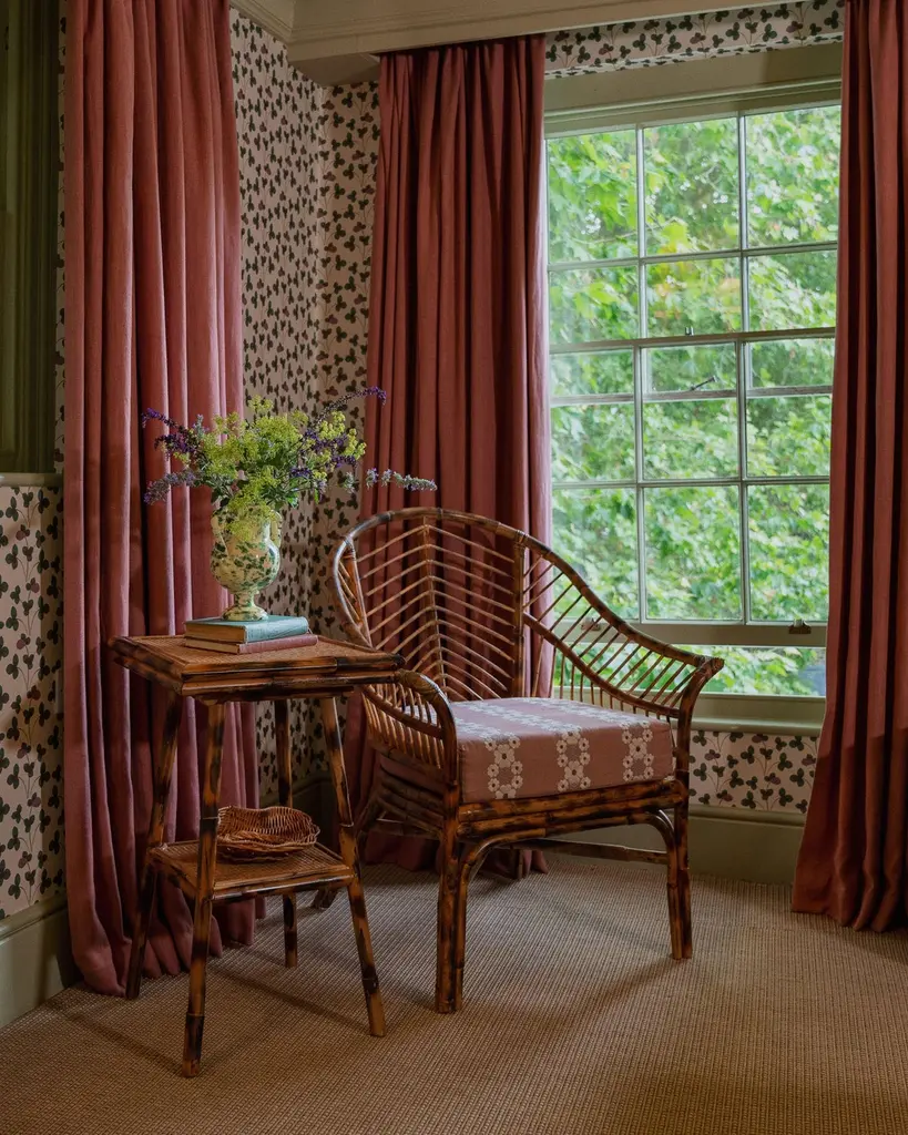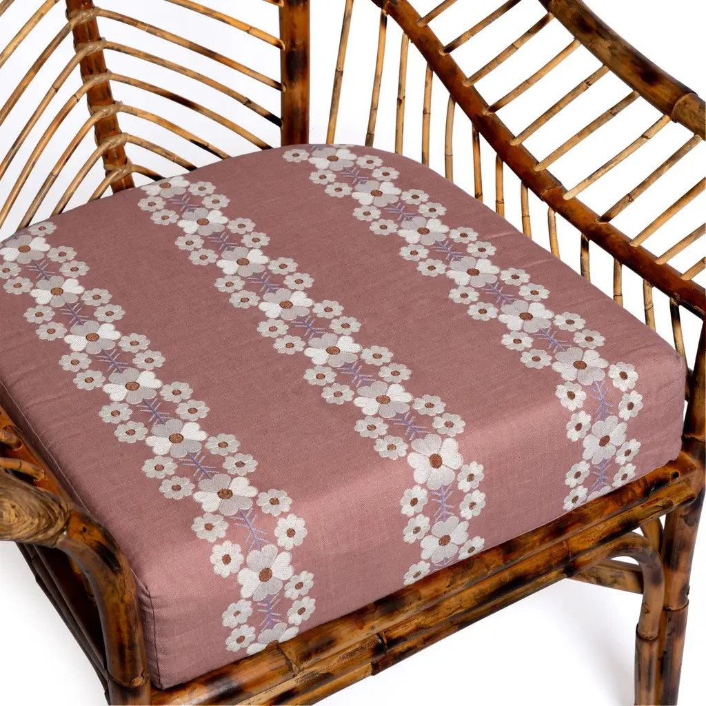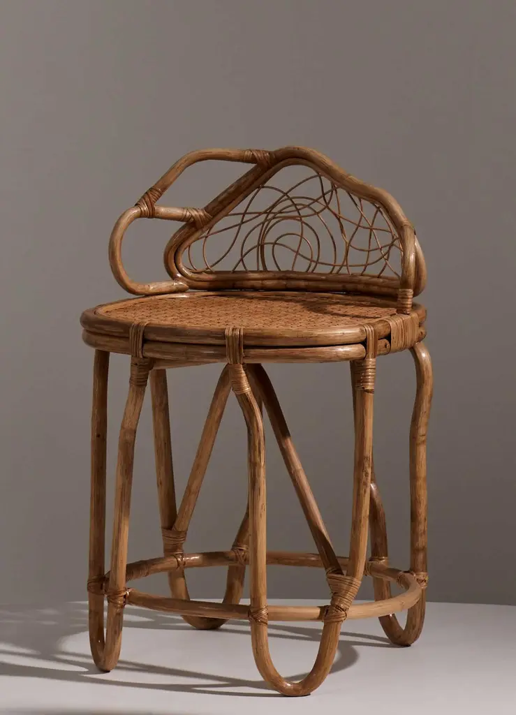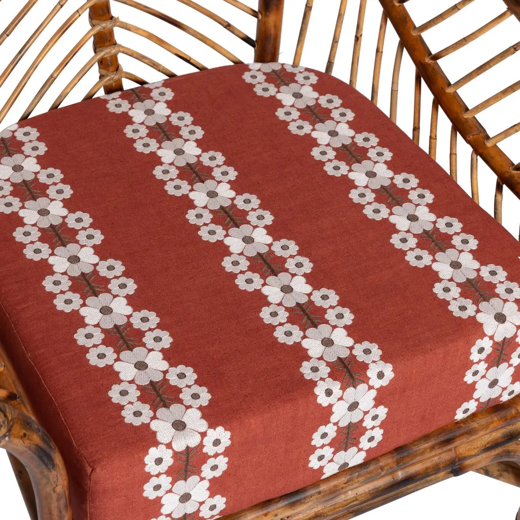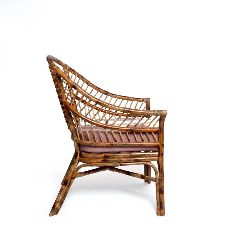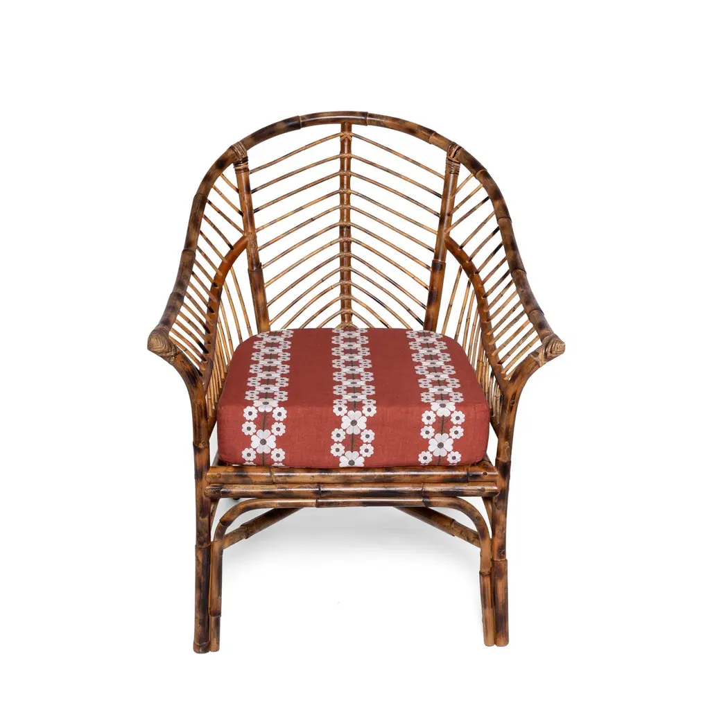A truly versatile statement chair, designed to draw attention in the office, living room or at the dining table. Our Piolo faux bamboo chair is handcrafted from rattan and then torched, to look like antique bamboo. Choose from three cushion colourways: dusky pink, brick red or cornflower blue.52cm L x 74cm W x 94cm H20.5' L x 29' W x 37' HCare:Natural rattan is not suitable for outdoor use. Rain and direct sunlight affect the finish over time. If you need to clean your furniture, remove dust with a vacuum cleaner or dry brush. For a deeper clean, wipe down with a damp cloth, ensuring the product is completely dried afterwards.Gently scrube the furniture with a soft-bristled scrub brush and warm soapy water, then rinse with a damp sponge. You don't want to oversaturate the piece, as this can cause the bamboo to swell.