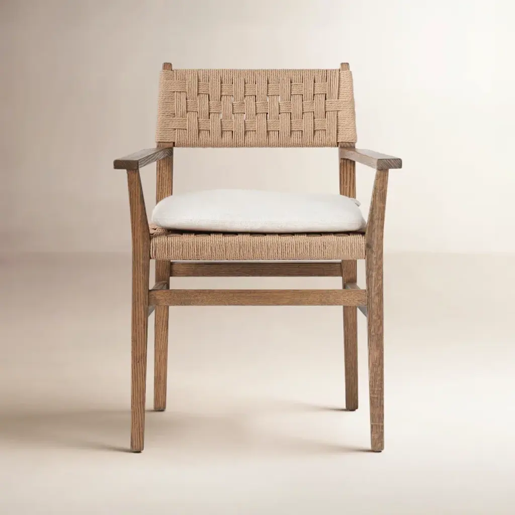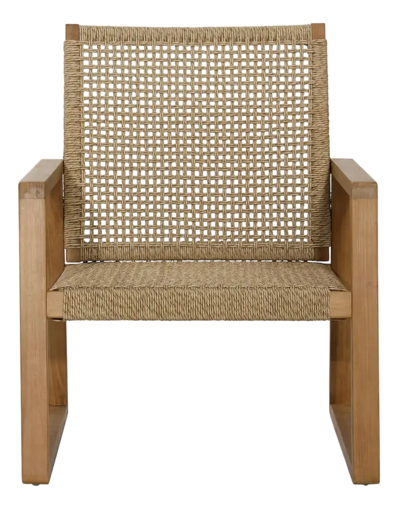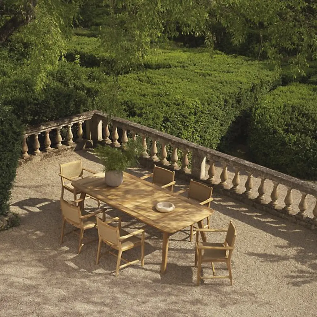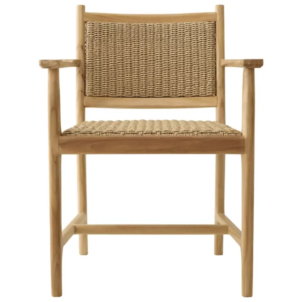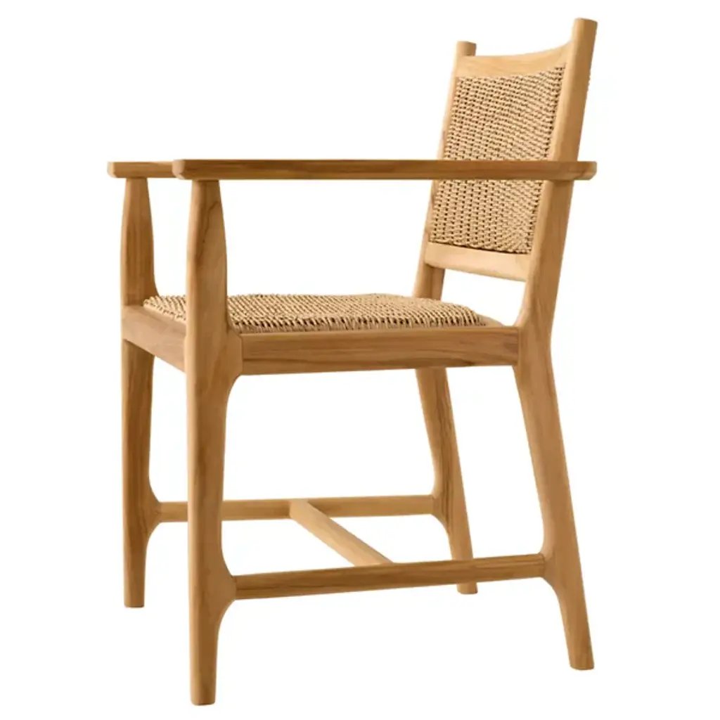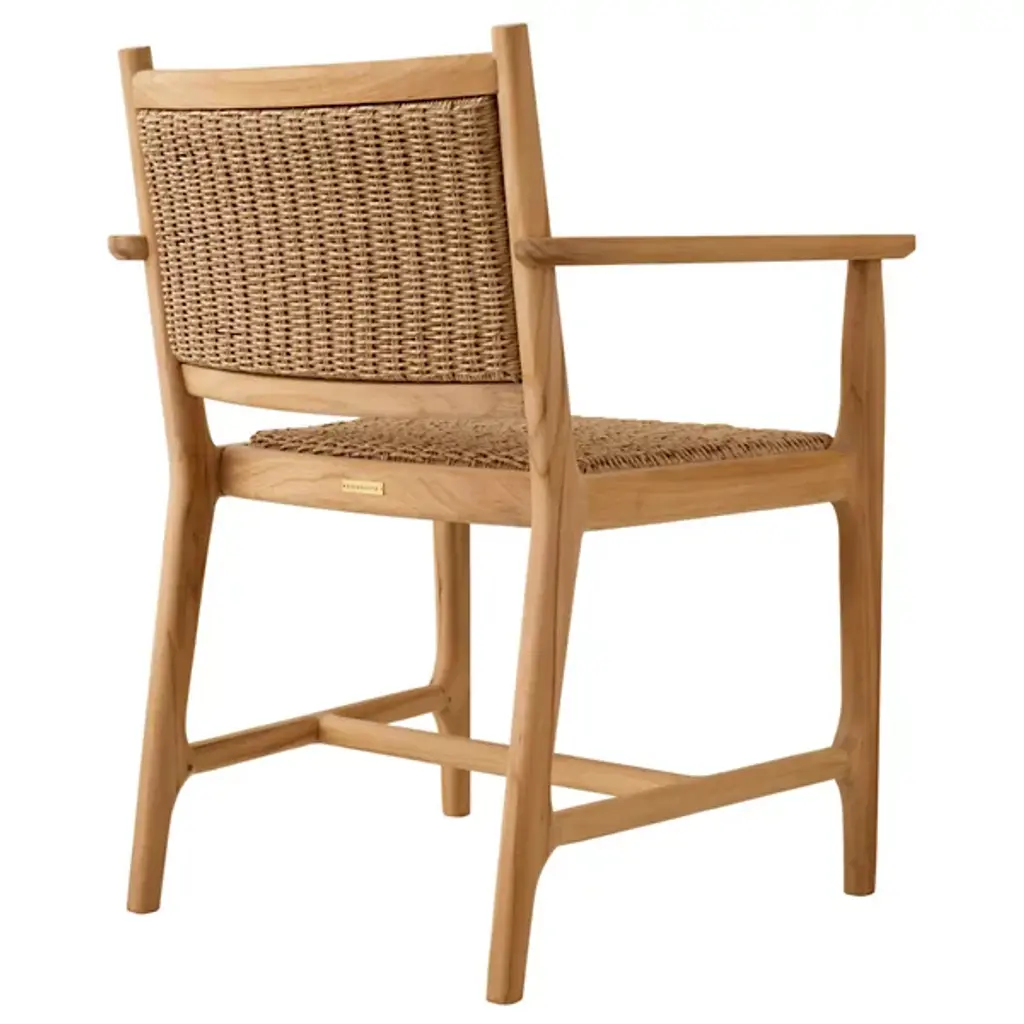 The Pivetti Outdoor Dining Armchair from Eichholtz matches the natural grain of artisan-crafted teak wood with the resilience of a polyethylene weave. Expertly handcrafted by artisans in Indonesia, this chair is made from responsibly sourced Grade A teak with a rich natural finish that patinates silver with time and use. The weave across the seat and back provides support and resists rough weather in equal measure, while the intricate woven design adds a touch of coastal charm. The chair is great for outdoor settings, combining rustic modern style with lasting comfort.