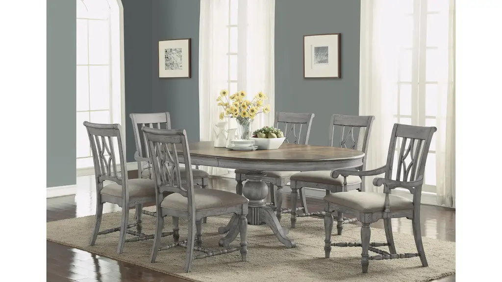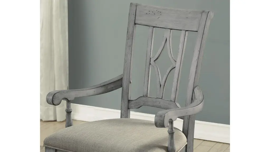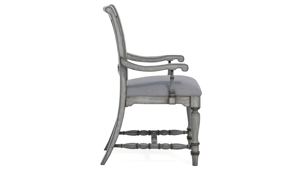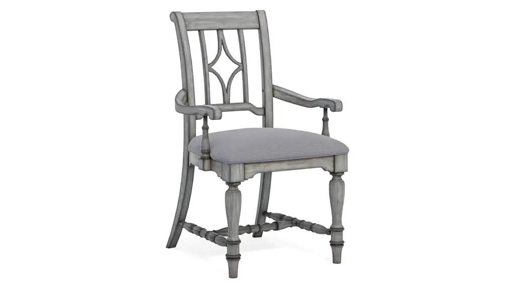 This appealing Plymouth Dining Chair (set of 2) features graceful arms, a classically styled open back with a diamond-shaped detail, intricately carved trestles and turned legs to bring vintage charm and character to dining spaces. Available in a weathered graywash finish, each version is upholstered in a durable and cleanable coordinating fabric, providing comfort for long periods of sitting.