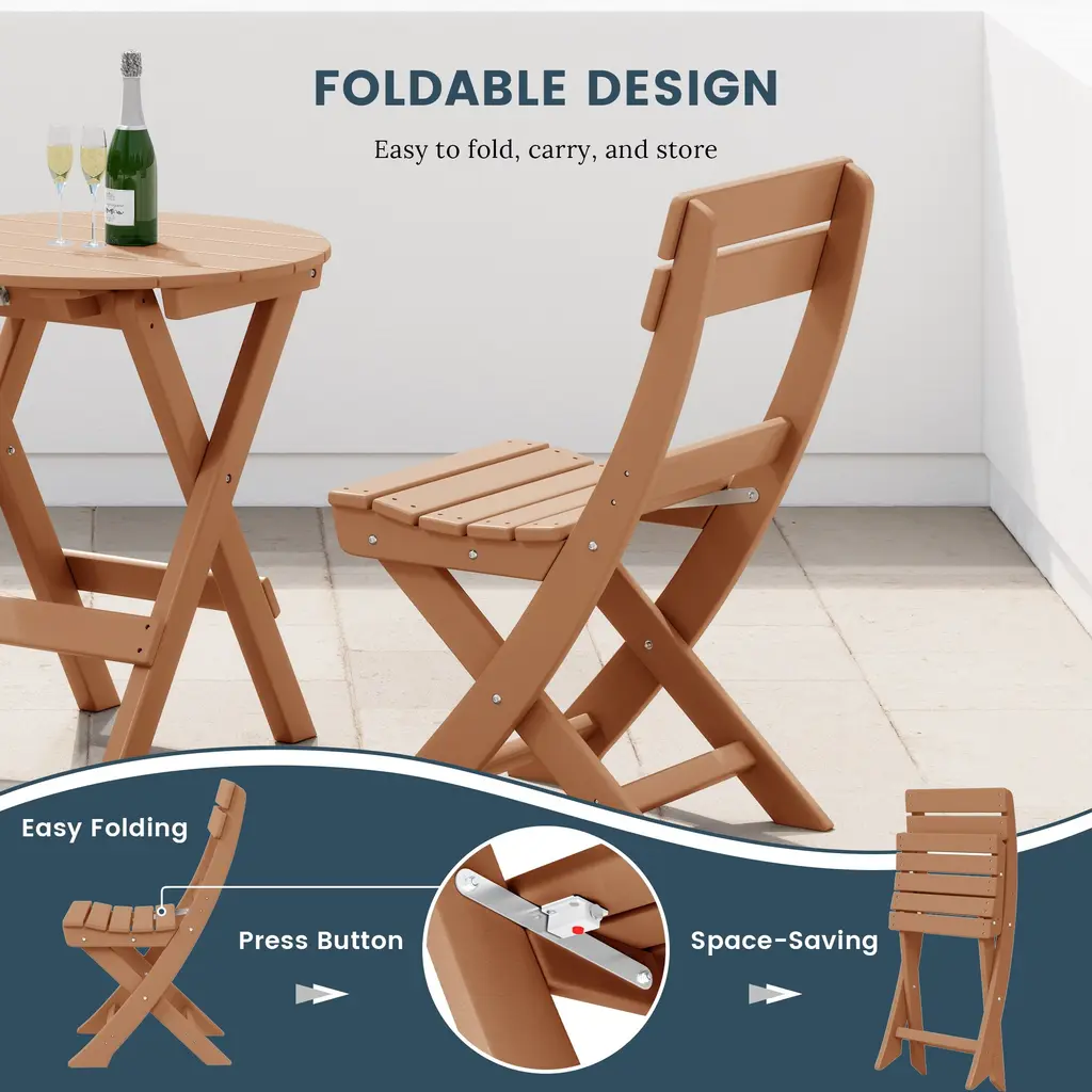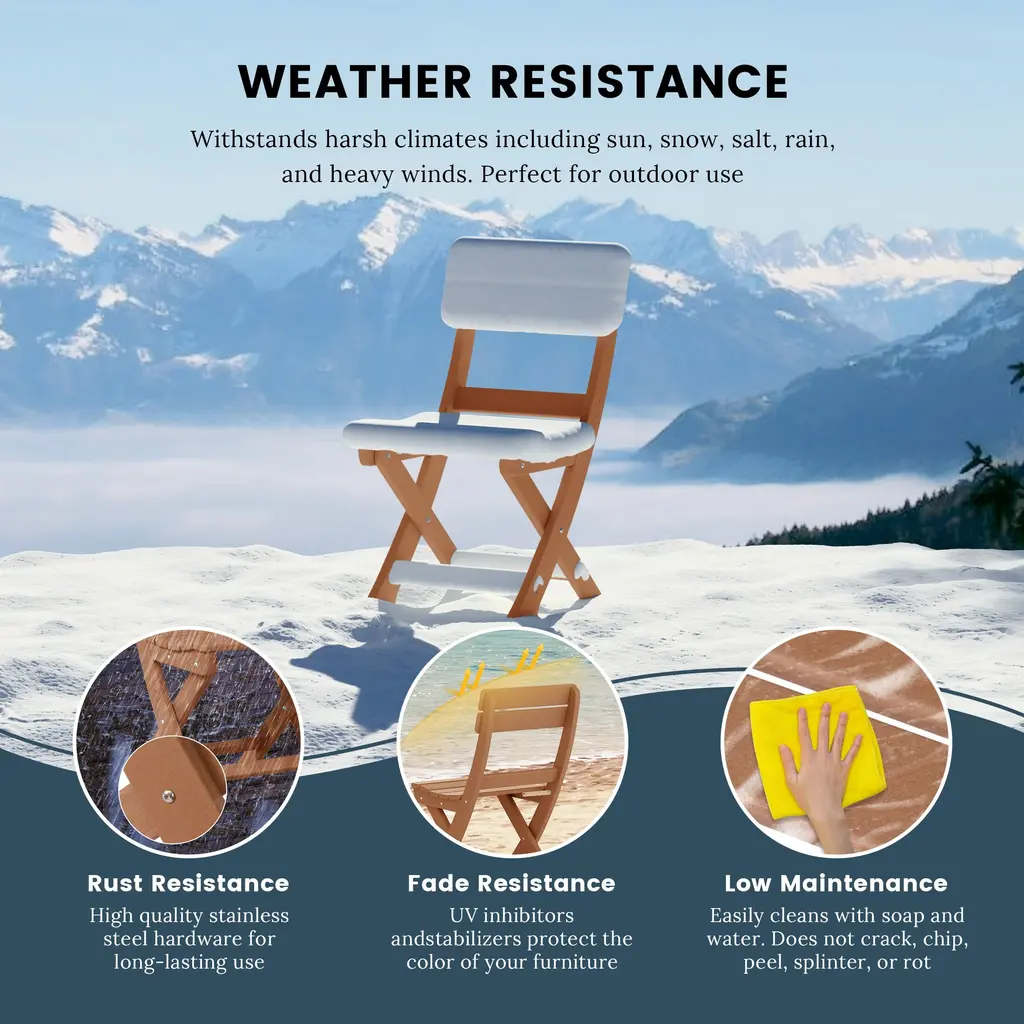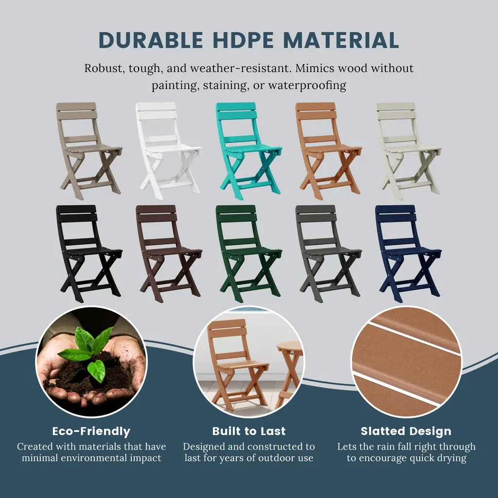 Whether it's a romantic date on the beach or just a casual day out in the backyard, this portable folding dining chair is the perfect choice for any occasion. Made with a durable HDPE all-weather material that is resilient to the outdoors, its UV and fade-resistant properties are ideal for protection against the outdoors. Easy to fold when not in use saves plenty of storage space when folded and is easy to move as well. Stable design with the X-frame leg design that provides the legs better stability to the floor to reduce wobbling.While we strive to accurately represent product colors, please be aware that actual colors may vary slightly due to individual screen settings and lighting conditions. FeaturesDetails: