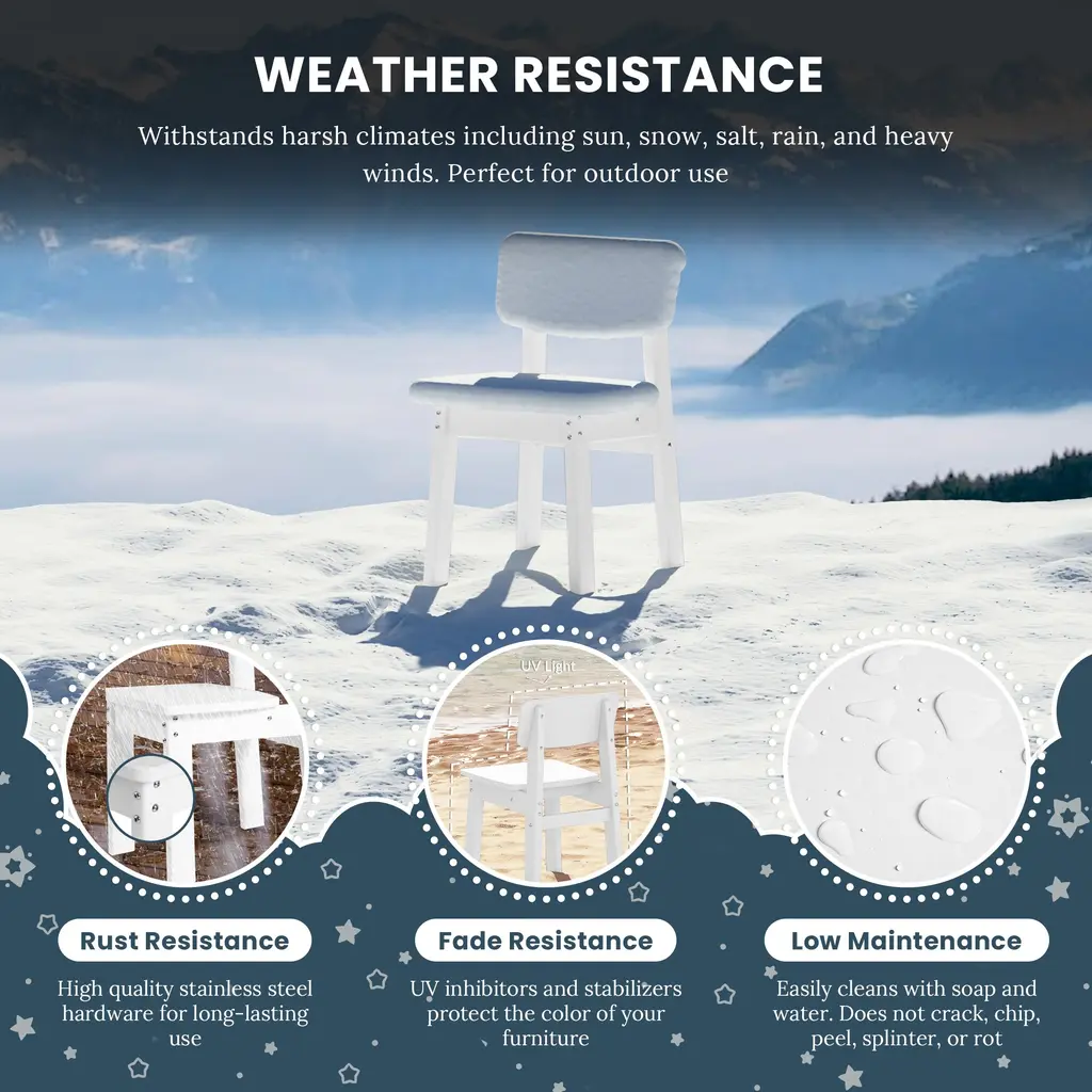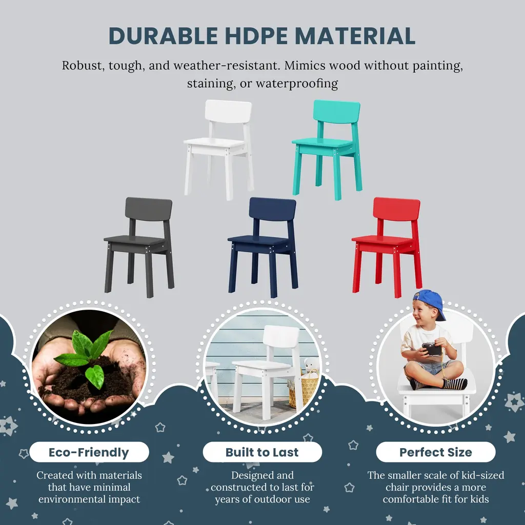 Our adorable Outdoor Kids Plastic Patio Dining Chair is the perfect outdoor companion for your little ones. Designed not only for durability but with also safety in mind to protect your little ones with a durable HDPE material and stable construction that ensures you little one is safe. Smooth edges and a wide seat that gives your little one plenty of sitting space and safety to ensure they don't hurt themselves. Simple and easy to clean since we know littles ones love showing their creative side. Give your little one the perfect kids patio dining chair that will add charm to your patio or your little ones play room.While we strive to accurately represent product colors, please be aware that actual colors may vary slightly due to individual screen settings and lighting conditions. FeaturesDetails:Dining Chair
