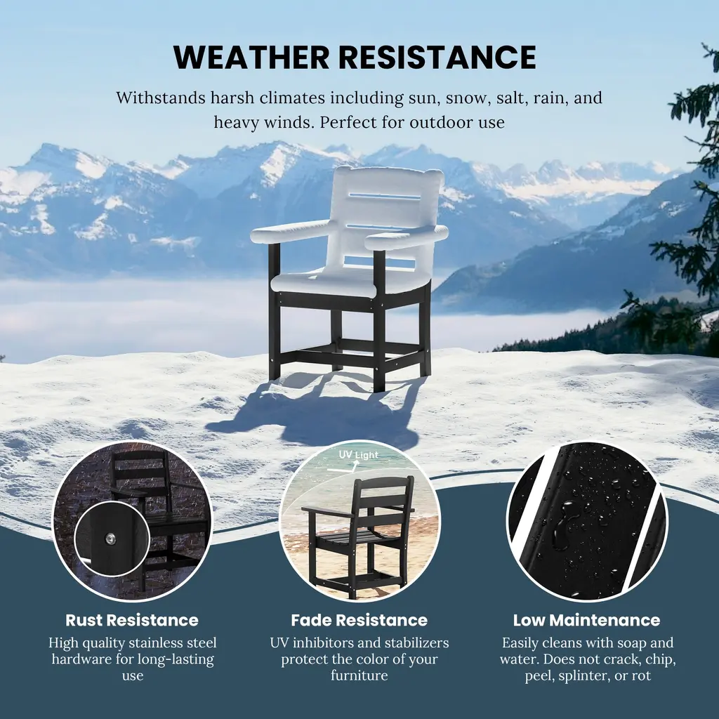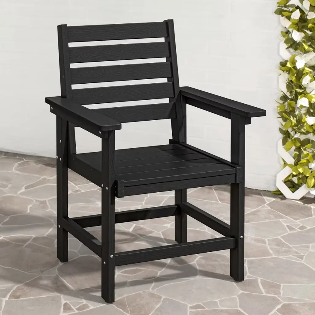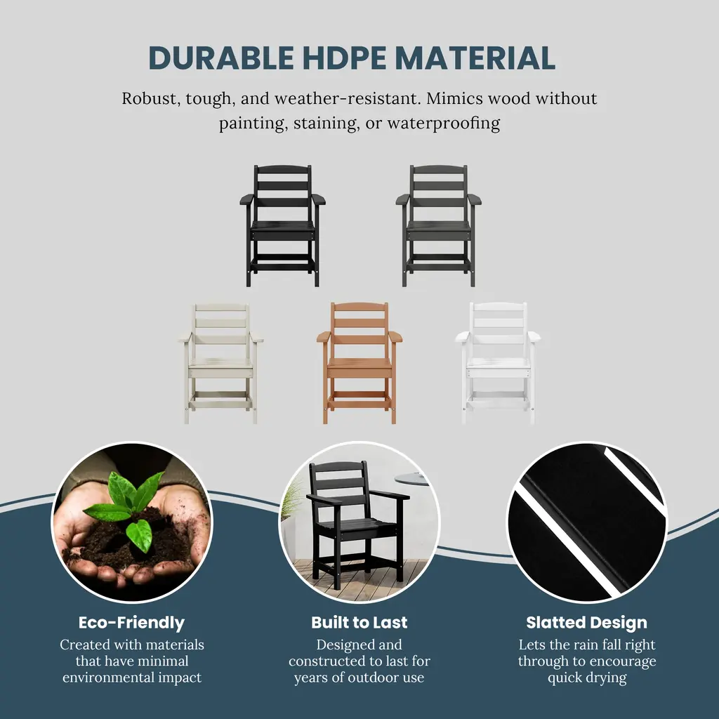 Gather around and make memories while sharing your favorite meals with this charming and long-lasting All-Weather Outdoor Patio Dining Arm Chair. Crafted from durable HDPE material, it is perfect for the outdoors with its UV resistance. The contoured seat provides relief to your lower half, offering a more ergonomic and comfortable seating experience. Make this the chair of choice for all your outdoor dining occasions and bring comfort and enjoyment to your gatherings with loved ones this seasonWhile we strive to accurately represent product colors, please be aware that actual colors may vary slightly due to individual screen settings and lighting conditions. FeaturesDetails:Arm Chair