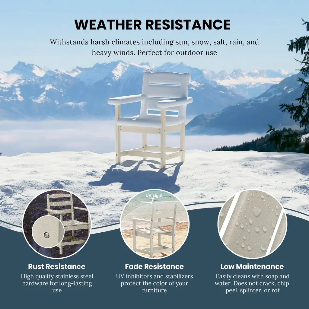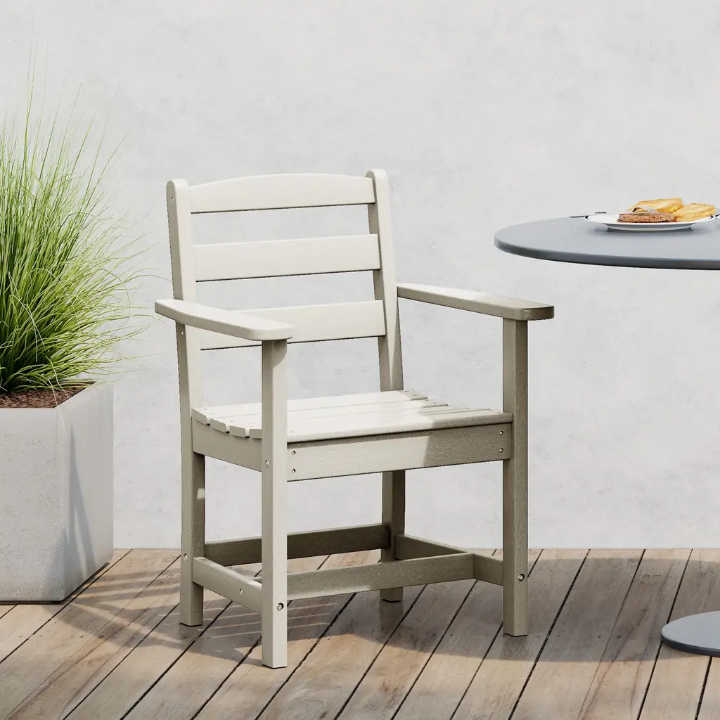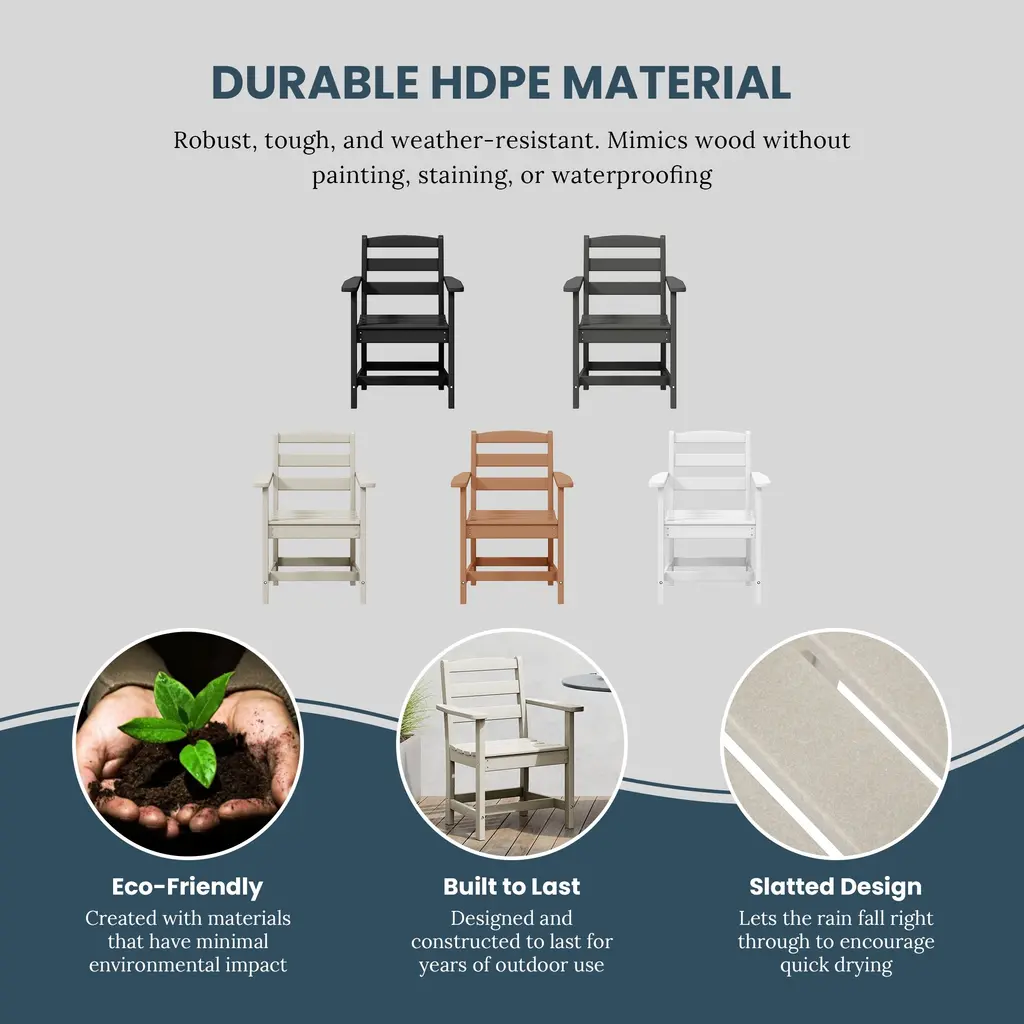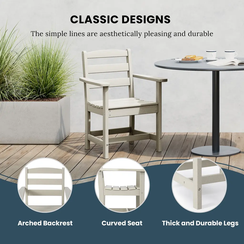 Gather around and make memories while sharing your favorite meals with this charming and long-lasting All-Weather Outdoor Patio Dining Arm Chair. Crafted from durable HDPE material, it is perfect for the outdoors with its UV resistance. The contoured seat provides relief to your lower half, offering a more ergonomic and comfortable seating experience. Make this the chair of choice for all your outdoor dining occasions and bring comfort and enjoyment to your gatherings with loved ones this seasonWhile we strive to accurately represent product colors, please be aware that actual colors may vary slightly due to individual screen settings and lighting conditions. FeaturesDetails:Arm Chair