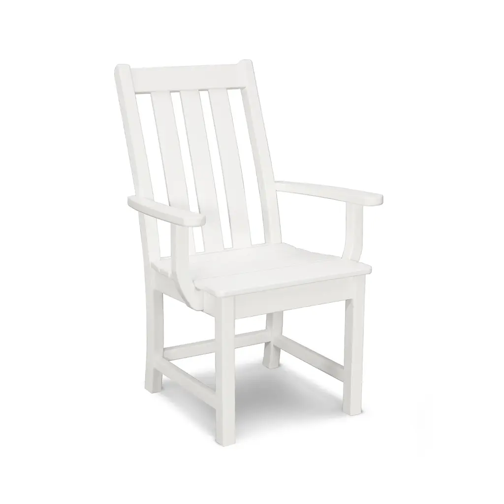 The Vineyard Dining Arm Chair adds a charming gentility to any outdoor dining area. A subtly arched 3-slat back provides comfortable support while the traditional clean lines offer a timeless style complementary to all surroundings. Whether enjoying a delightful brunch in the garden or a lively mid-summer barbeque with family and friends, these dining chairs are sure to suit your needs precisely.Our POLYWOOD® Vineyard Outdoor Furniture is made in the USA from genuine POLYWOOD® lumber and marine-grade hardware, ensuring fade-resistance, mildew-resistance and weather-resistance.