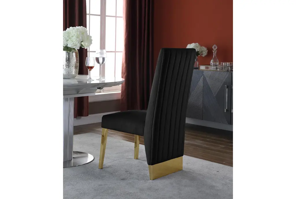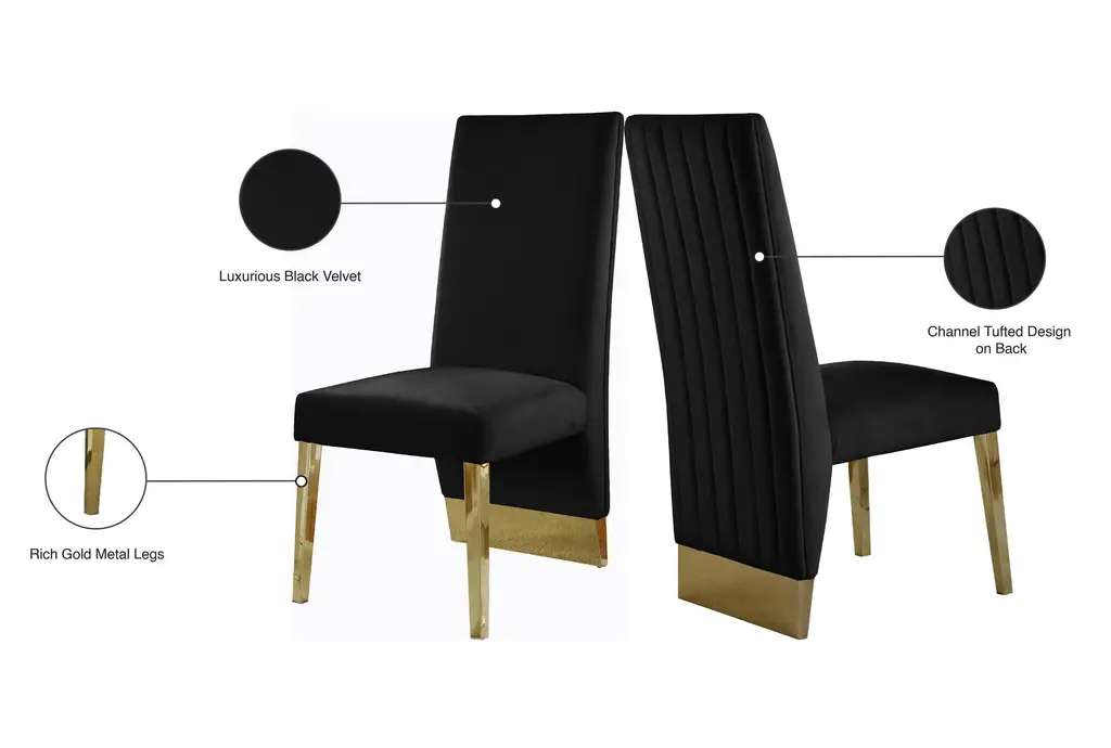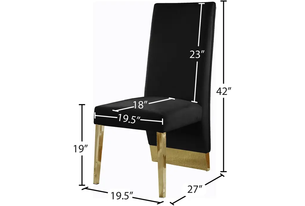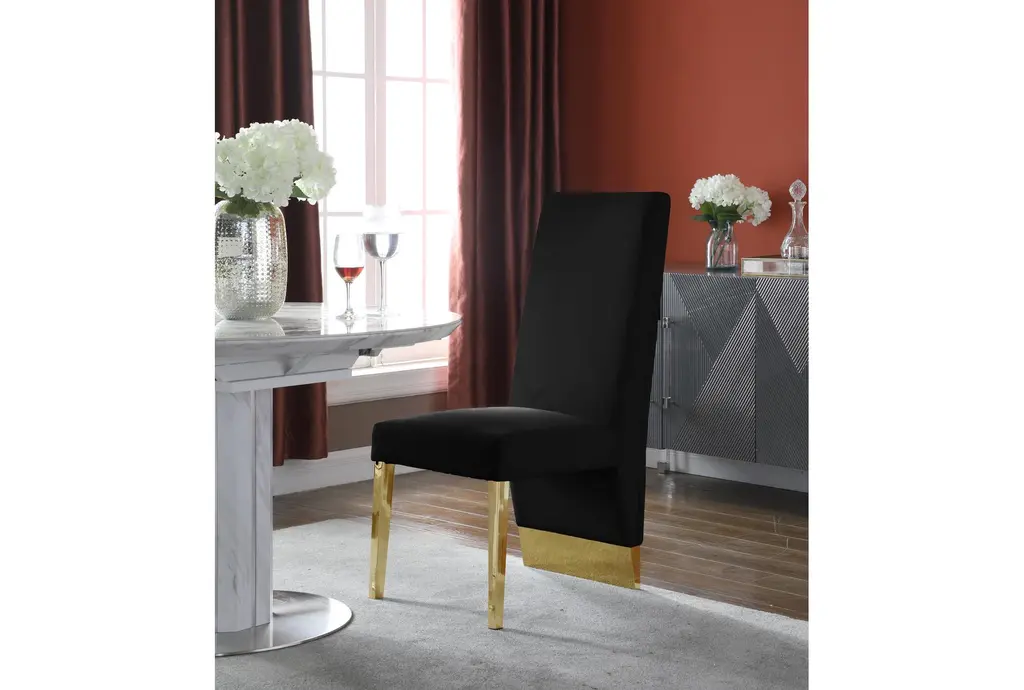 Enhance your dining room with the Porsha Black Velvet Dining Chair With Gold Finish Set Of 2. These modern chairs offer a luxurious velvet surface to elevate your dining experience. The gold finish on the legs adds a touch of sophistication to your space.