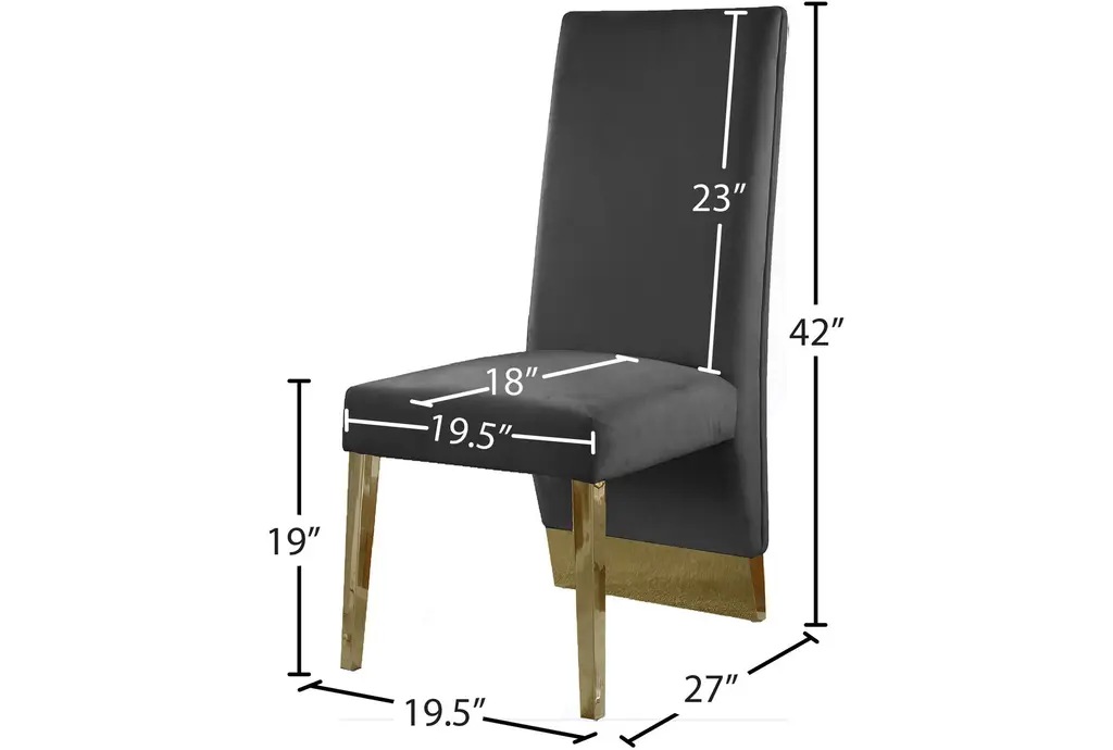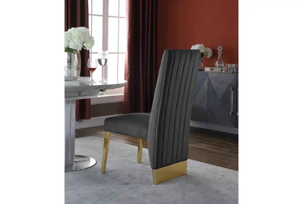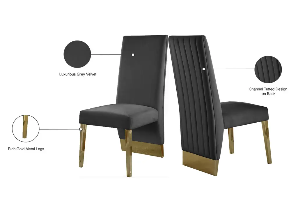 Enhance your dining experience with the Porsha Grey Velvet Dining Chair with Gold Finish, Set of 2. These modern chairs feature plush velvet upholstery and a striking gold finish on the legs, making them a stylish and comfortable addition to any dining room. The set of 2 chairs provides a cohesive look for your dining space.