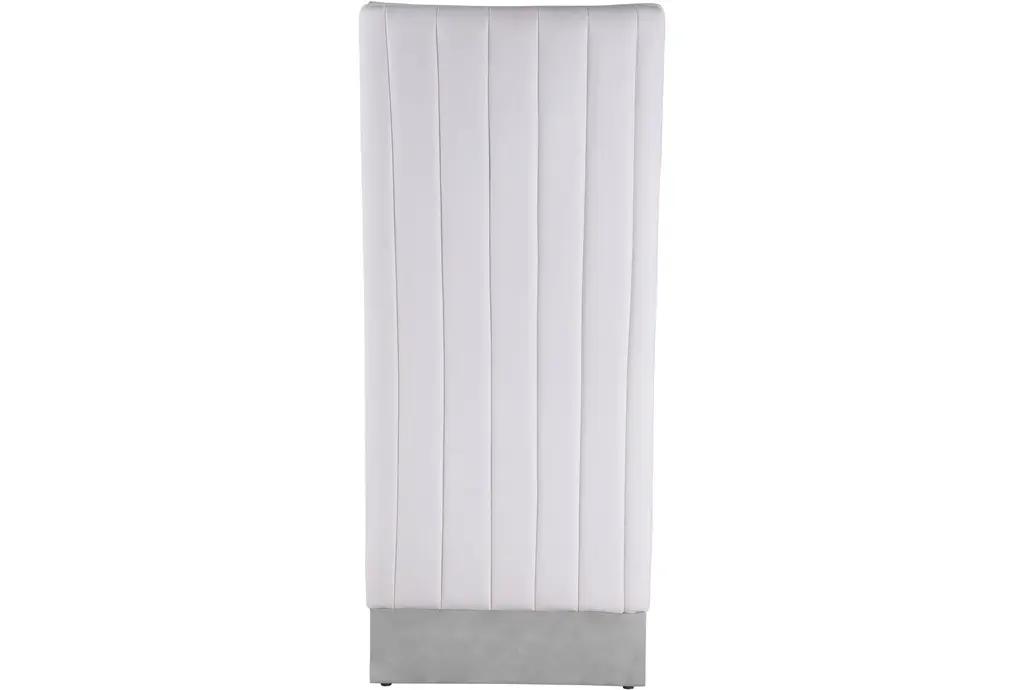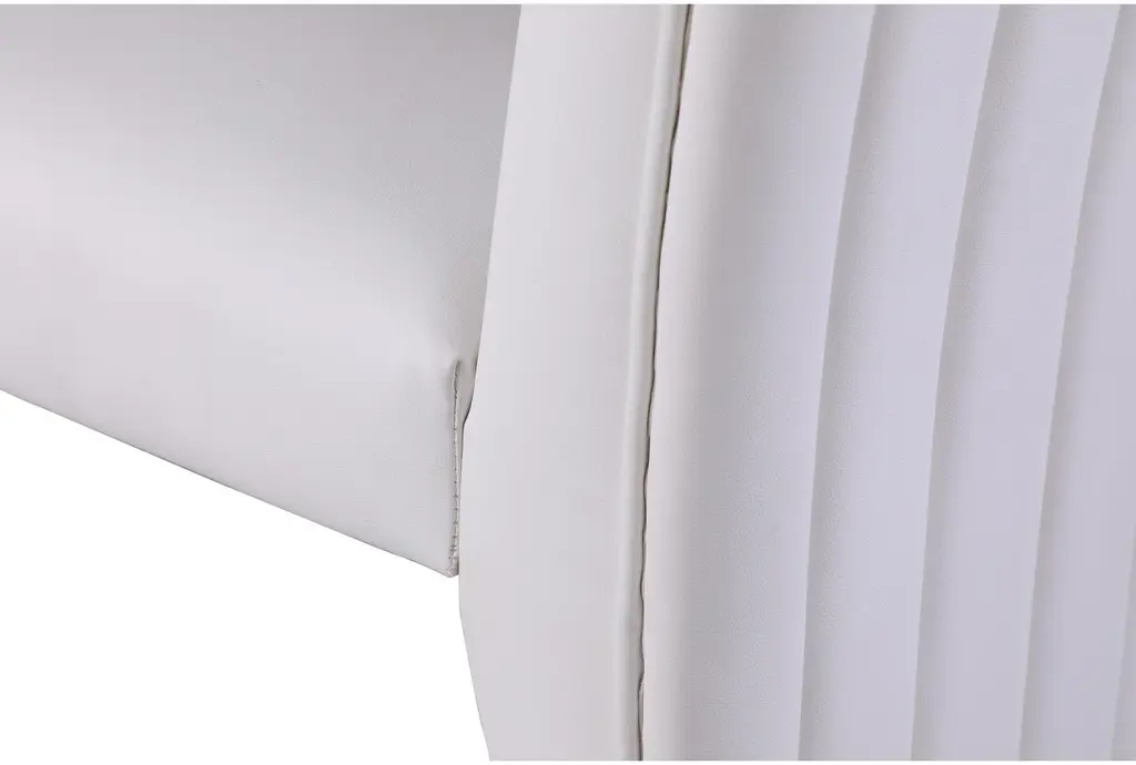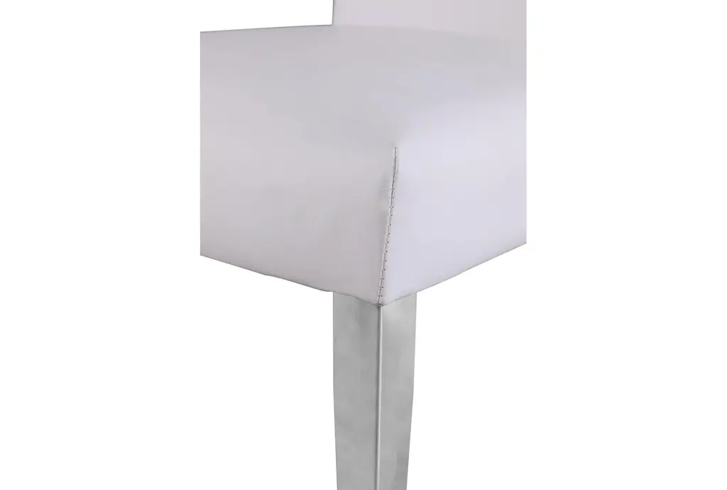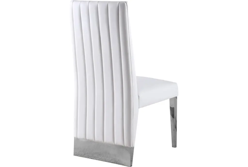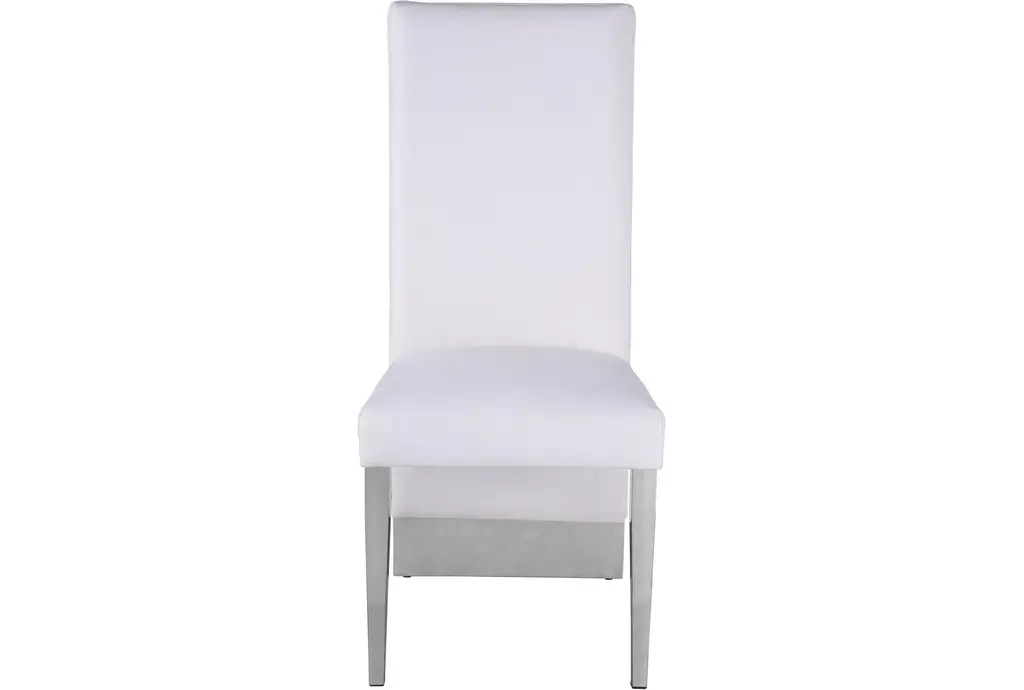 Introducing the Porsha White Vegan Faux Leather Dining Chair with Chrome Finish Set of 2. Elevate your dining room with these modern chairs featuring a soft white color and polished chrome legs. Perfect for any dining space, these armless chairs offer both comfort and style.