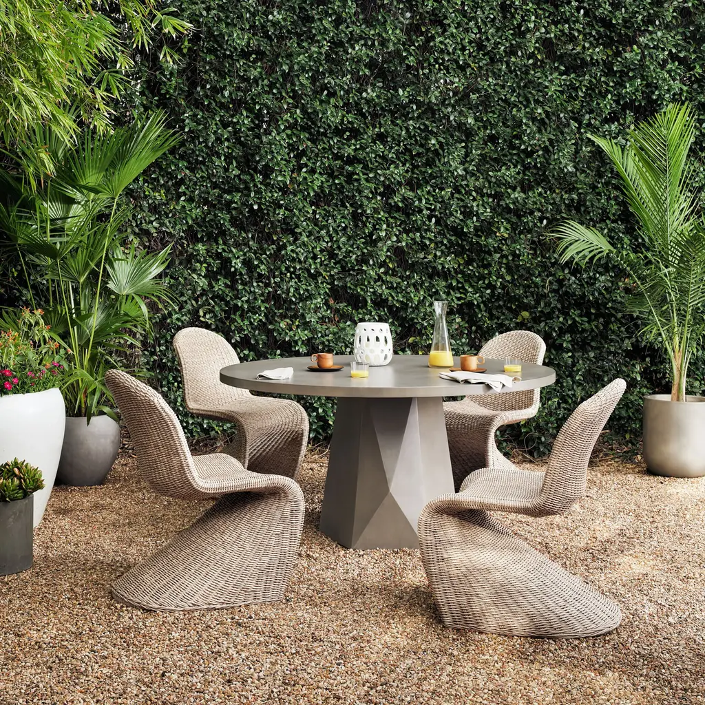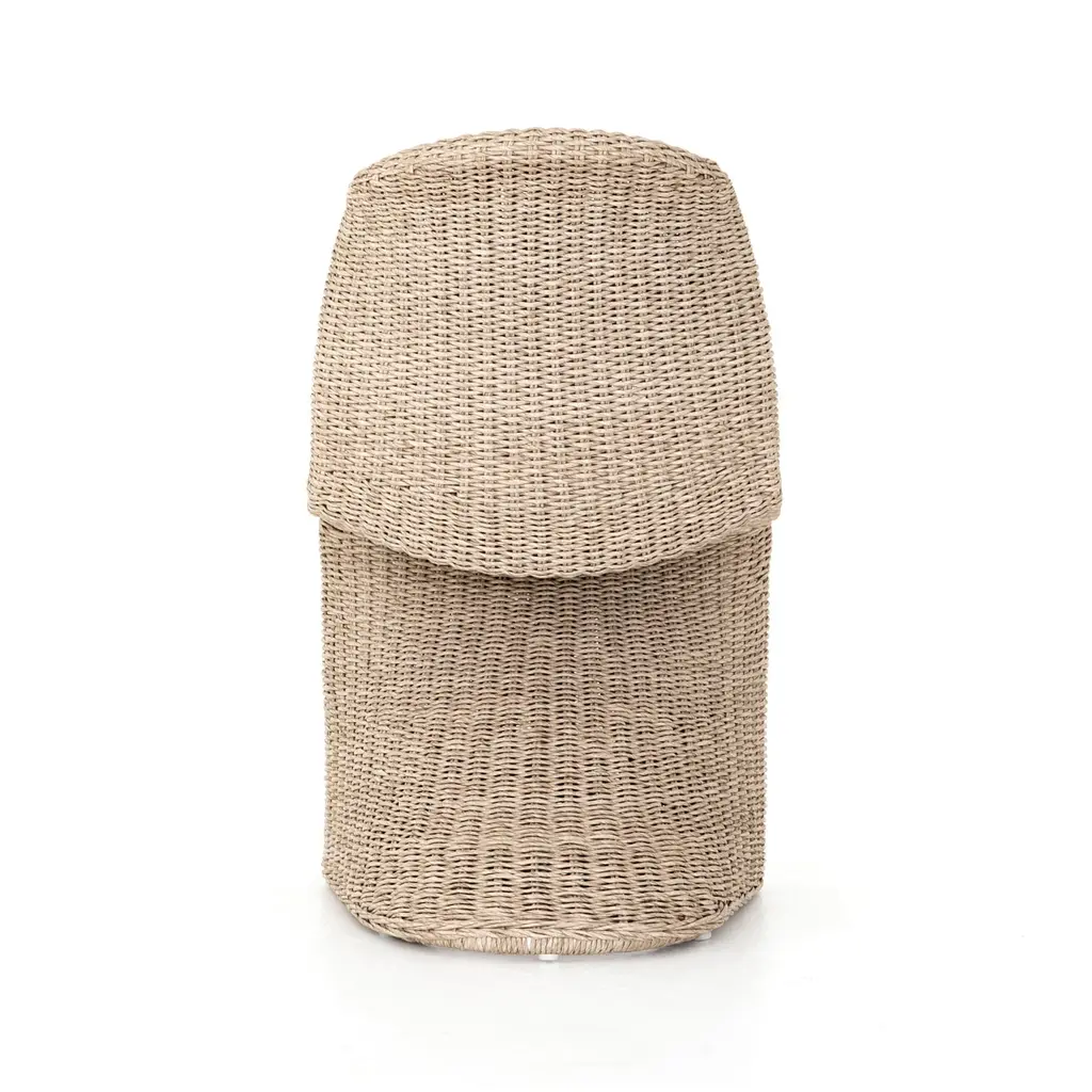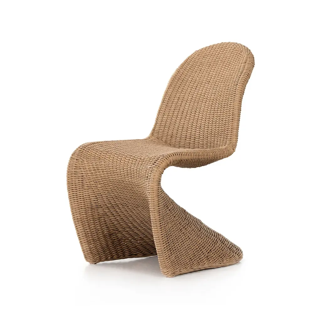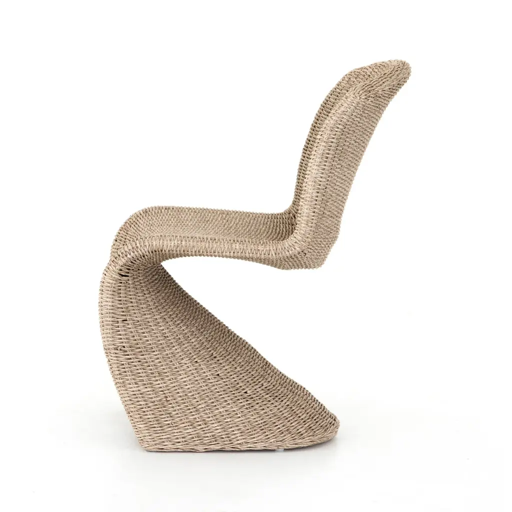 Elevate your outdoor dining experience with the Portia Dining Chair from Four Hands, a perfect blend of sophistication and strength. Its all-weather wicker seating is expertly crafted into a seductive "S" shape, adding shapely intrigue to your space. Finished in a vintage white, this chair is built to withstand the elements, providing year-round comfort and style. Highlights