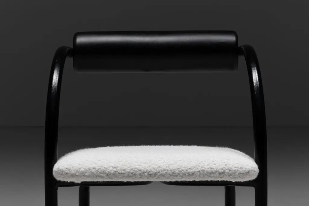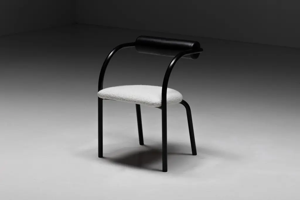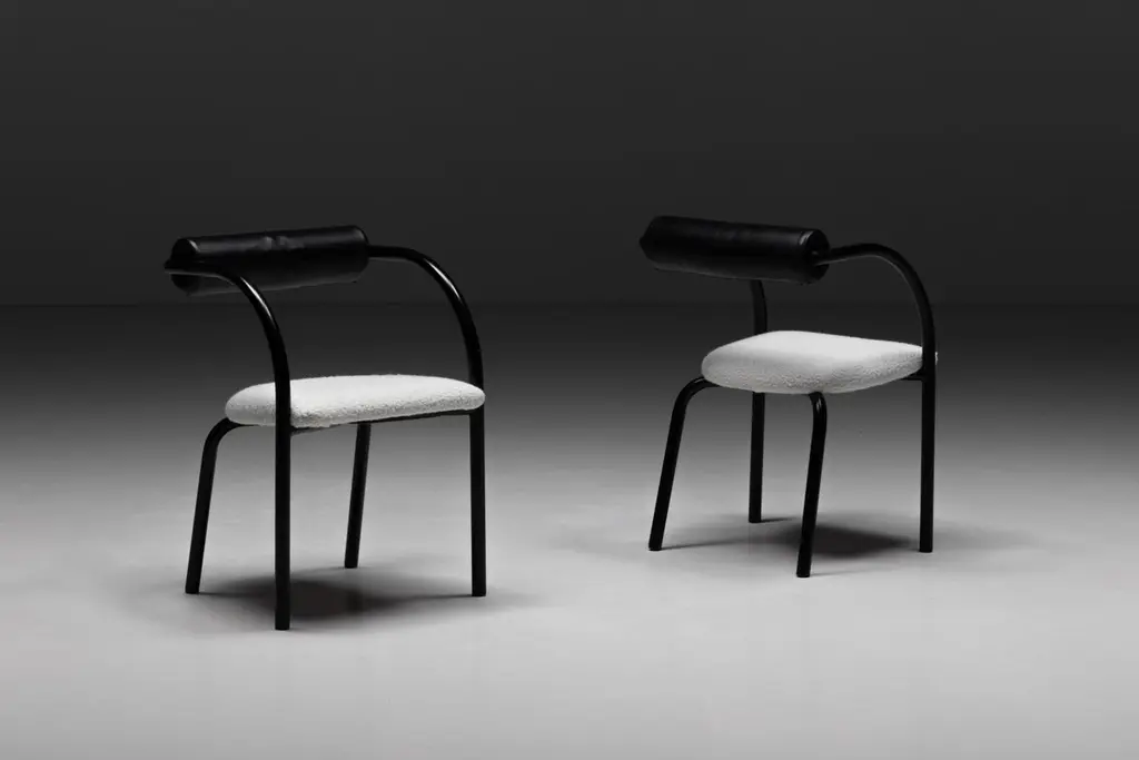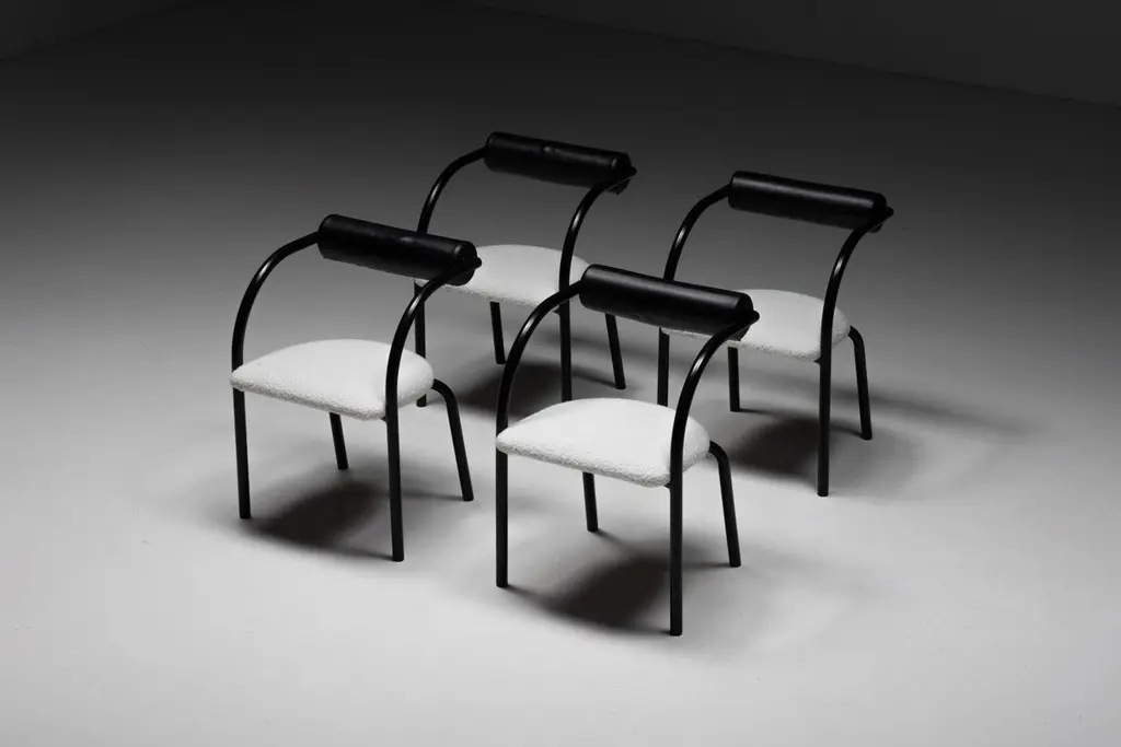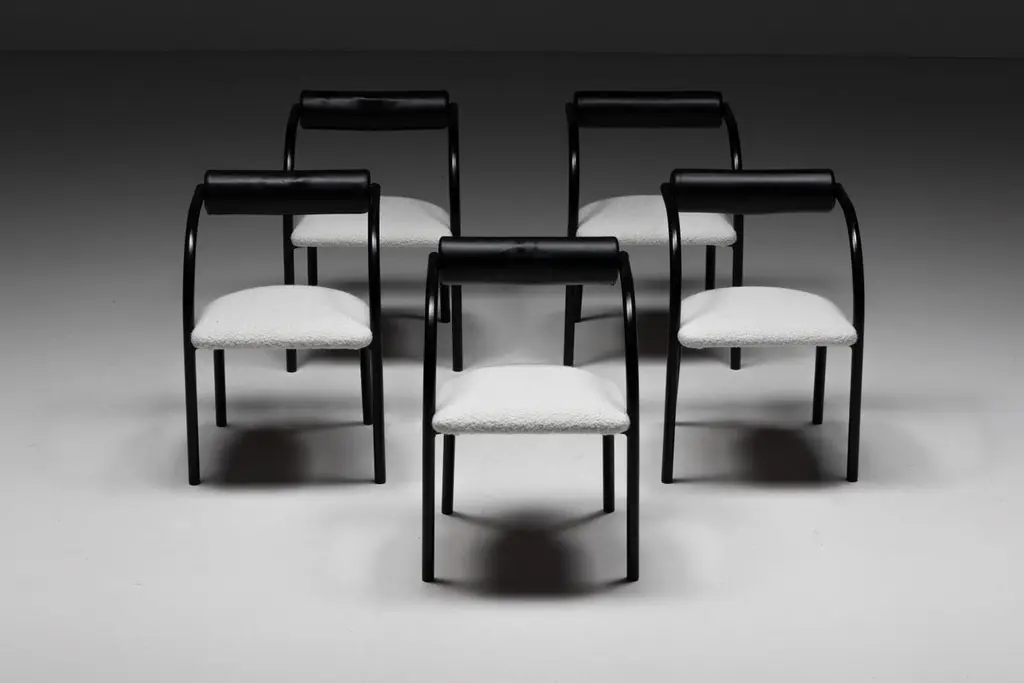 Postmodernism; Denmark; 1980s; Dining Chairs; Armchairs; Mid-Century Modern; Modernist Design; Italian Design; Danish Design;Post-modern dining chairs, a perfect blend of elegance and contemporary style. These chairs are crafted with meticulous attention to detail, featuring black lacquered metal tubular frames that exude a sleek and sophisticated appeal. The contrasting combination of a black leather cushion on the backrest and white bouclé fabric seats creates a striking visual contrast, making these chairs stand out in any dining setting. These chairs, originating from the 1980s, are in good condition and priced per piece. We have 5 chairs available.