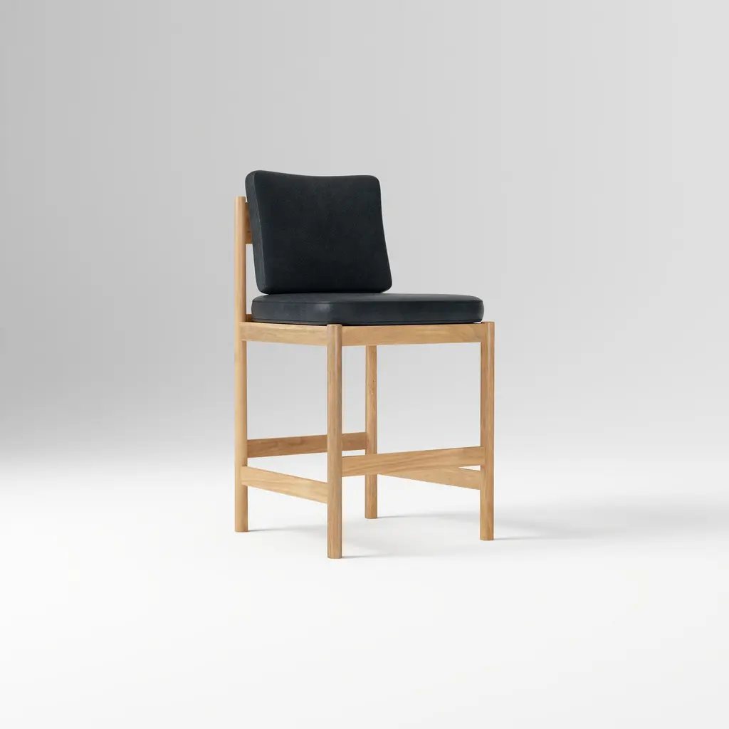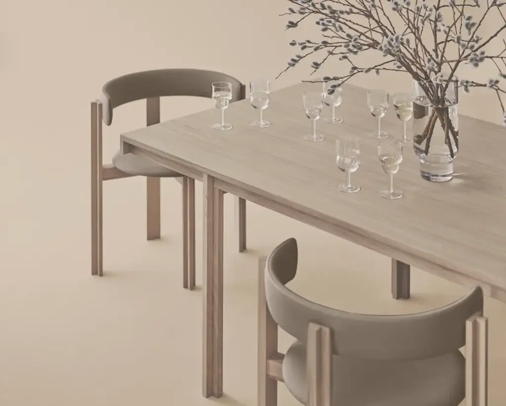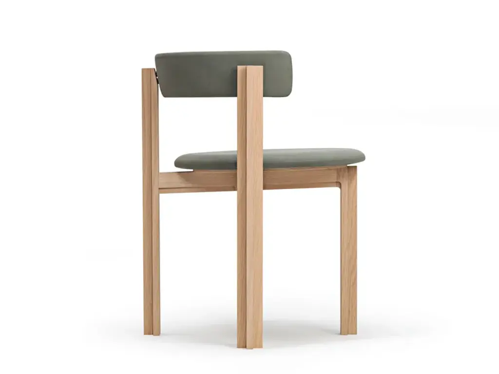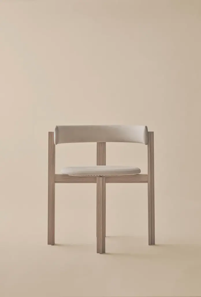 Principal is a wood chair with integrated cushion.Material: Solid oak or walnutFinish: Matte clear lacqueredUpholstery: Seat and backrest in leather from Sørensen Leather or fabric from Kvadrat.Versions:Solid oak, naturalSolid oak, white stainedSolid oak, smoke stainedSolid walnutOne of the last living mid-century Scandinavian design pioneers and a female pioneer in the field of architecture in her time, Bodil Kjær, conceived her Principal series in 1961 as part of an architectural exploration of interior solutions for modern living, called Elements of Architecture. Comprising a dining table and an upholstered dining chair, the Principal series epitomises Kjær’s forward-thinking cosmopolitan outlook and modernistic design language that slips fluidly into contemporary interior.The solid wood dining table boasts a clarified form, repeating a simple angle throughout table legs and ends of the table top, while the dining chair with its circular seat and gently rounded backrest, beautifully upholstered, adds a softness to the clear, unfussed geometry, an invitation to linger.