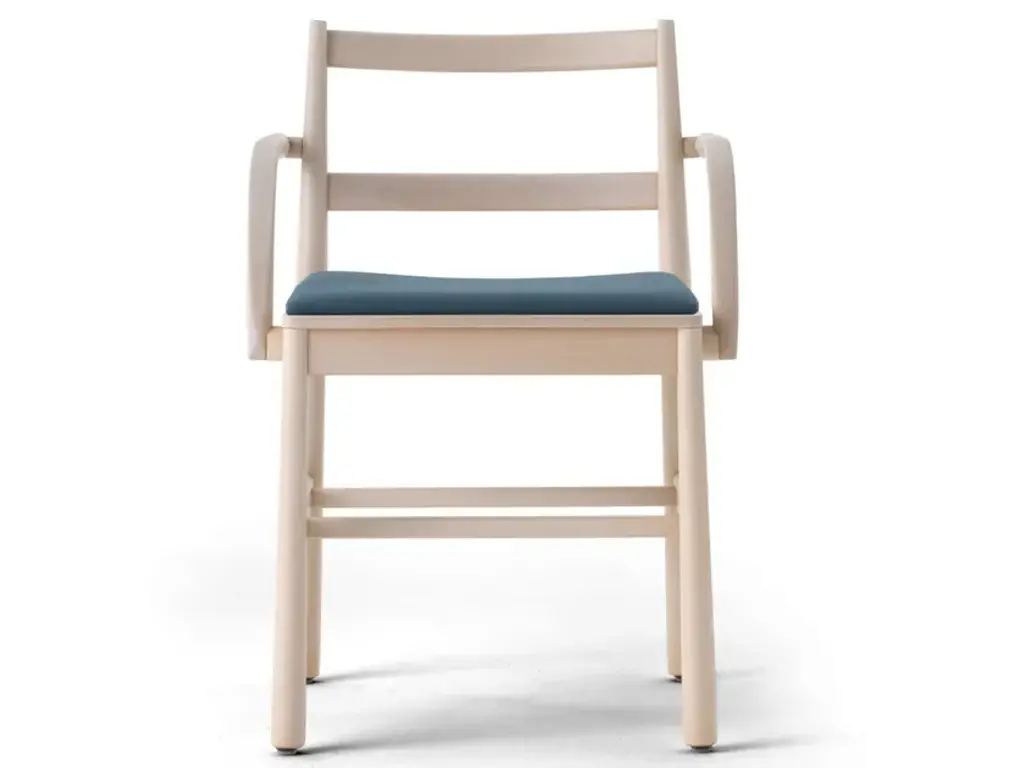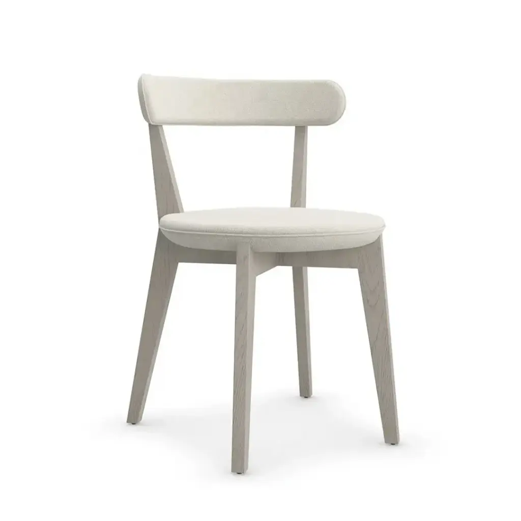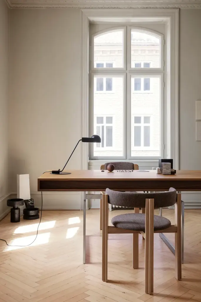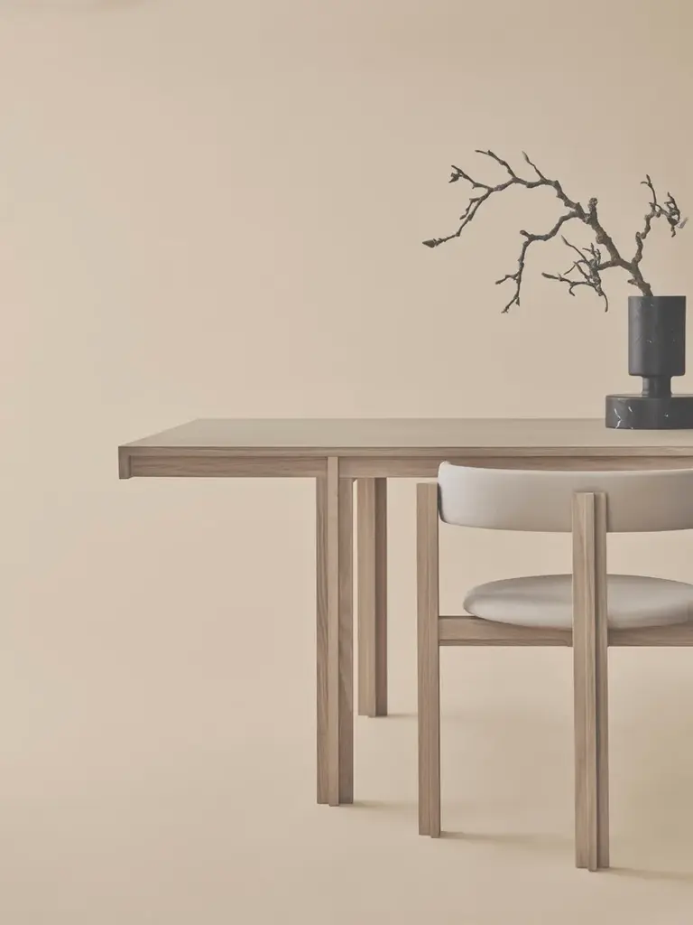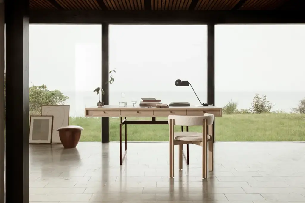 Principal is a wood chair with integrated cushion.Material: Solid oak or walnutFinish: Matte clear lacqueredUpholstery: Seat and backrest in leather from Sørensen Leather or fabric from Kvadrat.Versions:Solid oak, naturalSolid oak, white stainedSolid oak, smoke stainedSolid walnutOne of the last living mid-century Scandinavian design pioneers and a female pioneer in the field of architecture in her time, Bodil Kjær, conceived her Principal series in 1961 as part of an architectural exploration of interior solutions for modern living, called Elements of Architecture. Comprising a dining table and an upholstered dining chair, the Principal series epitomises Kjær’s forward-thinking cosmopolitan outlook and modernistic design language that slips fluidly into contemporary interior.The solid wood dining table boasts a clarified form, repeating a simple angle throughout table legs and ends of the table top, while the dining chair with its circular seat and gently rounded backrest, beautifully upholstered, adds a softness to the clear, unfussed geometry, an invitation to linger.