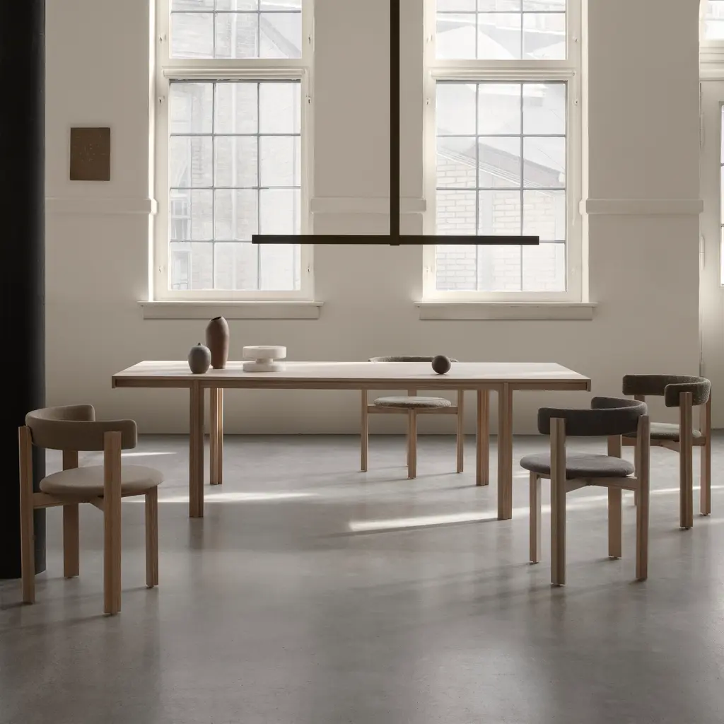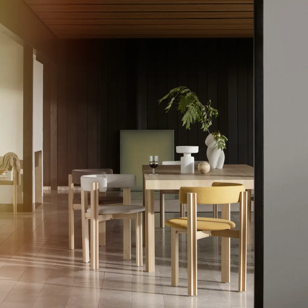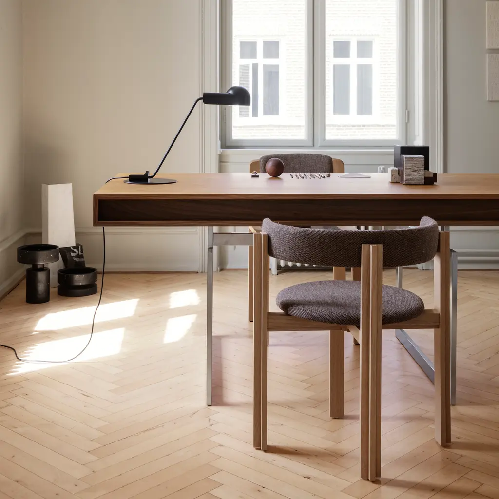 A pioneering woman in her field, Bodil Kjær debuted her dining chair in 1961 as part of the Principal series with an architectural slant. Cache features a smartly upholstered circular seat and rounded backrest that offsets the geometry of the straight-lined wood framework. Clad in a choice of leather or fabric, the Danish designer’s seating is crafted in either solid oak or walnut with a clear matte lacquer to go with the matching dining table (also at A&R) from Copenhagen maker Karakter.