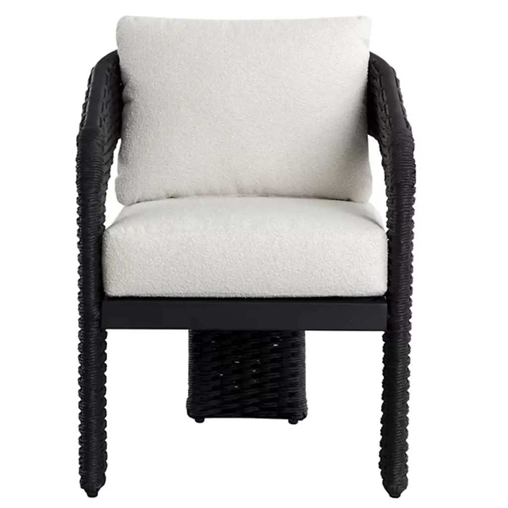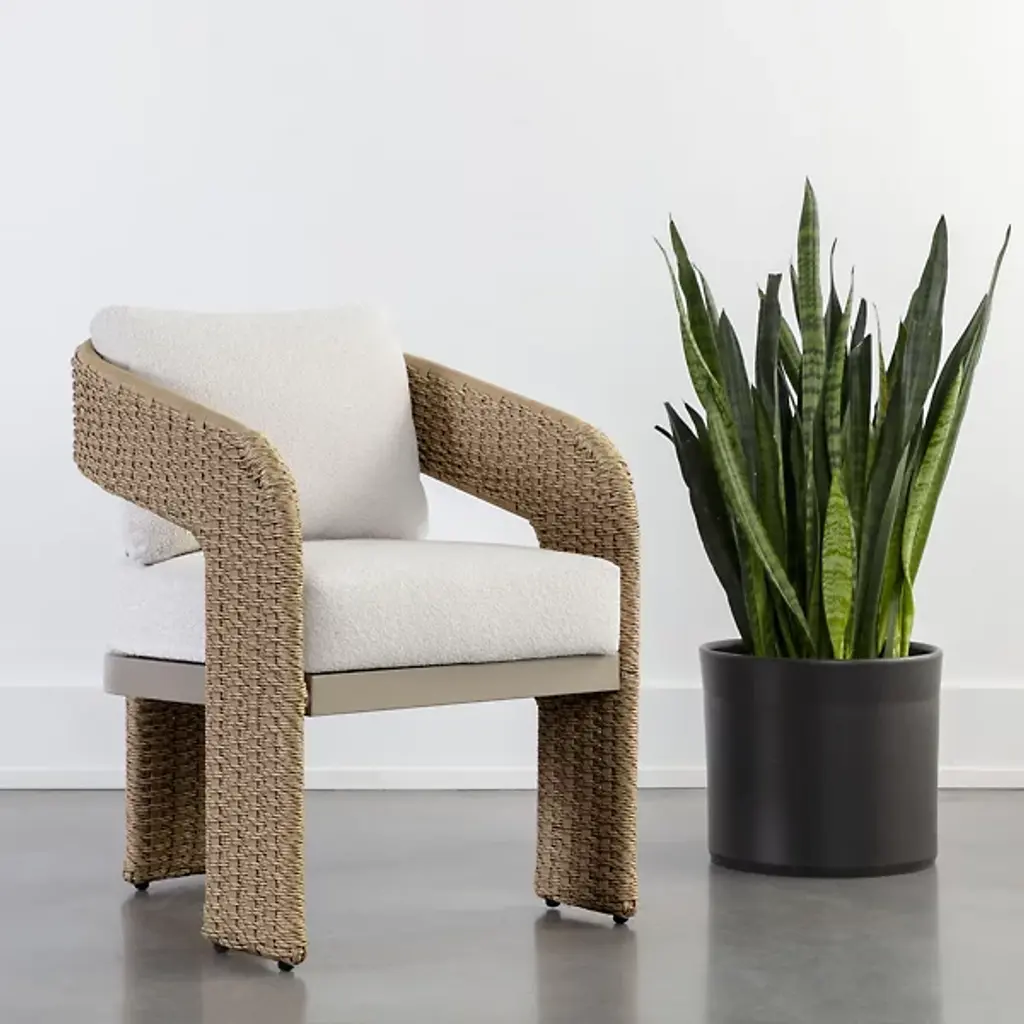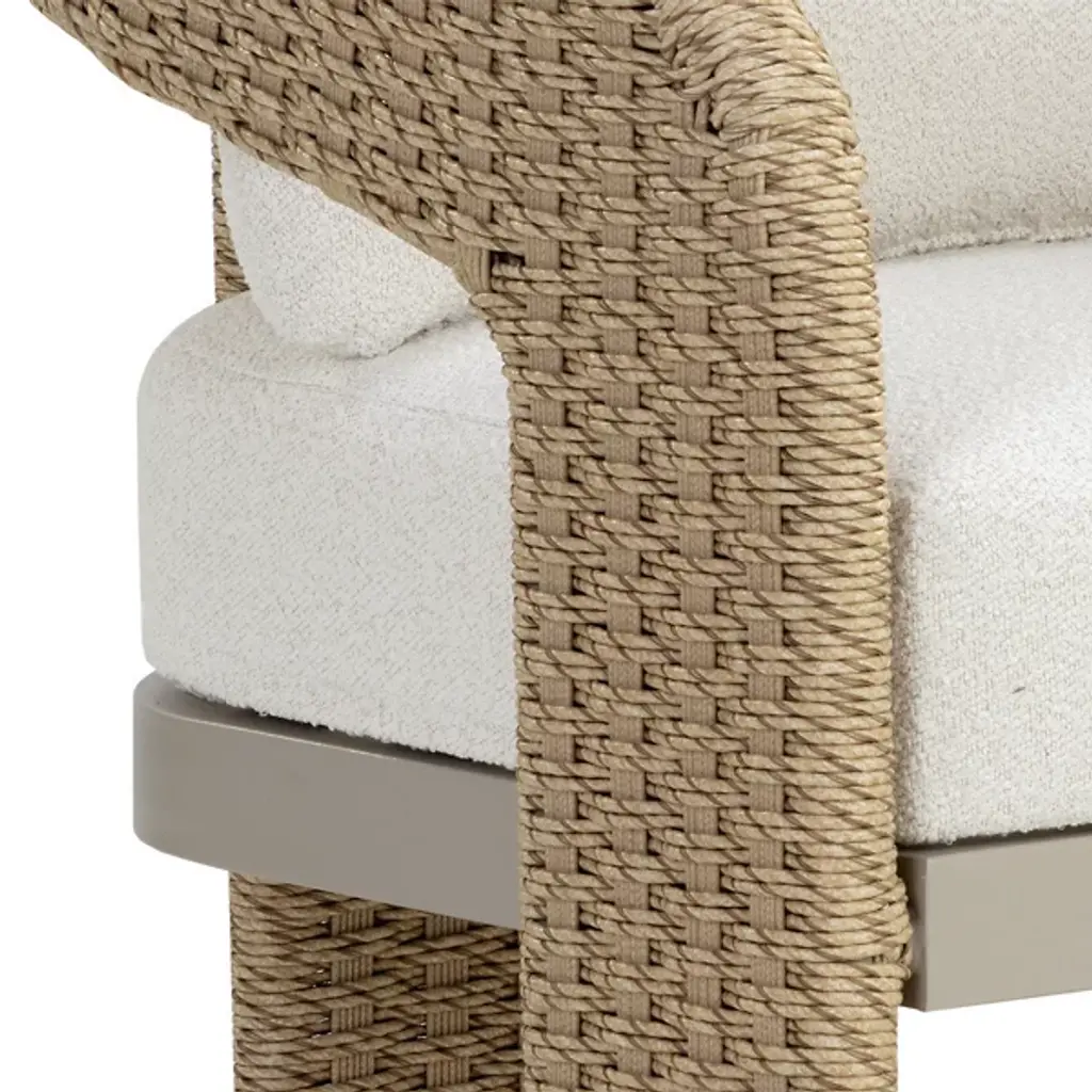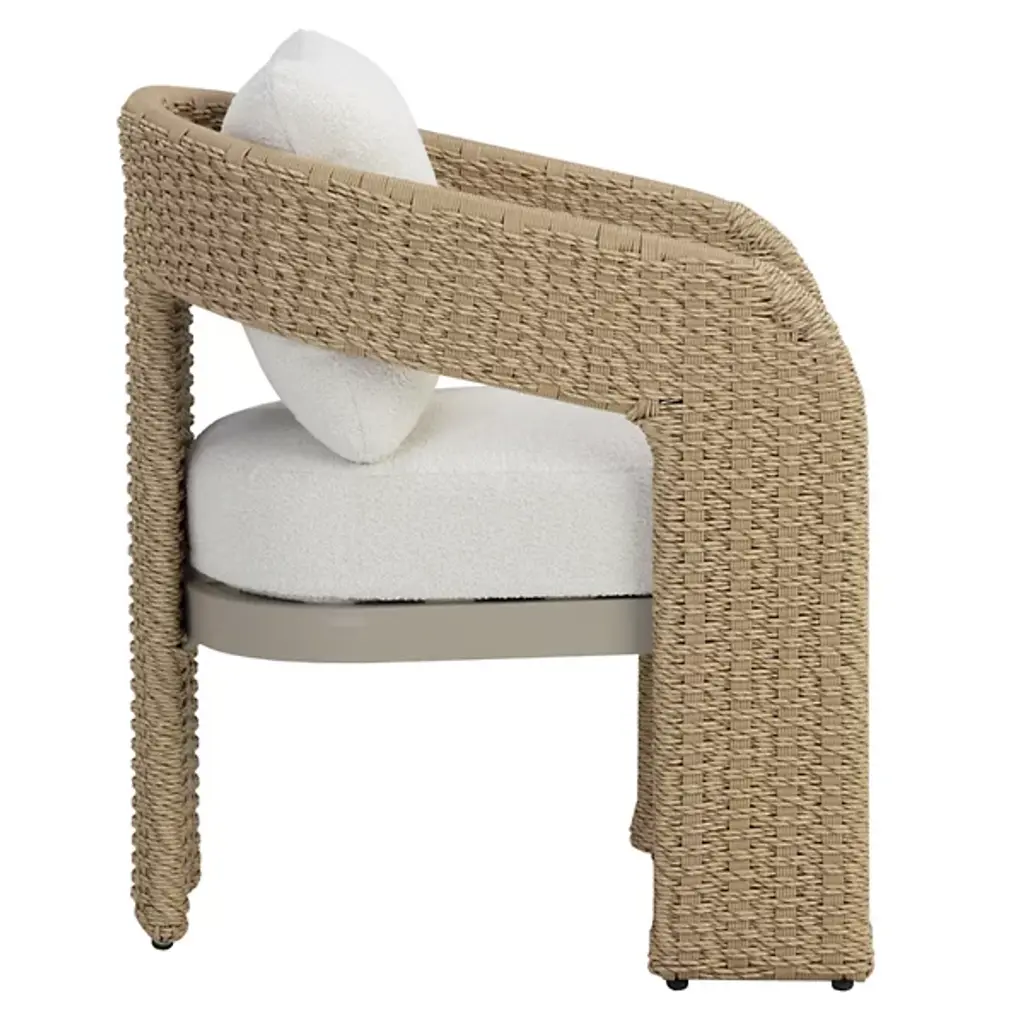 The Pylos Dining Armchair from Sunpan has geometric curves that create a striking focal point in any outdoor setting. Twisted wicker wraps around a sturdy aluminum frame, offering a textured, refined look. Soft cushions in recycled polyester Louis cream boucle fabric complete the design. Fade-resistant synthetic wicker, quick-dry, anti-microbial foam cushions ensure durability and easy maintenance. The aluminum frame is finished with Axalta Alesta powder coating and resists corrosion and weather.