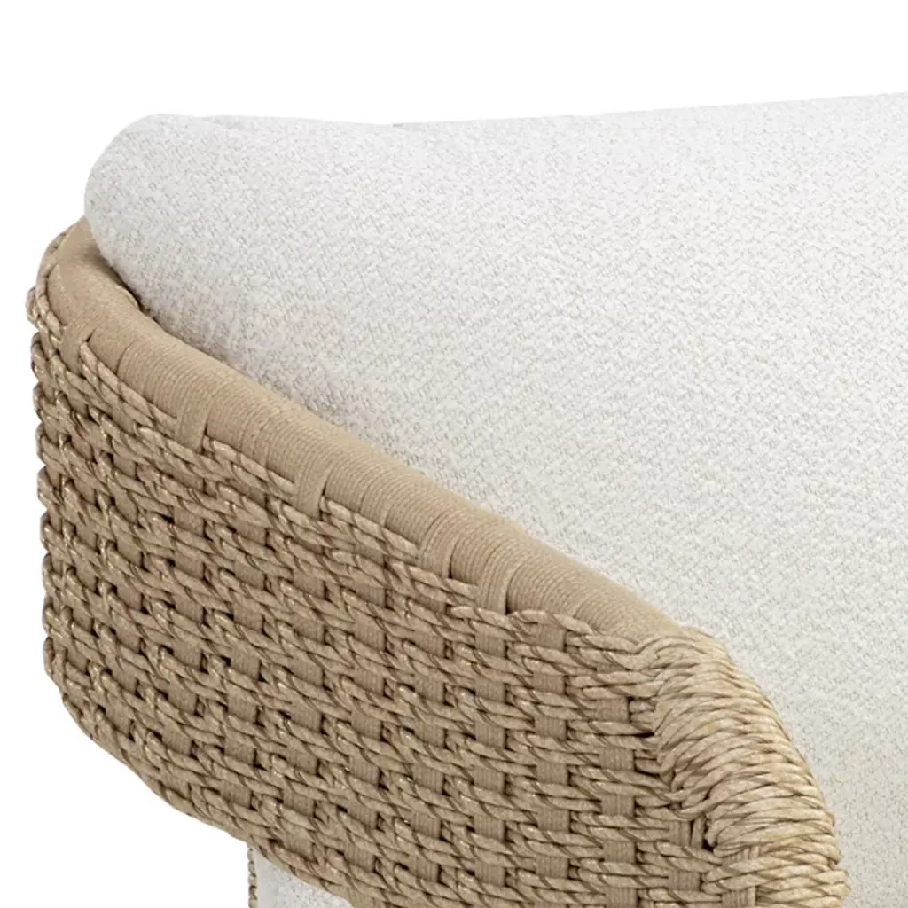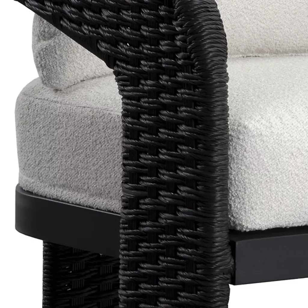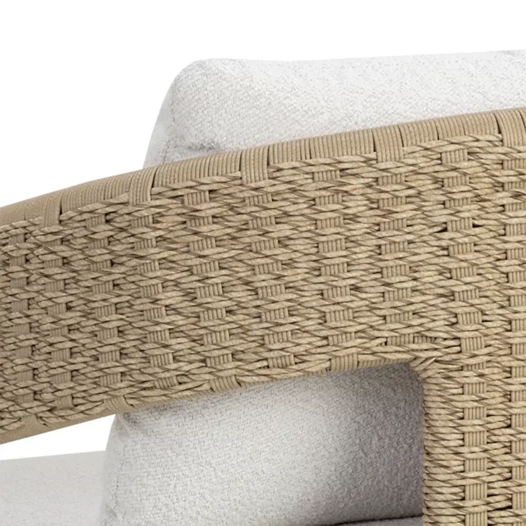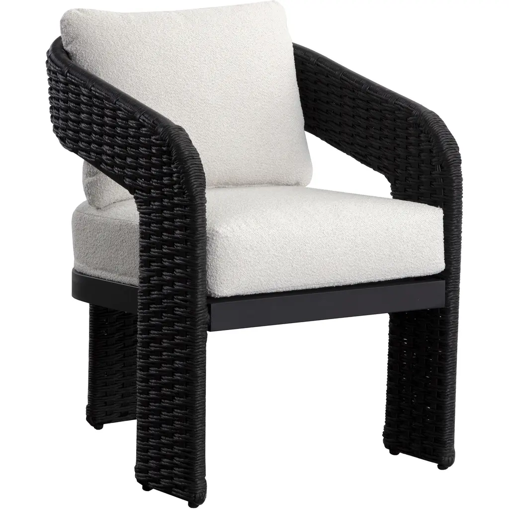 The Pylos Dining Armchair from Sunpan has geometric curves that create a striking focal point in any outdoor setting. Twisted wicker wraps around a sturdy aluminum frame, offering a textured, refined look. Soft cushions in recycled polyester Louis cream boucle fabric complete the design. Fade-resistant synthetic wicker, quick-dry, anti-microbial foam cushions ensure durability and easy maintenance. The aluminum frame is finished with Axalta Alesta powder coating and resists corrosion and weather.