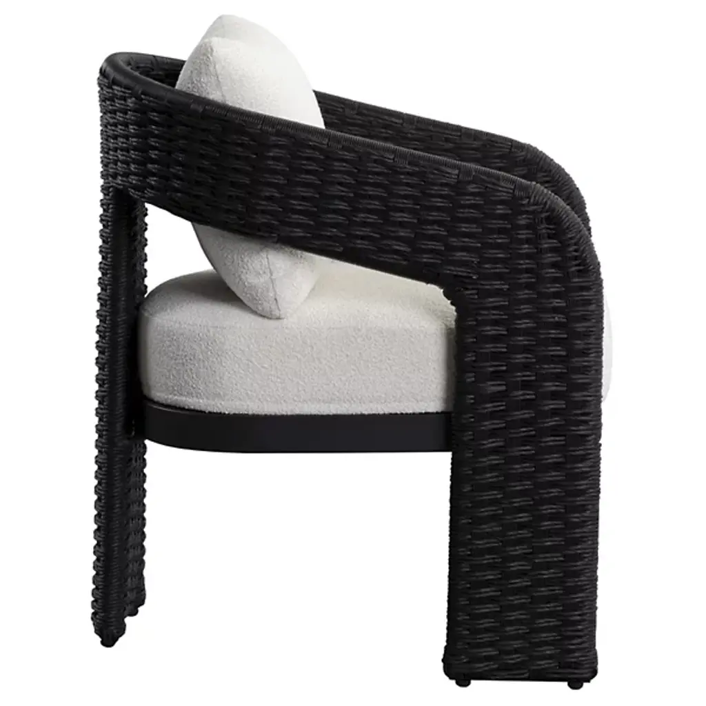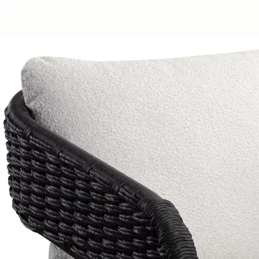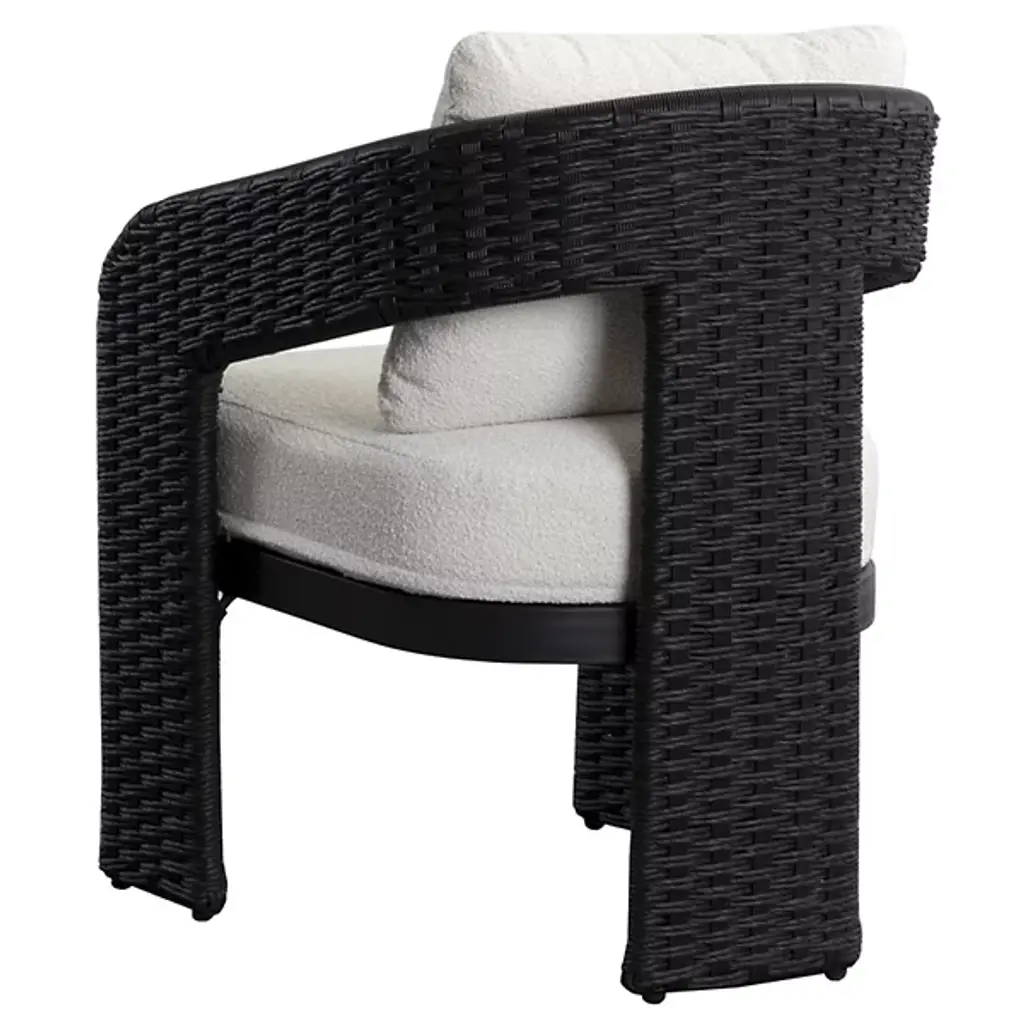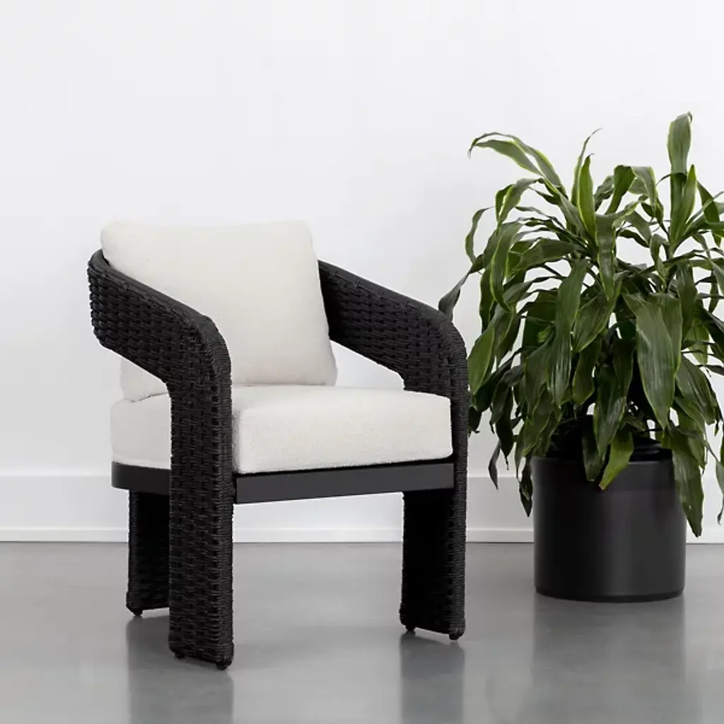 The Pylos Dining Armchair from Sunpan has geometric curves that create a striking focal point in any outdoor setting. Twisted wicker wraps around a sturdy aluminum frame, offering a textured, refined look. Soft cushions in recycled polyester Louis cream boucle fabric complete the design. Fade-resistant synthetic wicker, quick-dry, anti-microbial foam cushions ensure durability and easy maintenance. The aluminum frame is finished with Axalta Alesta powder coating and resists corrosion and weather.