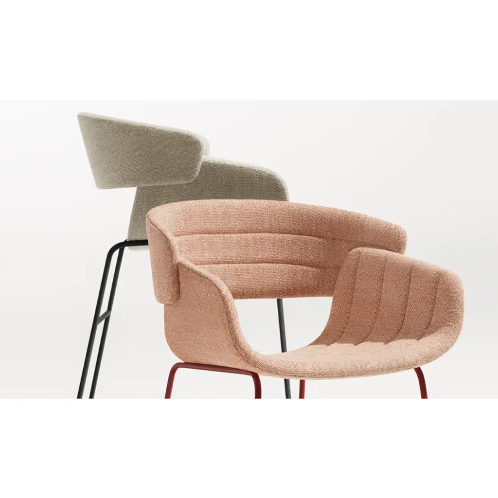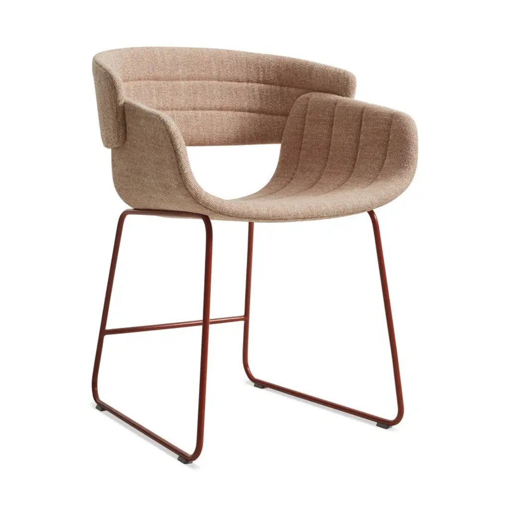 An upholstered seat and back work the curves and overlap just to create a chair that invites you to sit down and stay awhile. The channel stitch detail may not improve the aerodynamics but it sure does look swell. With a color-coordinated powder-coated steel sled base.