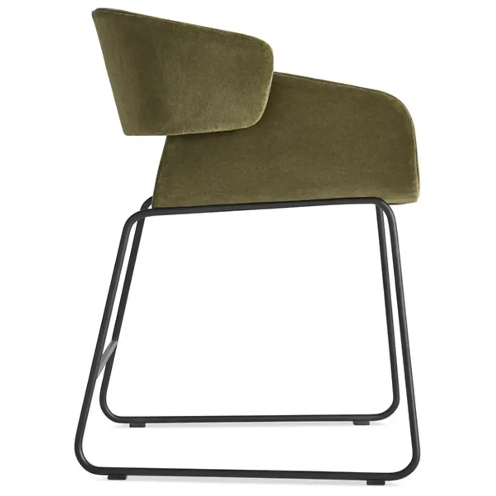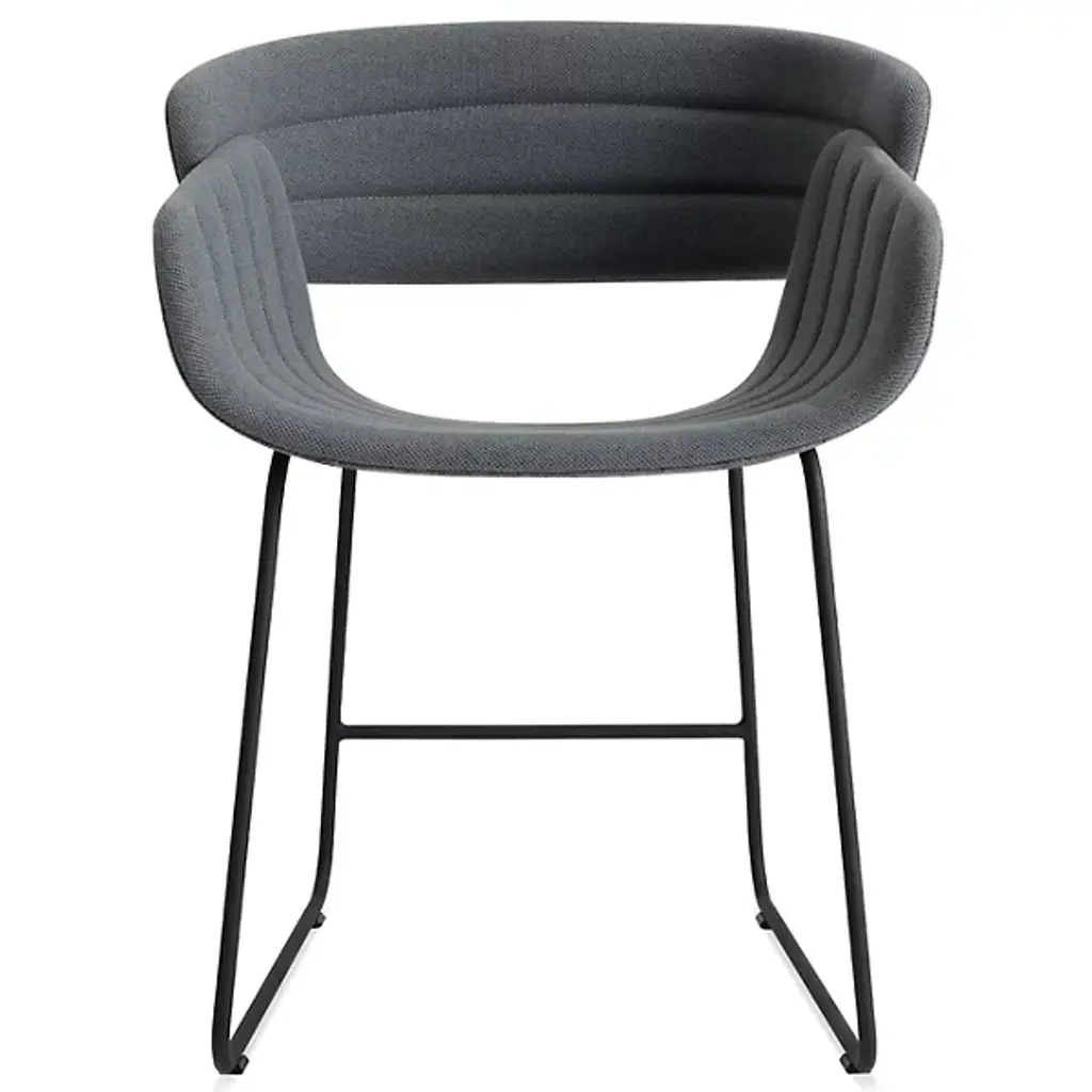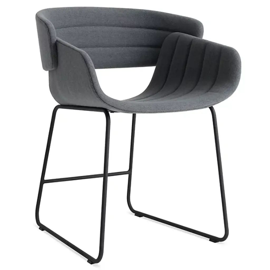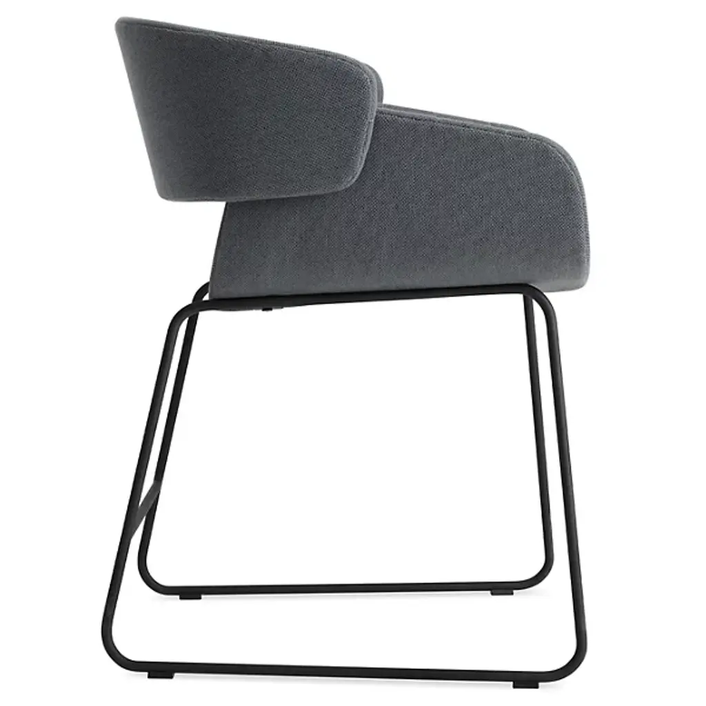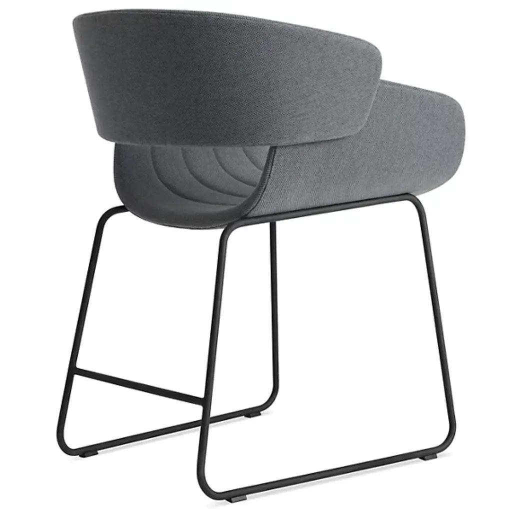 Clean, elegant, playful. The Racer Dining Chair from Blu Dot caresses your body like the bucket seat of an Italian supercar. It instantly catches your eye with a series of curves. Channel-stitched polyester applied to an overlapping back and seat rest flow from side to side with stylish flair. Filled with soft padding, the channel-stitched piece pleases as it wraps around one’s figure for a nestled feel. A minimalist steel base gives the soft polyester seat the appearance as if floating in the air. In a sled design, the base draws an eye-catching pair of graphic shapes.
